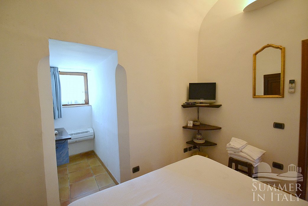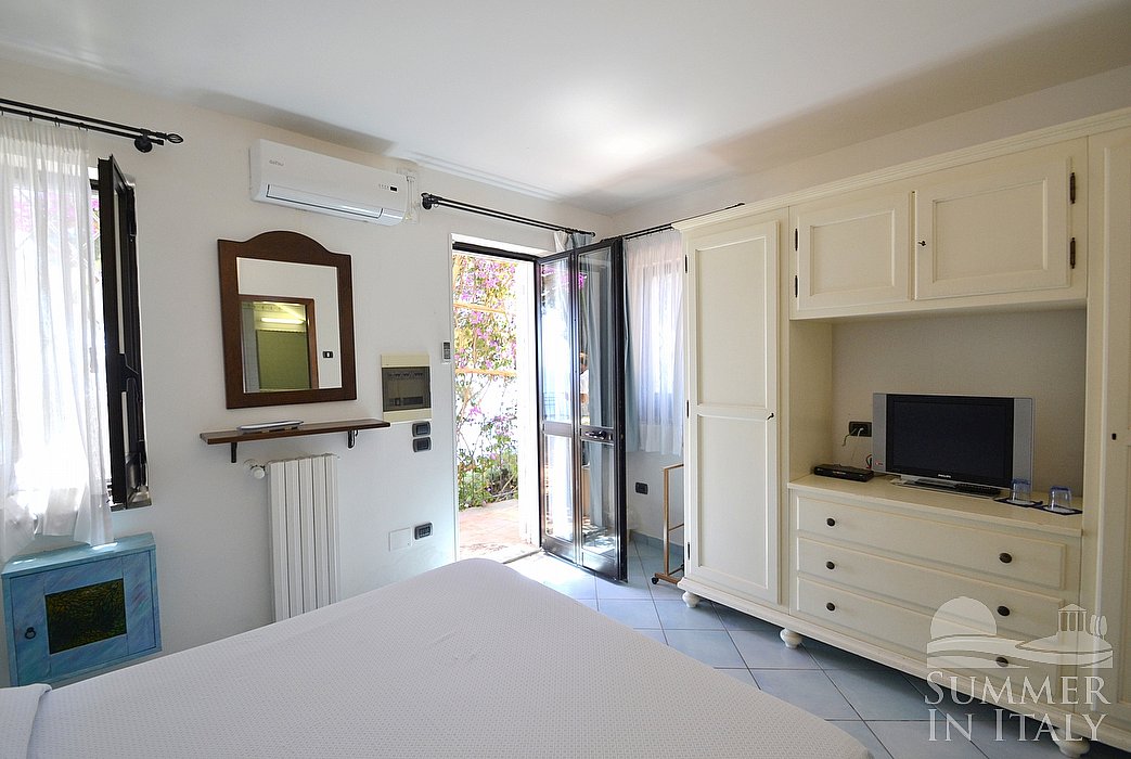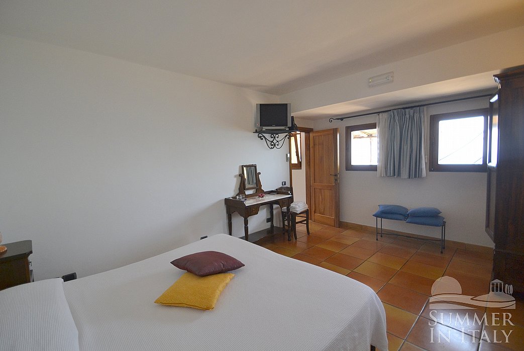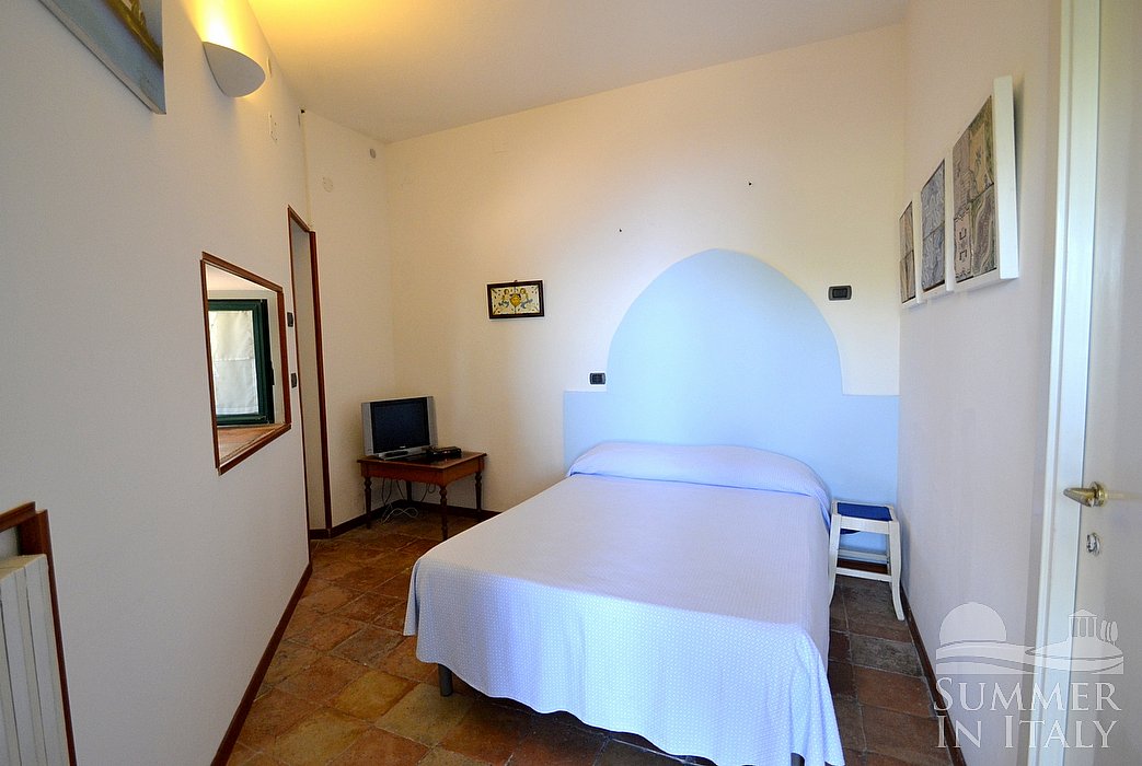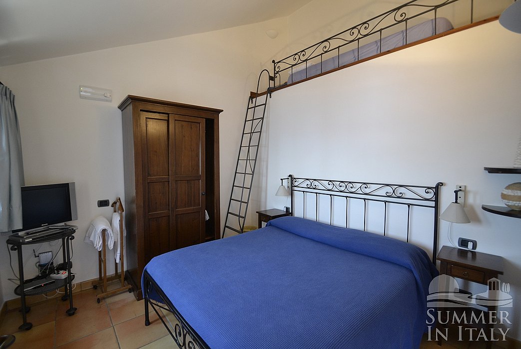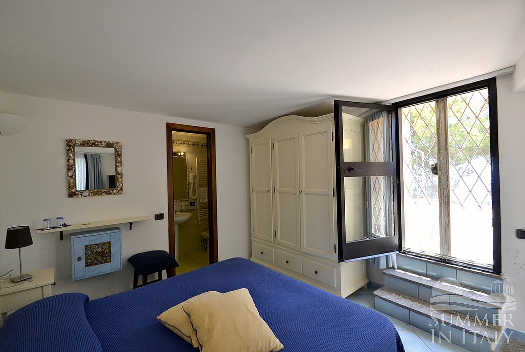 This suite is made up by three interconnected rooms: a sleeping area, a sitting area and a bathroom. You will be able to enter the tenth bedroom from the through an external access. The bedroom has a matrimonial bed (160 cm/62 inches, wider than a queen-size bed). Two additional single trundle beds are available (if requested in advance) to make it a quadruple room. In this room you will find a satellite television (local channels). From the bedroom you will be able to enter the small terrace with a view of the sea and of the coastline through a French door. The room also has a window with a view of the sea. The bedroom is equipped with an air conditioning/heating unit. This bedroom has an en-suite bathroom, equipped with a washbasin, a toilet, a fully enclosed shower and a hairdryer.