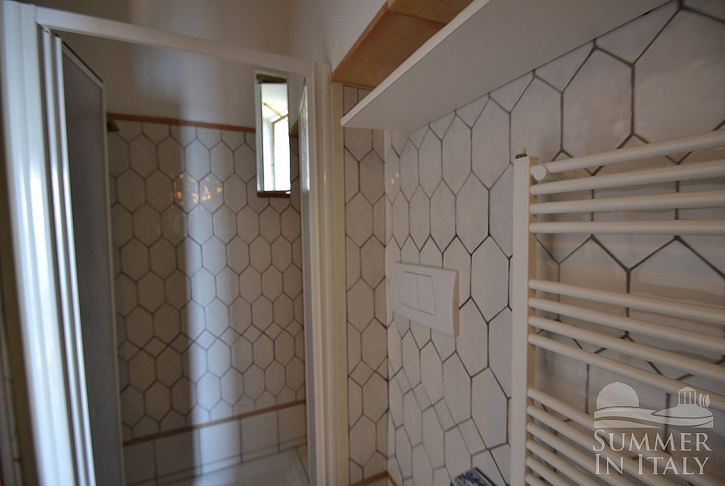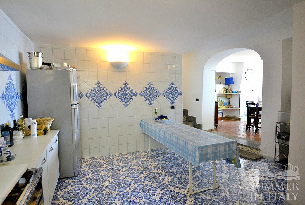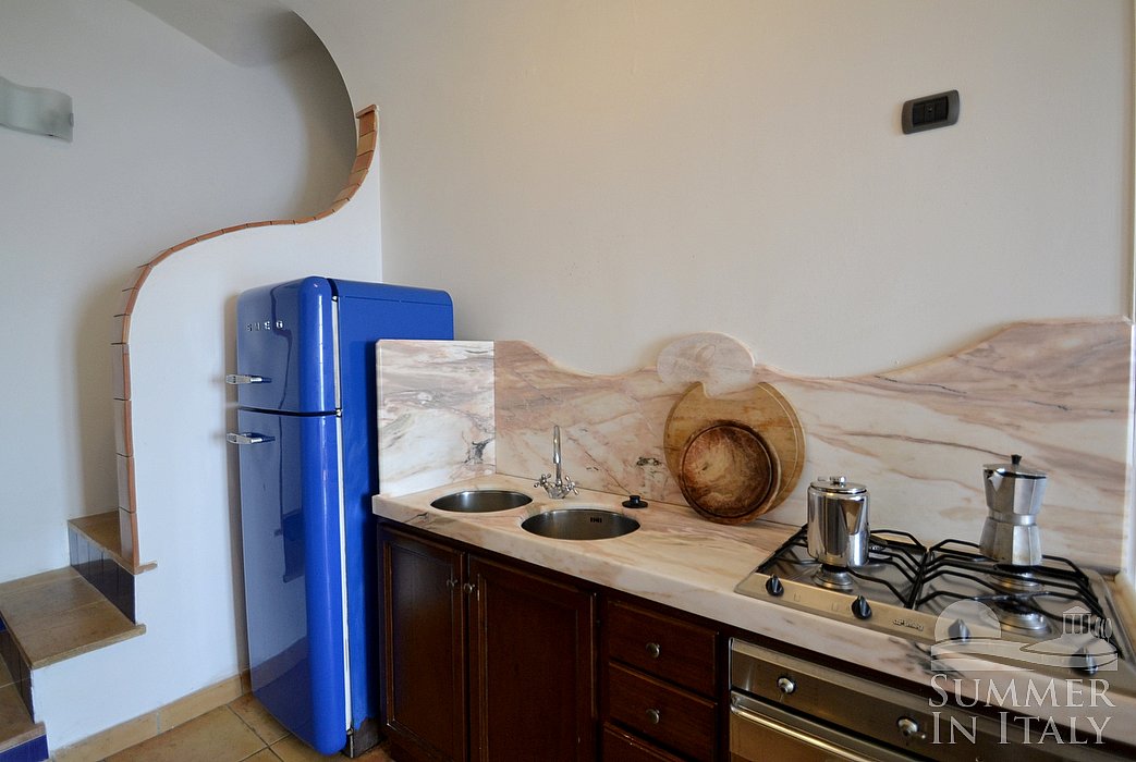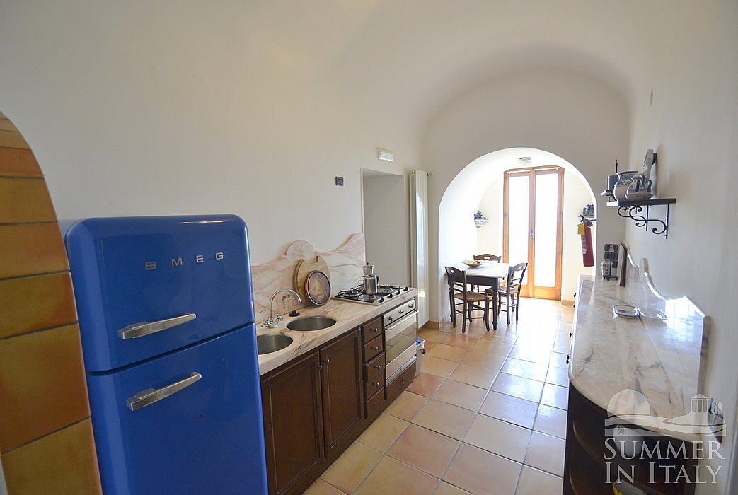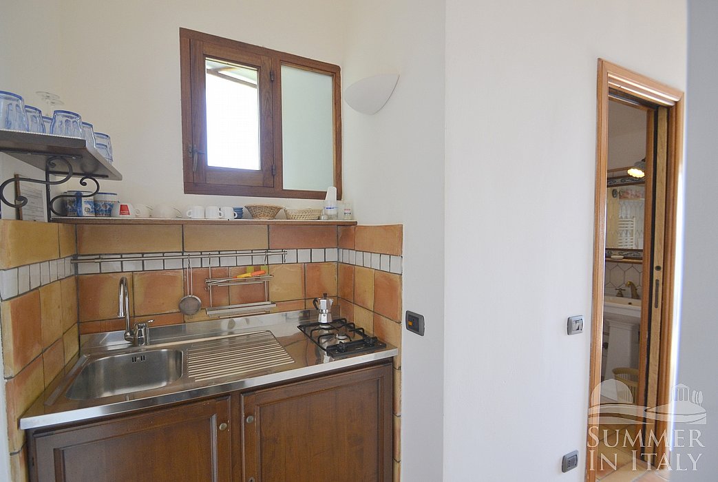 The first kitchen is equipped with a four-burner gas cooker, an electric oven, a refrigerator with freezer, a microwave oven, an Italian-style coffee-maker and an American-style coffee-maker (bring your filters!). There is a table to seat six guests. From the kitchen a French door will take you to a first patio and the garden with a view of the sea. The room has a window with a view of the sea.