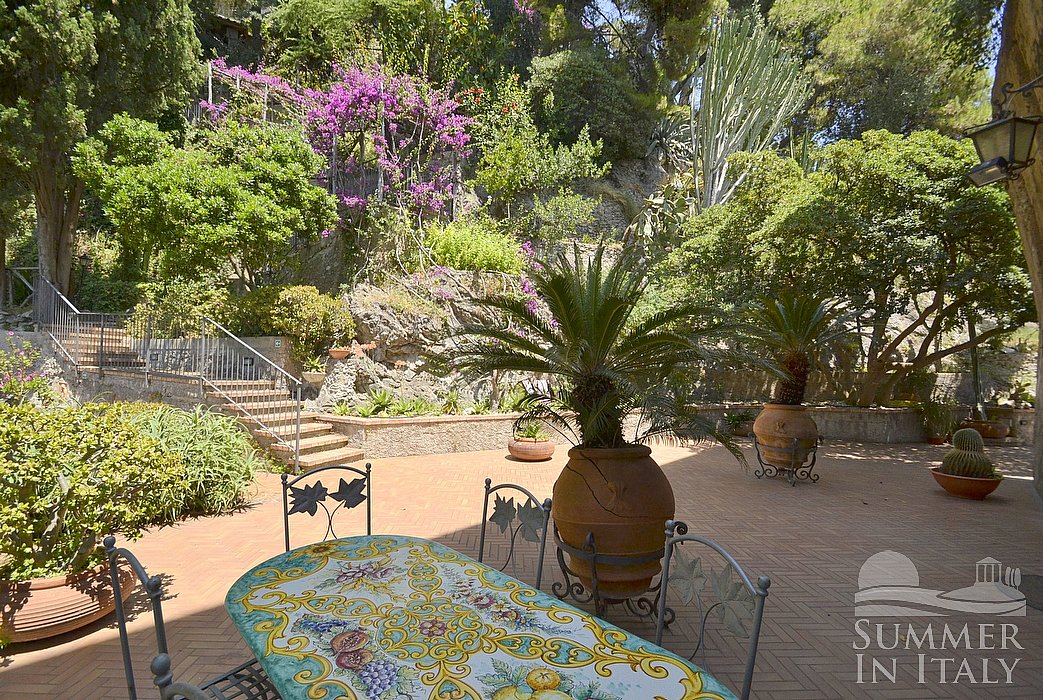 The garden is 10000 square meters (108000 square feet) large. It features a Jacuzzi pool with hydromassage (2 by 2 meters, 6.5 by 6.5 feet). The garden is partly shaded by trees. It is equipped with tables, chairs, sun umbrellas, deck chairs, sun loungers, a swing, hammocks and external showers. Here you will also find a brickwork barbecue and a wood-fired pizza oven. From the garden you will enjoy a wonderful view of the sea and of the coast of Amalfi.