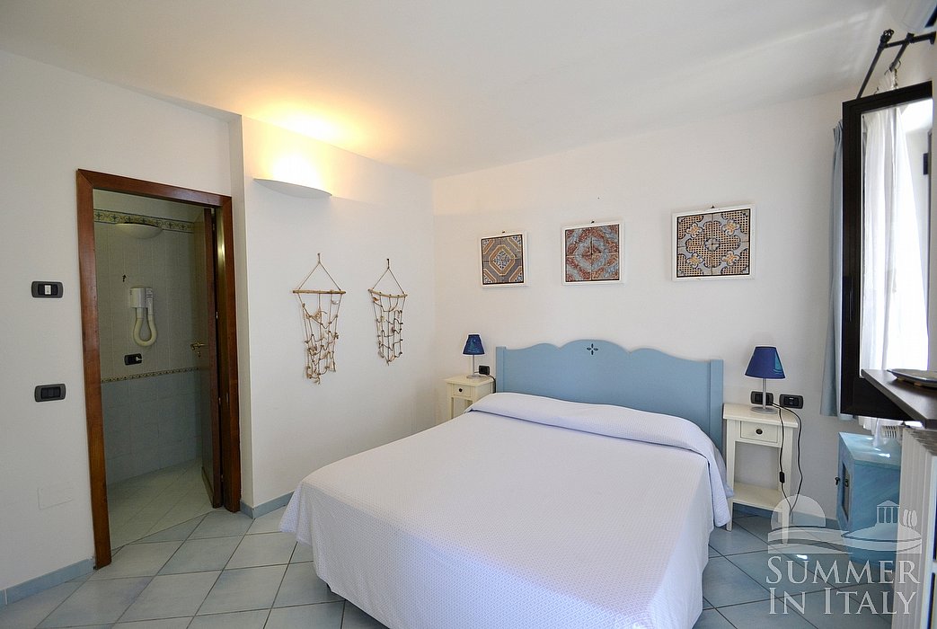 This suite is made up by three interconnected rooms: a sleeping area, a sitting area and a bathroom. You will be able to enter the nineth bedroom from the through an external access. The bedroom has a matrimonial bed (160 cm/62 inches, wider than a queen-size bed). In this room you will find a satellite television (local channels). From the bedroom you will be able to enter the small terrace with a view of the sea and of the coastline through a French door. The room also has a window with a view of the sea. The bedroom is equipped with an air conditioning/heating unit. This bedroom has an en-suite bathroom, equipped with a washbasin, a toilet, a fully enclosed shower and a hairdryer.