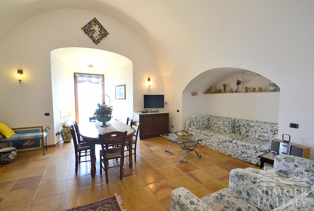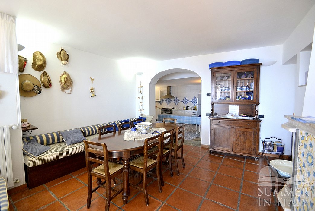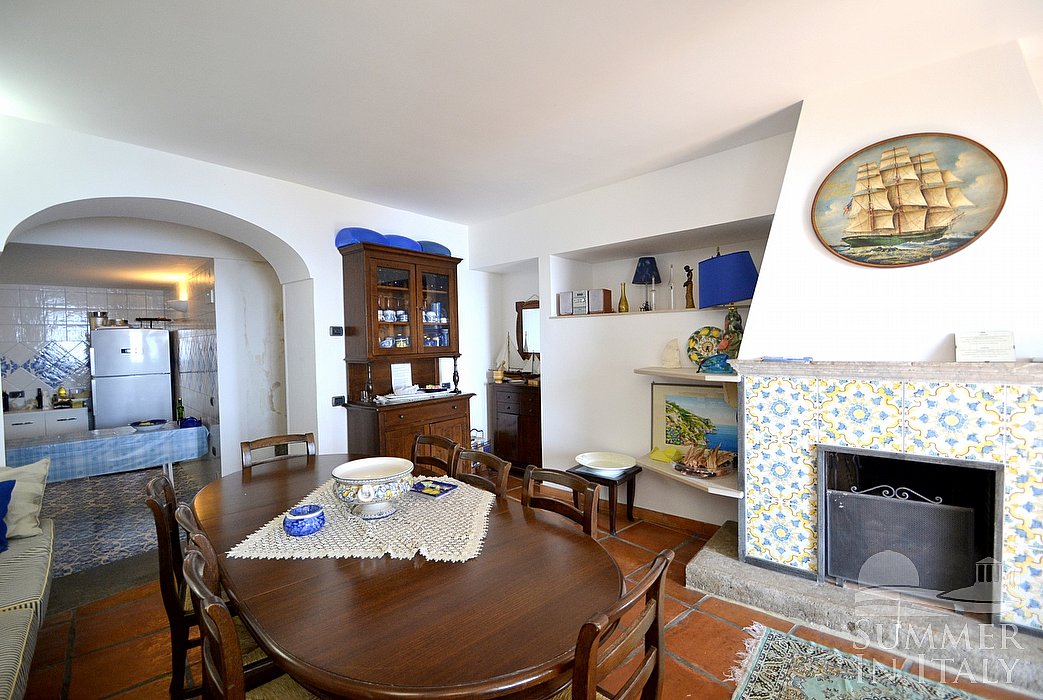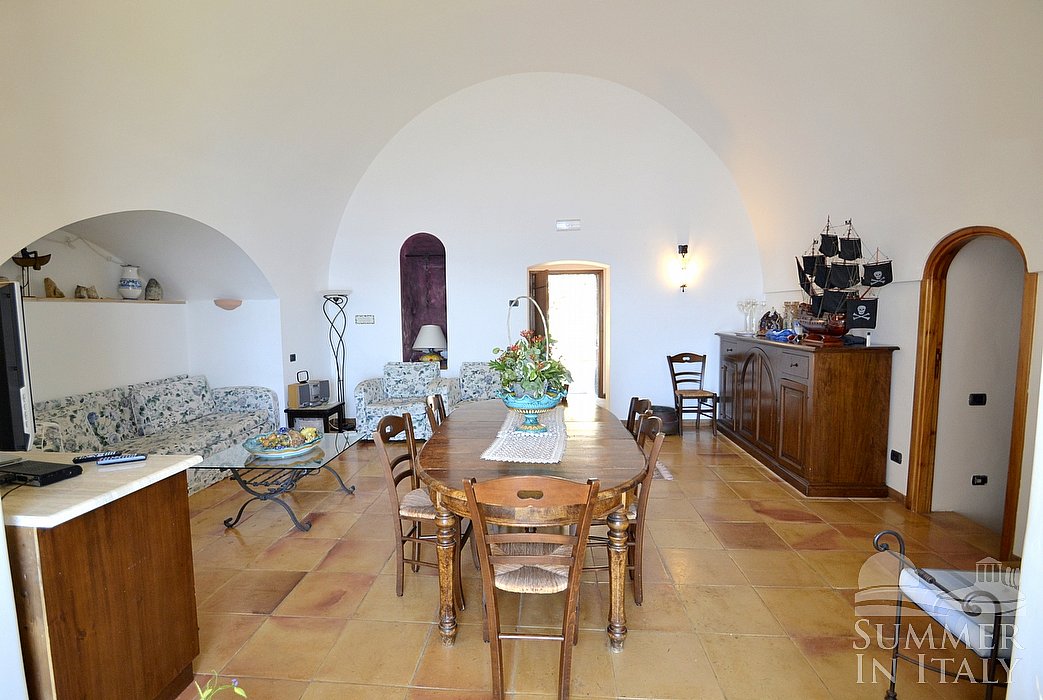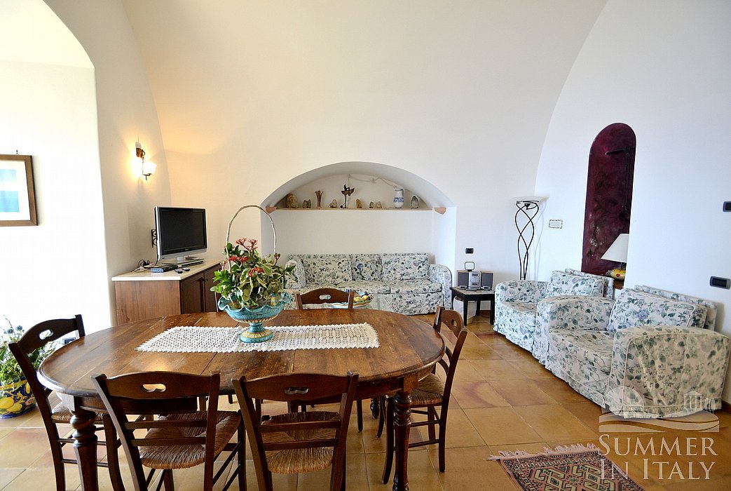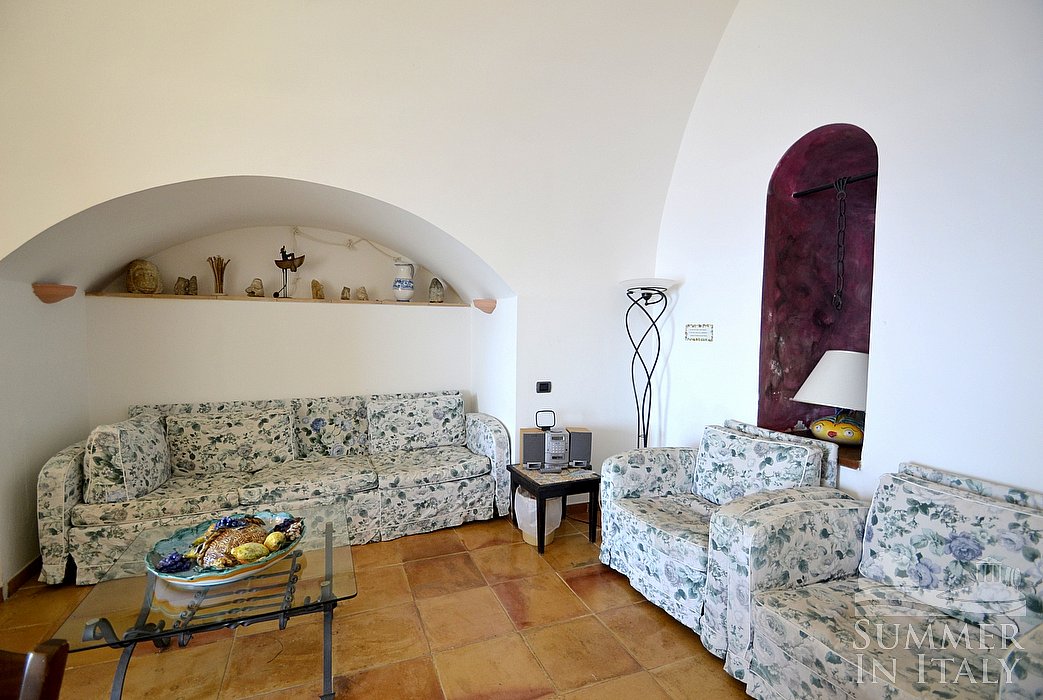 The first living room is paved with terracotta tiles. The ceiling is vaulted. The furnishings are elegant and refined, and include some antique pieces. The furnishings include two sofas and two armchairs. There is an age-old fireplace decorated with age-old majolica tiles. The dining table can accommodate ten guests. In this room you will find a satellite television (local channels), a DVD player and a CD player. From the living room you will be able to enter the first patio and the garden through a French door. The room has a large panoramic window with a view of the sea.
