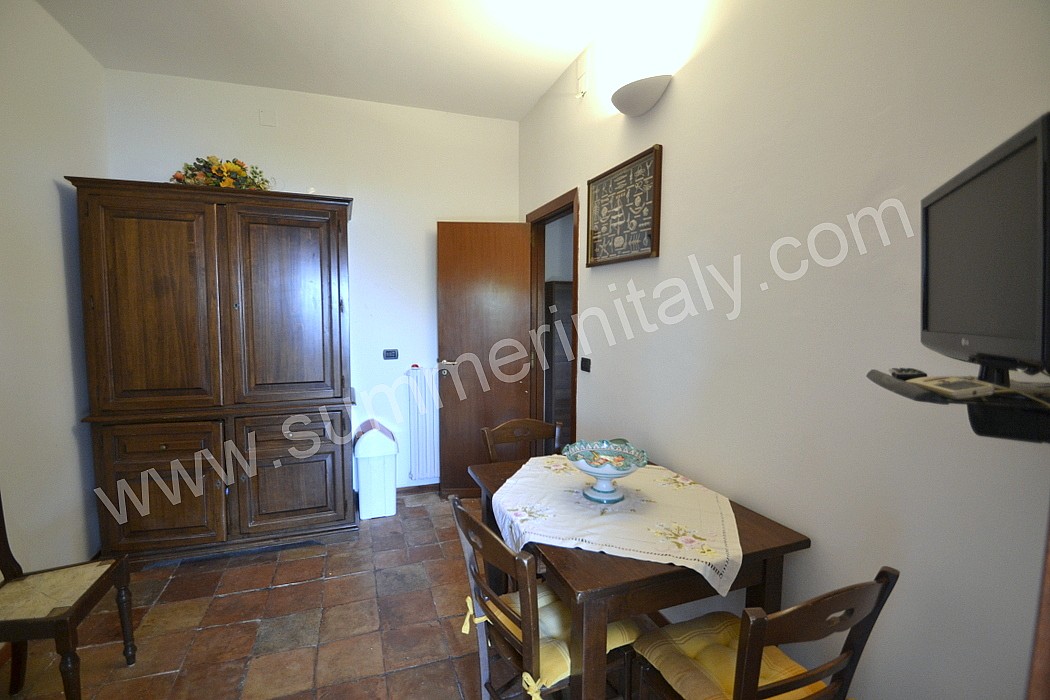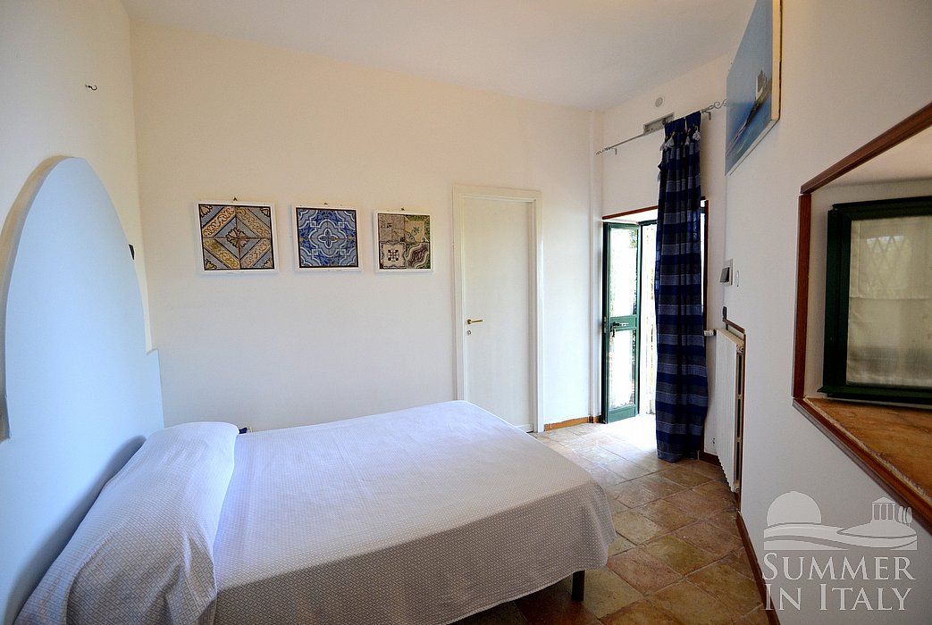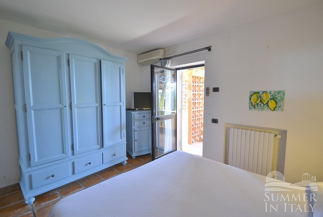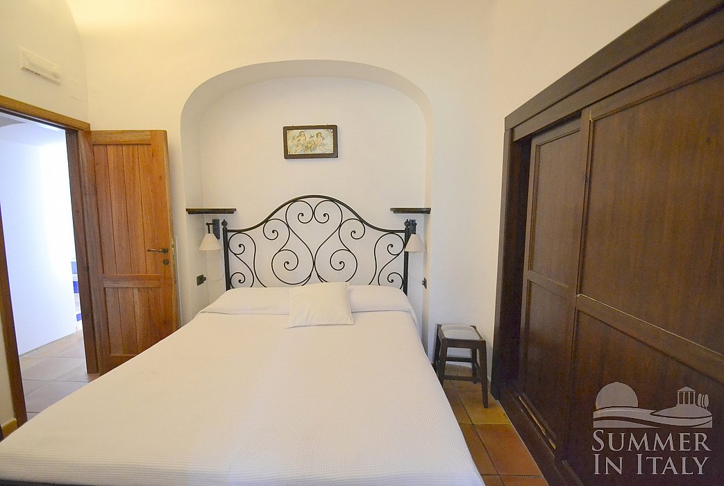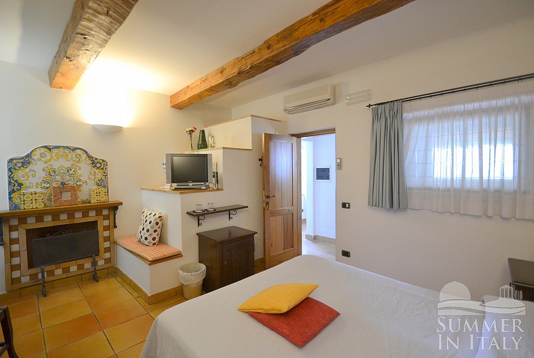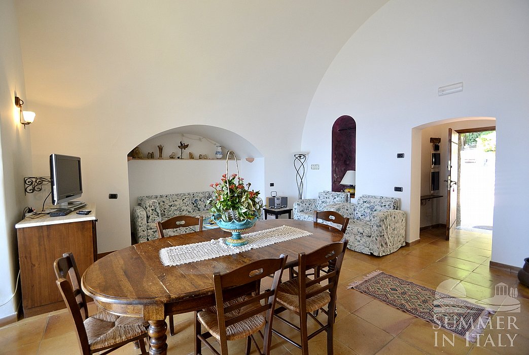 The first living room is paved with terracotta tiles. The ceiling is vaulted. The furnishings are elegant and refined, and include some antique pieces. The furnishings include two sofas and two armchairs. There is an age-old fireplace decorated with age-old majolica tiles. The dining table can accommodate ten guests. In this room you will find a satellite television (local channels), a DVD player and a CD player. From the living room you will be able to enter the first patio and the garden through a French door. The room has a large panoramic window with a view of the sea.