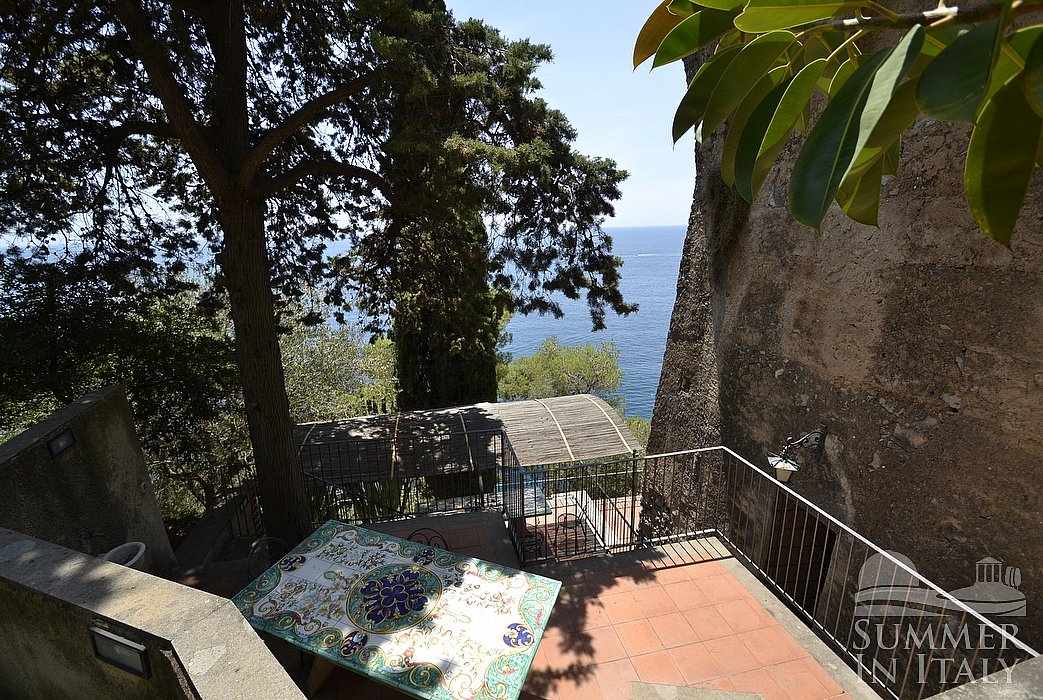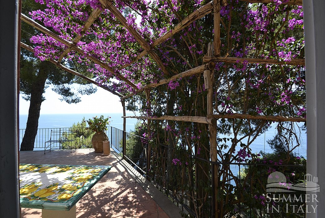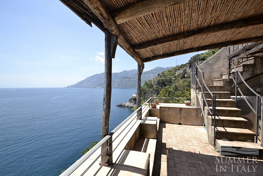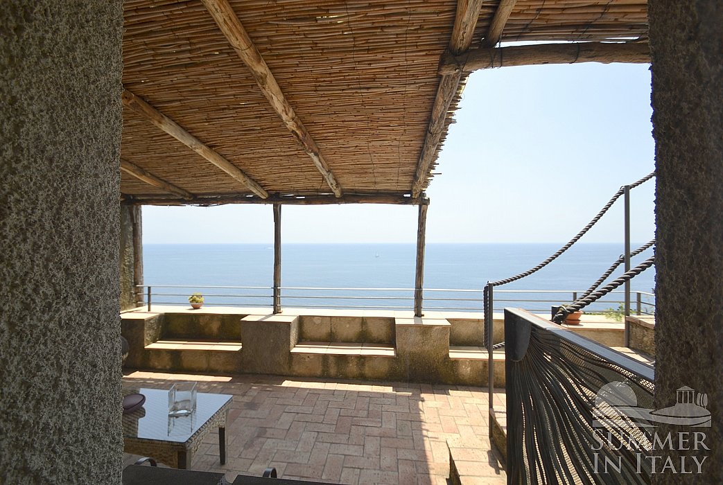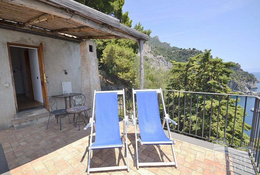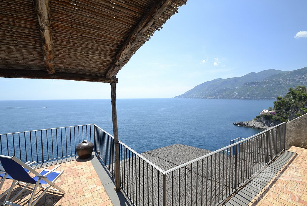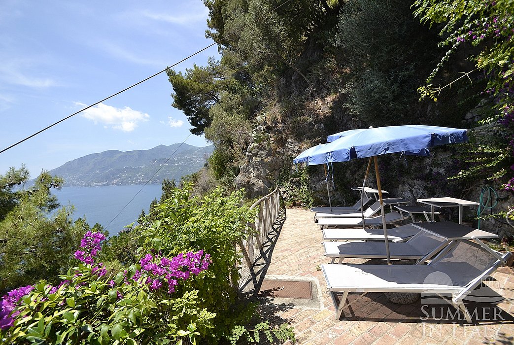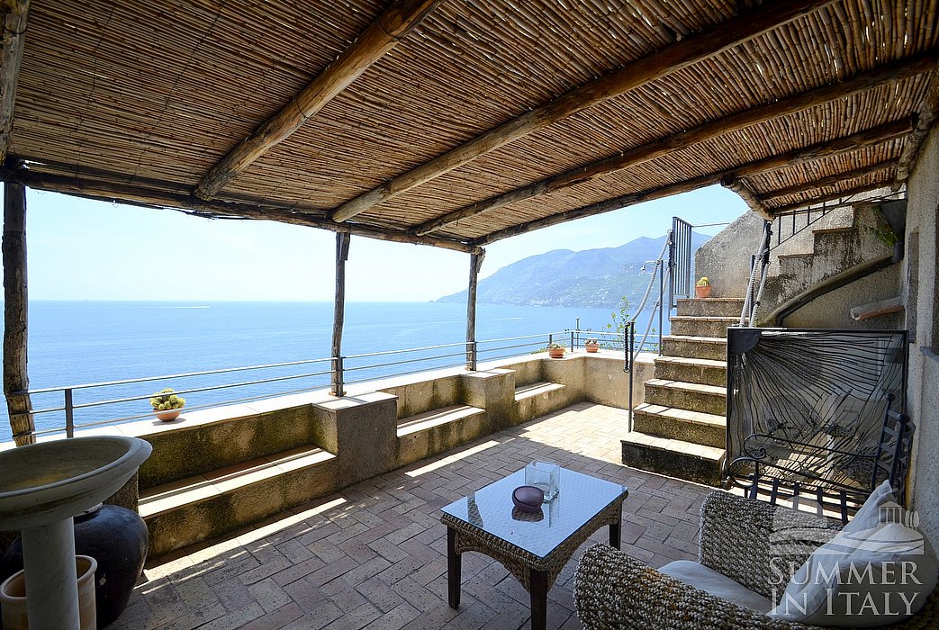 The second terrace is 20 square meters (215 square feet) large. You will reach it from the living room going up an external stairway which consists of approximately 30 steps. It is partly shaded by a pergola with a bamboo roof. It is equipped with two sun loungers. From the terrace you will enjoy a breathtaking view of the sea and of the coast of Amalfi.