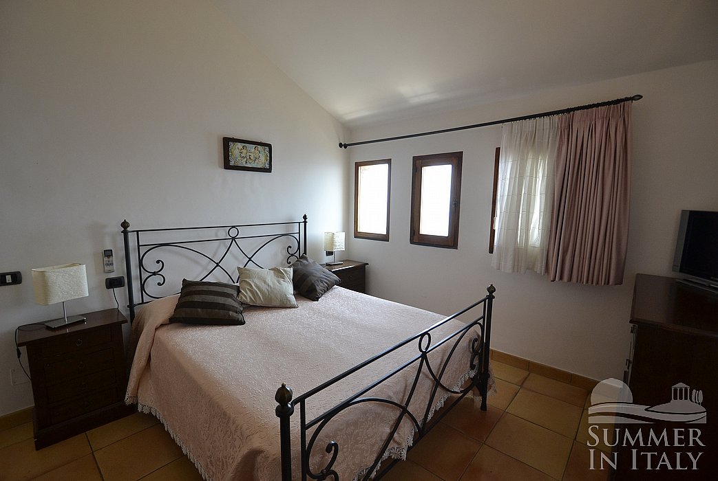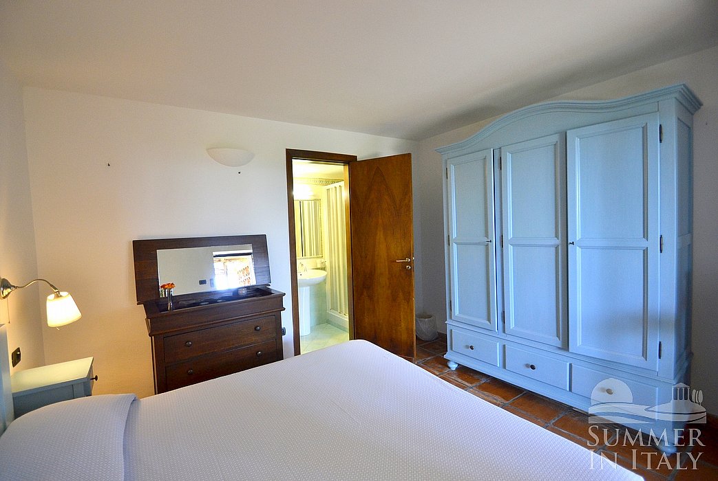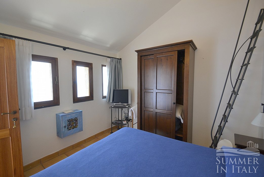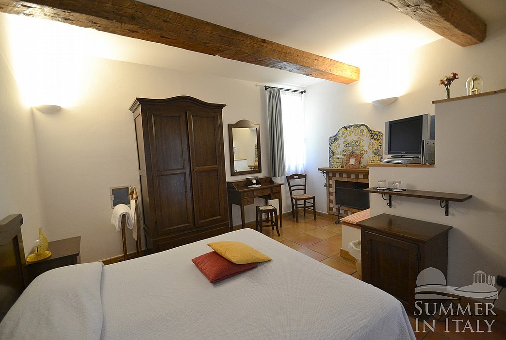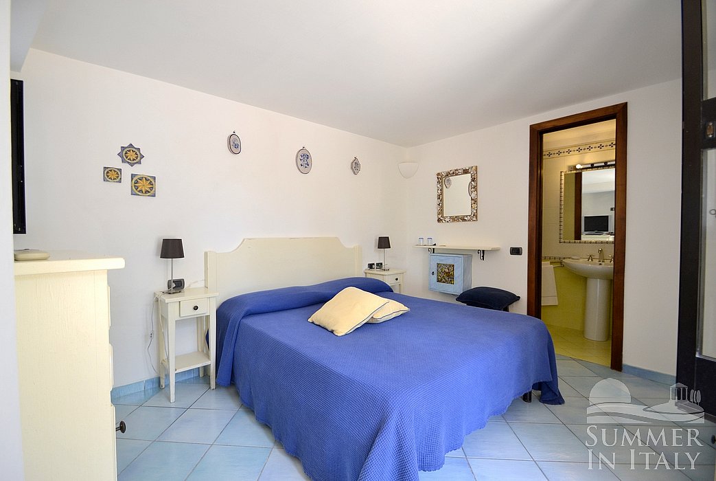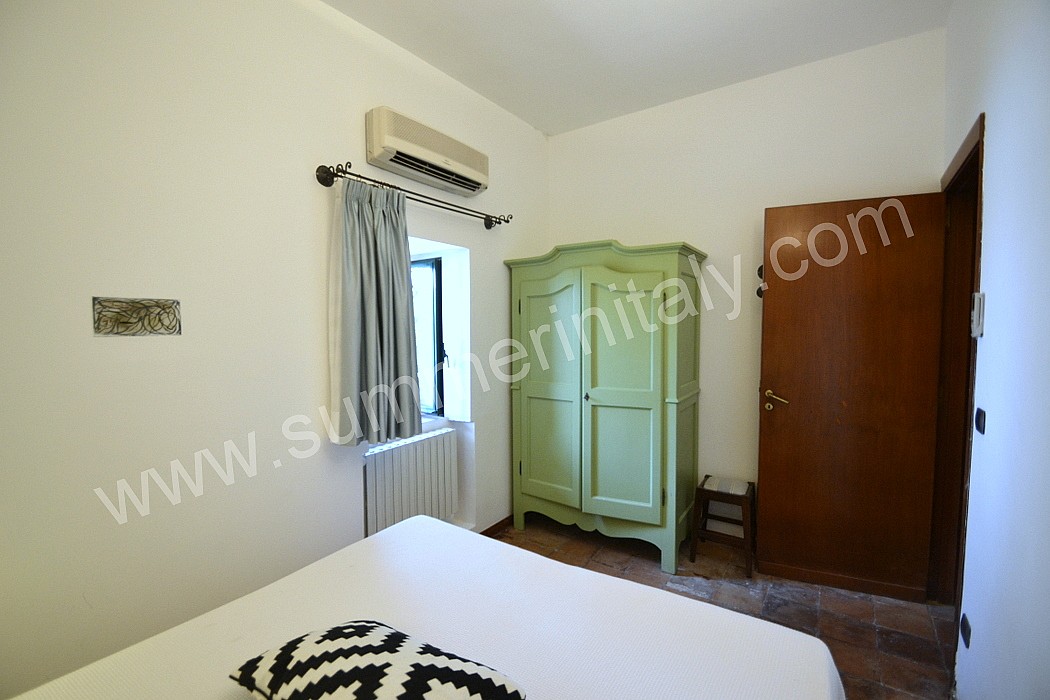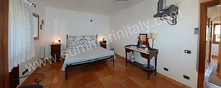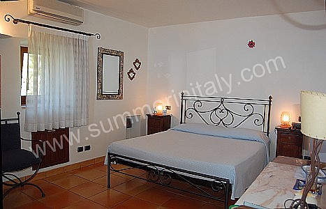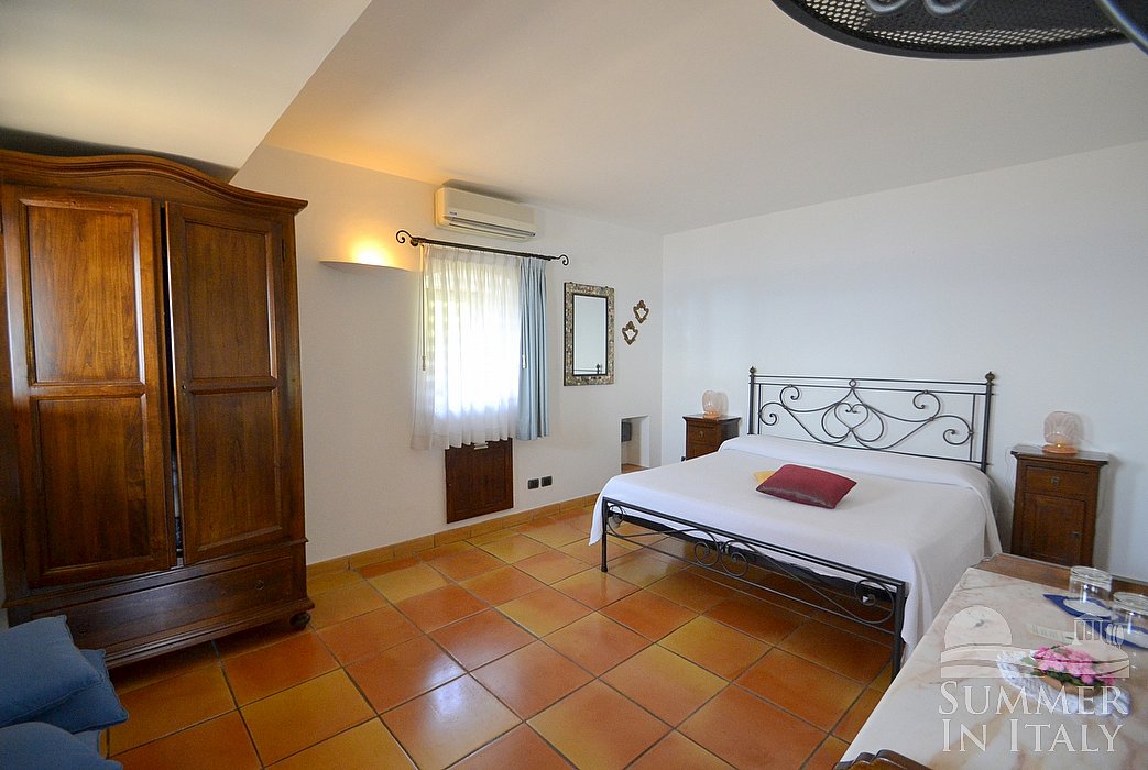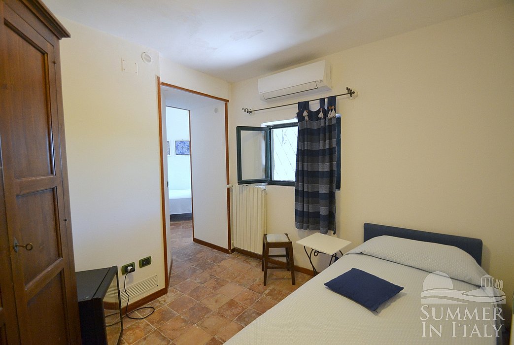 This suite is made up by three interconnected rooms: a sleeping area, a sitting area and a bathroom. You will be able to enter the tenth bedroom from the through an external access. The bedroom has a matrimonial bed (160 cm/62 inches, wider than a queen-size bed). Two additional single trundle beds are available (if requested in advance) to make it a quadruple room. In this room you will find a satellite television (local channels). From the bedroom you will be able to enter the small terrace through a French door. The room also has a window with a view of the sea and of the coastline. The bedroom is equipped with an air conditioning/heating unit. This bedroom has an en-suite bathroom, equipped with a washbasin, a toilet, a fully enclosed shower and a hairdryer.