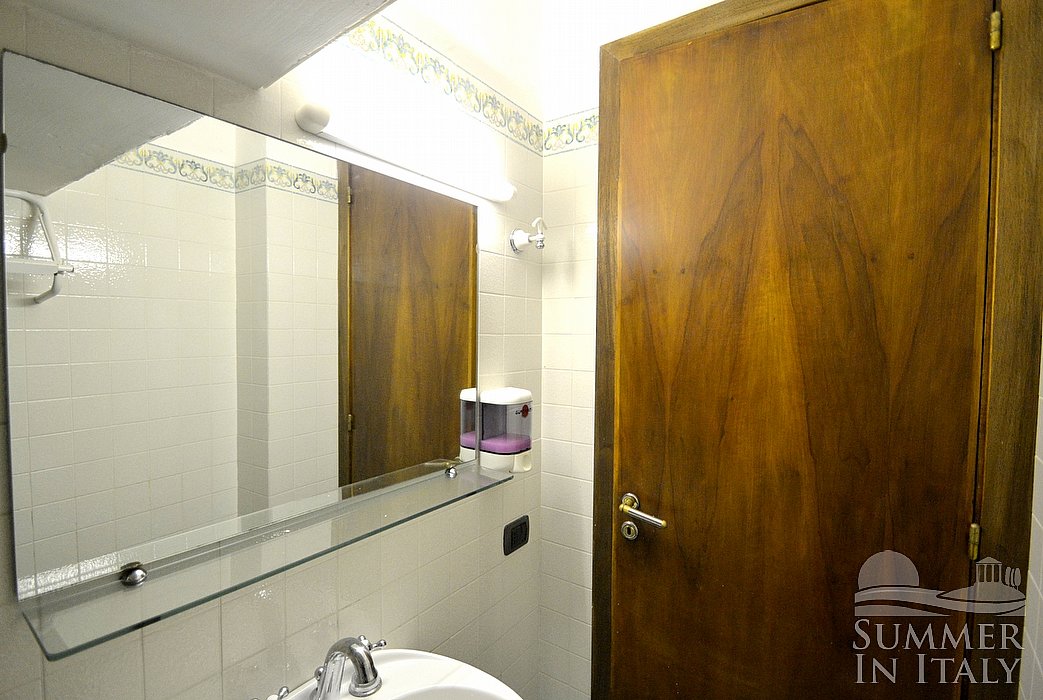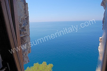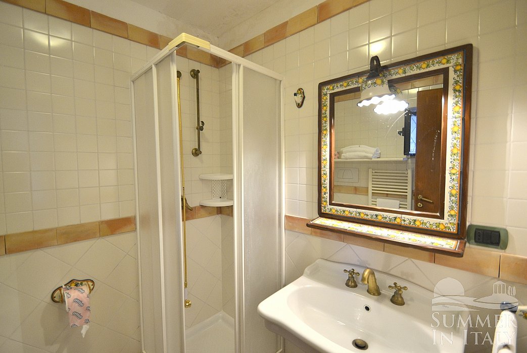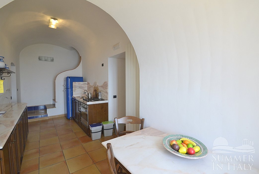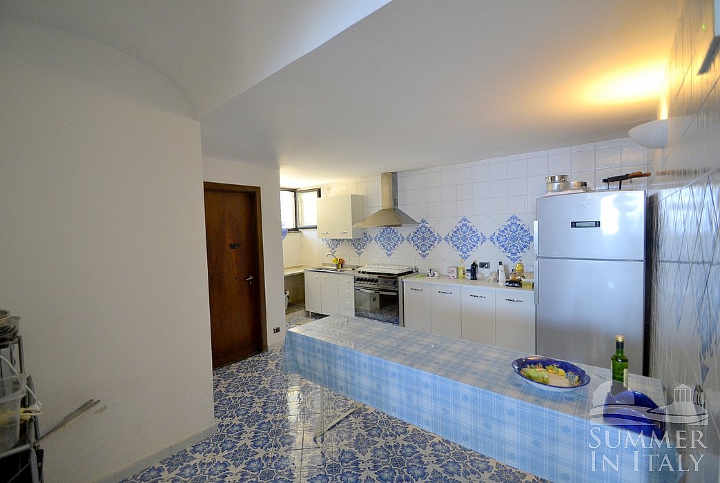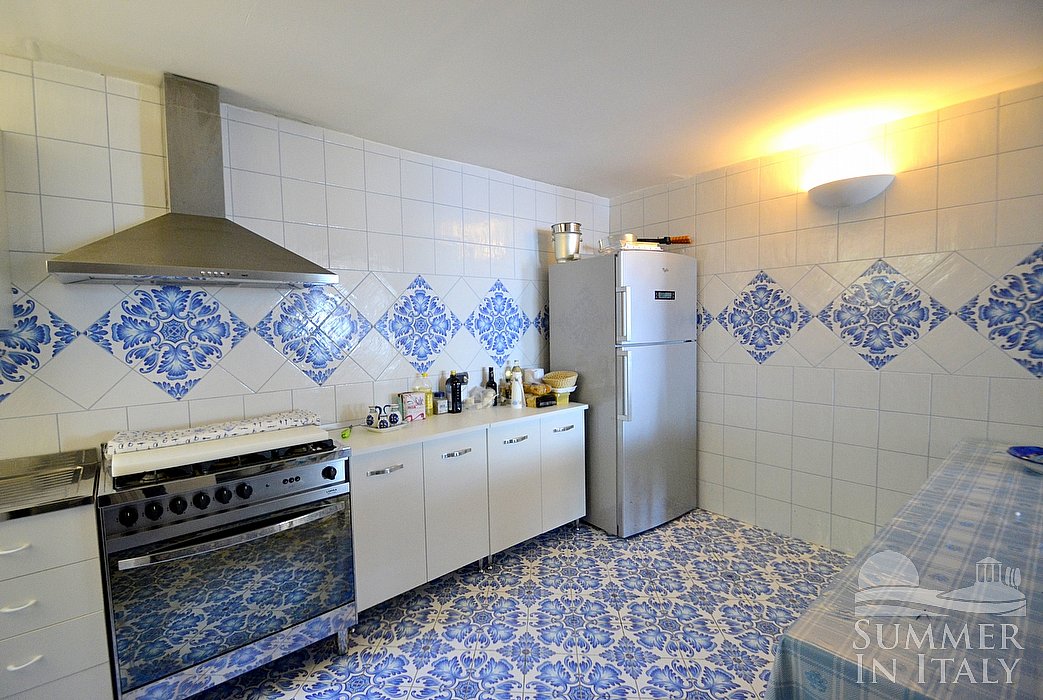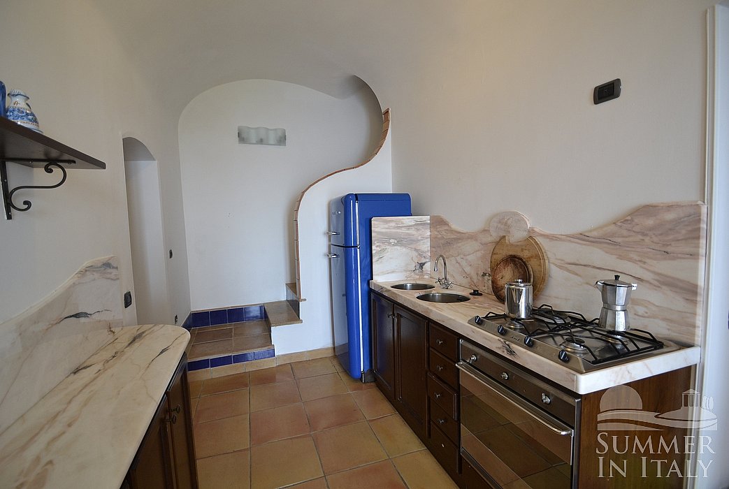 The first kitchen is equipped with a four-burner gas cooker, an electric oven, a refrigerator with freezer, a microwave oven, an Italian-style coffee-maker and an American-style coffee-maker (bring your filters!). There is a table to seat six guests. From the kitchen a French door will take you to a first patio and the garden with a view of the sea. The room has a window with a view of the sea.