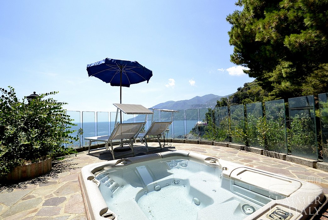 The swimming pool is 4.5 meters (14.8 feet) large by 8 meters (26 feet) long, from 1.10 meter (3.60 feet) to 1.90 meters (6.2 feet) deep. The swimming pool can be covered by a telescopic pool enclosure. The swimming pool area is equipped with tables, chairs, sun umbrellas, deck chairs, sun loungers, a swing, hammocks and external showers. By the pool you will also find a bathroom which is equipped with a washbasin and a toilet. From the swimming pool you will enjoy an enchanting view of the sea. The pool is open all year round.