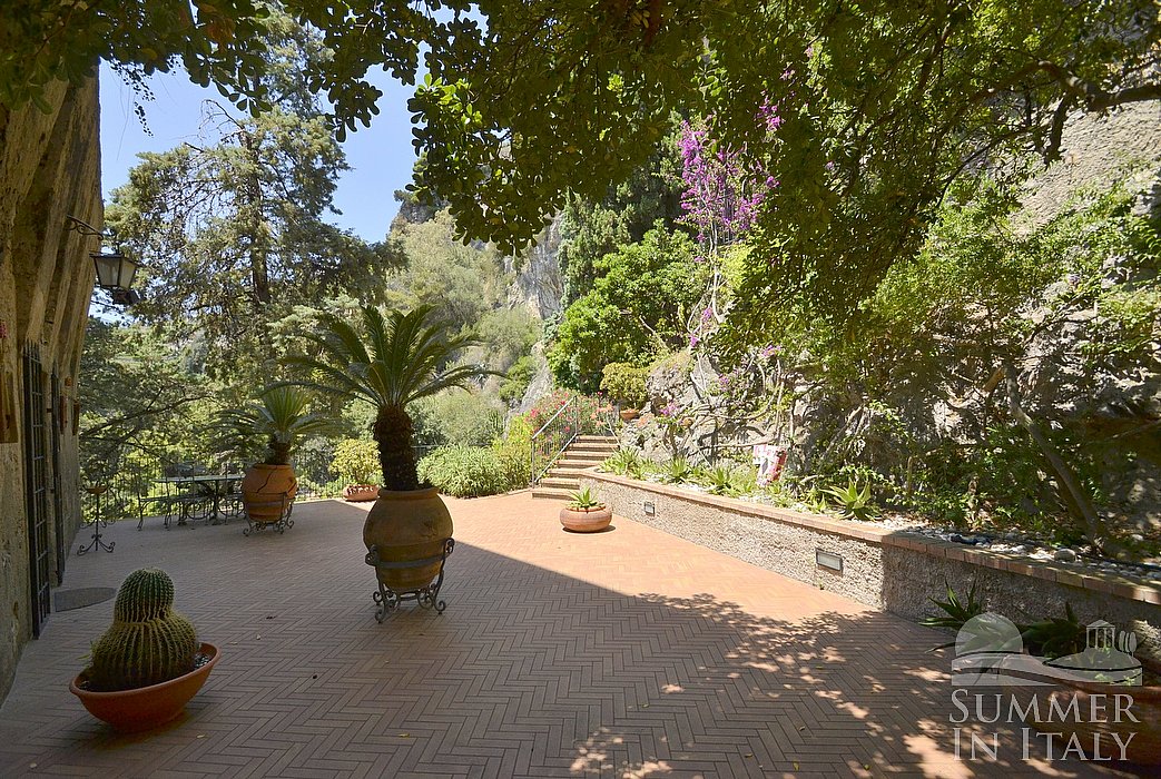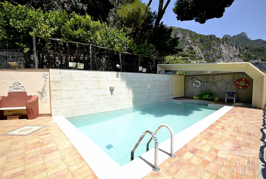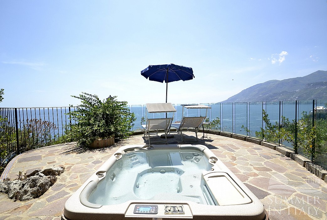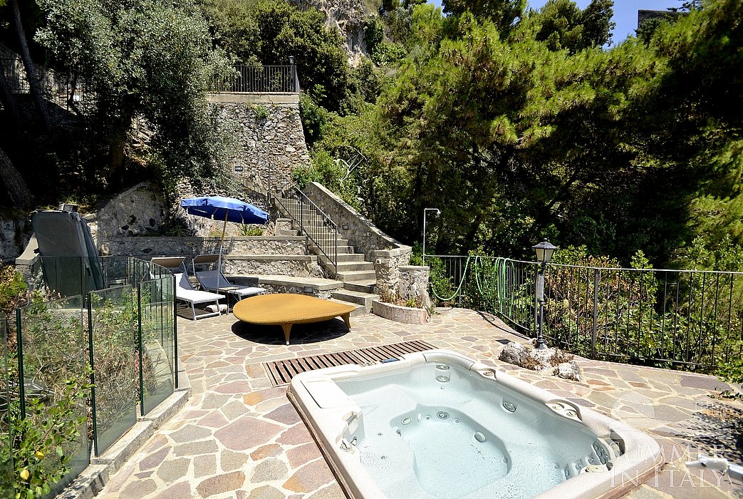 The garden is 10000 square meters (108000 square feet) large. It features a Jacuzzi pool with hydromassage (2 by 2 meters, 6.5 by 6.5 feet). The garden is partly shaded by trees. It is equipped with tables, chairs, sun umbrellas, deck chairs, sun loungers, a swing, hammocks and external showers. Here you will also find a brickwork barbecue and a wood-fired pizza oven. From the garden you will enjoy a wonderful view of the sea and of the coast of Amalfi.