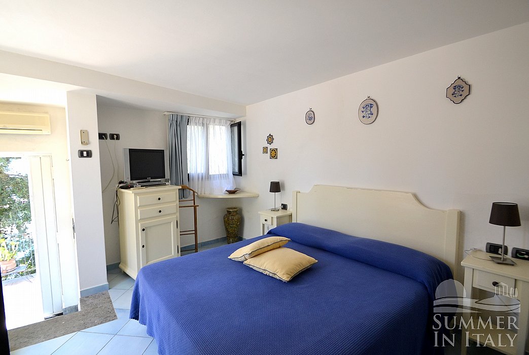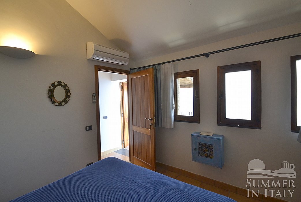 You will be able to enter the fifth bedroom from the first terrace through a corridor. The bedroom has a matrimonial bed (160 cm/62 inches, wider than a queen-size bed). In this room you will find a satellite television (local channels) and a DVD player. The room has three windows with a view of the sea. The bedroom is equipped with an air conditioning/heating unit. Here you will also find a safe, a mini refrigerator and a telephone.