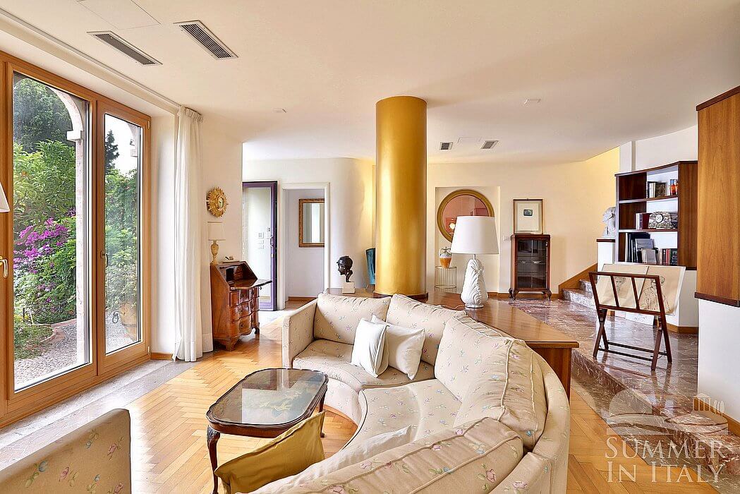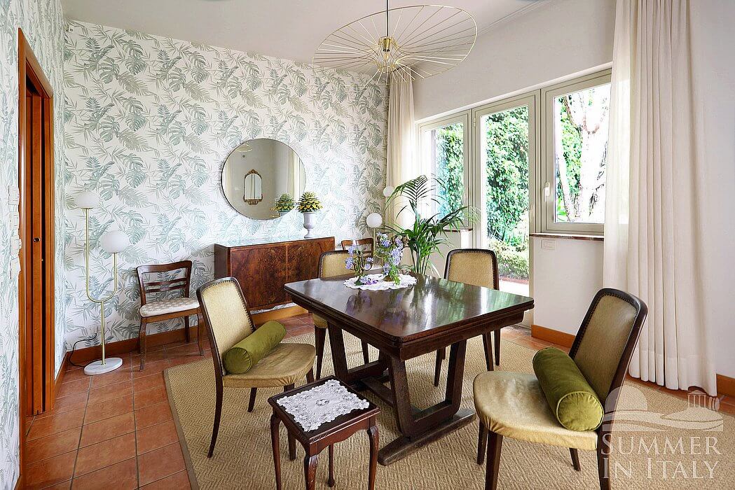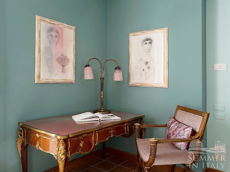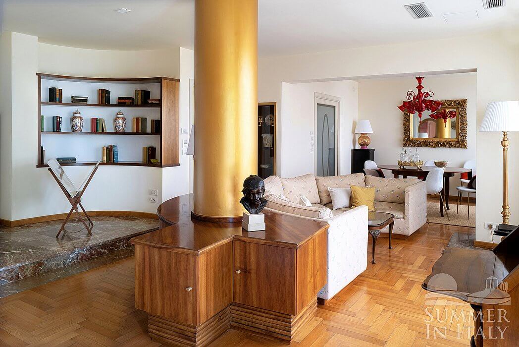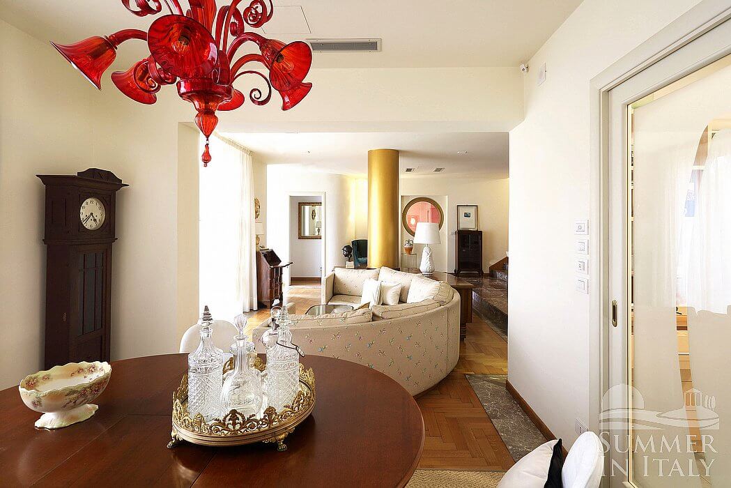 The second living room is paved with wood. The furnishings are elegant and refined, featuring some antique pieces, and include a round-shaped sofa and an armchair. The dining table can accommodate four guests. From the living room you will be able to enter the third terrace through two French doors. The room also has a large window. It is equipped with an air conditioning/heating unit. Here you will also find a safe.