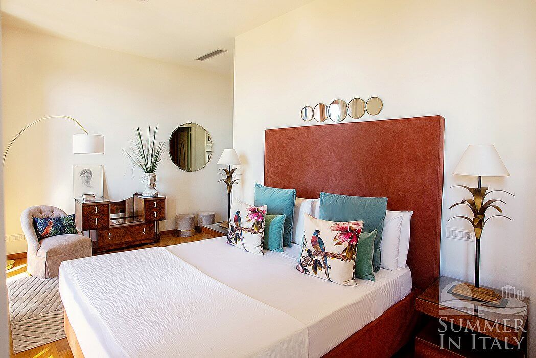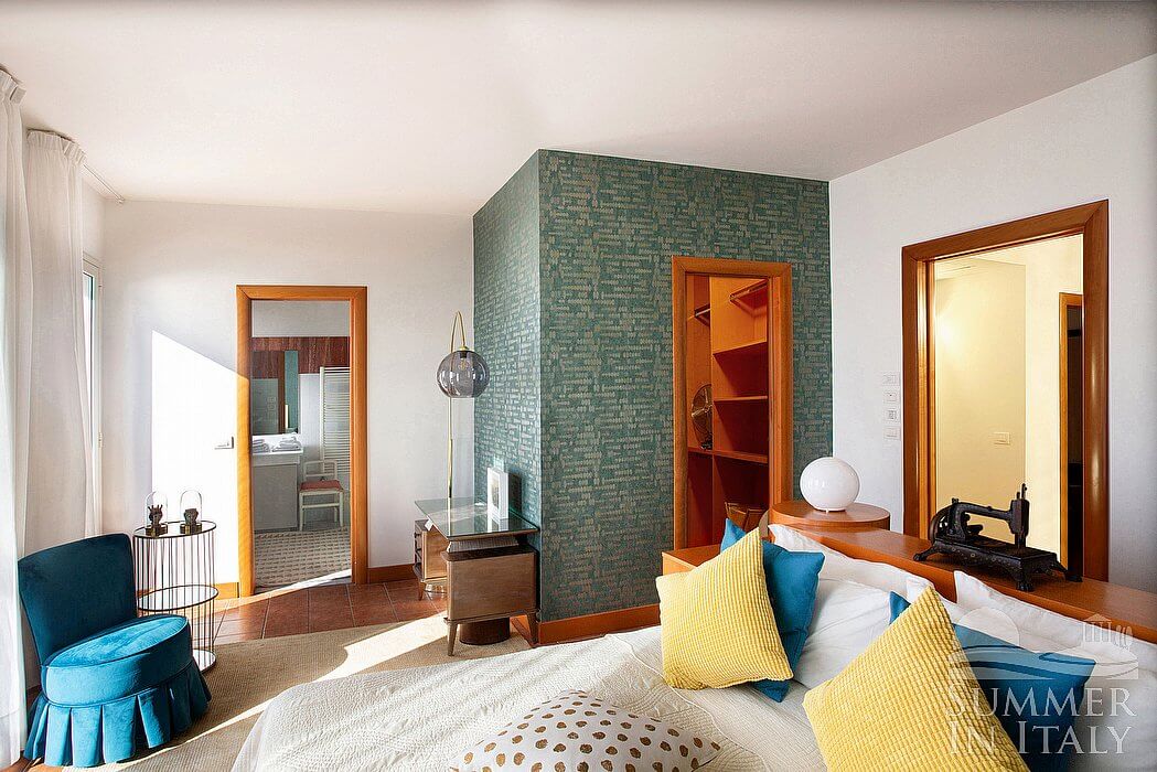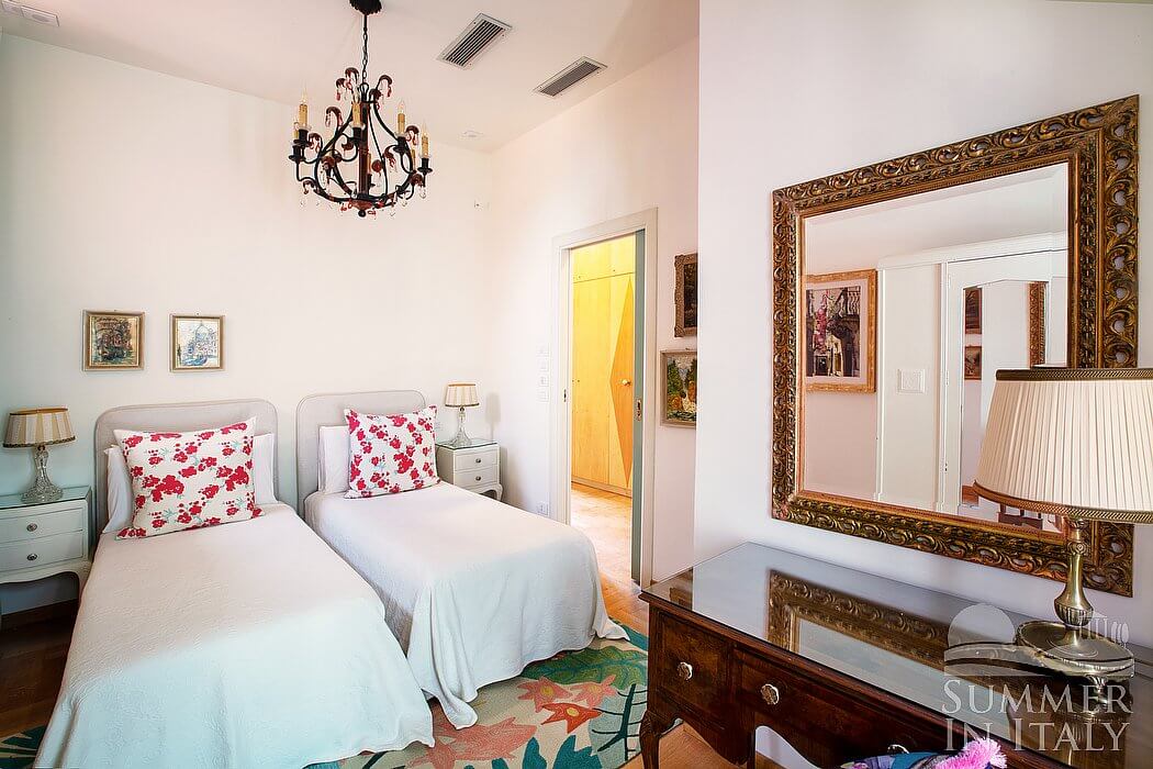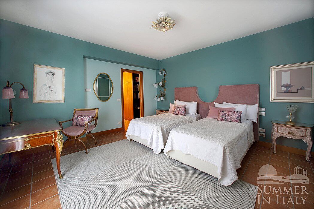 The second living room is paved with wood. The furnishings are elegant and refined, featuring some antique pieces, and include a round-shaped sofa and an armchair. The dining table can accommodate four guests. From the living room you will be able to enter the third terrace through two French doors. The room also has a large window. It is equipped with an air conditioning/heating unit. Here you will also find a safe.