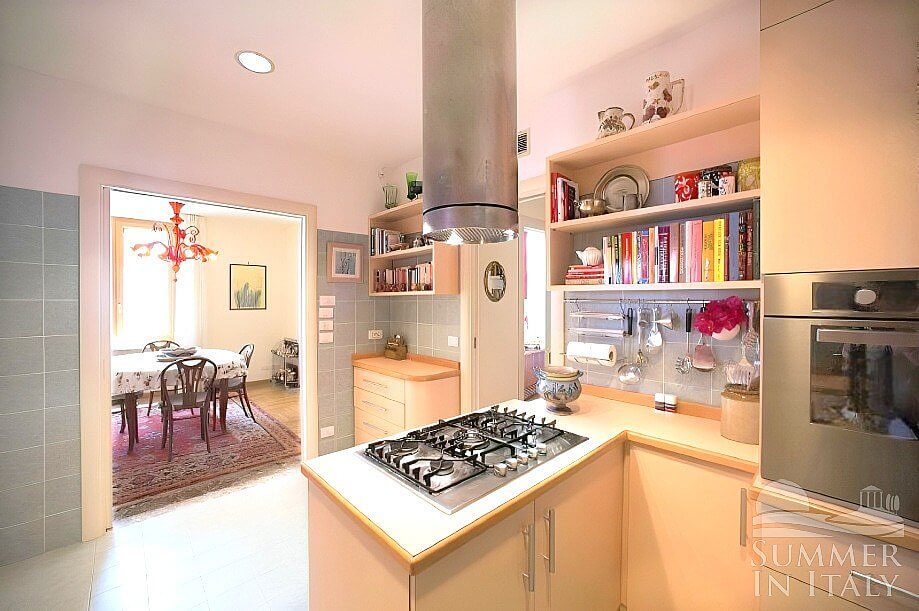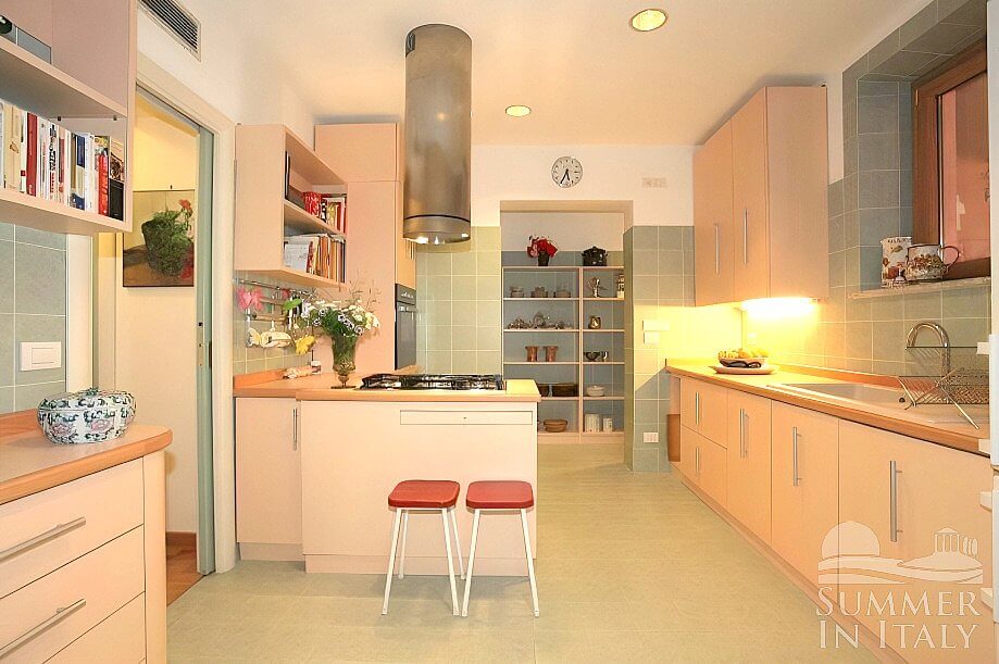 You will be able to enter the first kitchen from the living room through an access area. It is equipped with a four-burner gas cooker, an electric oven, a refrigerator with freezer, a dishwasher, a microwave oven, an Italian-style coffee-maker, an American-style coffee-maker and a kettle. The kitchen has two windows.