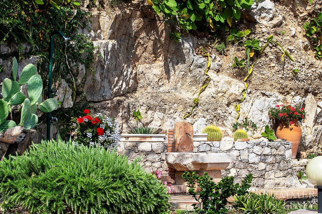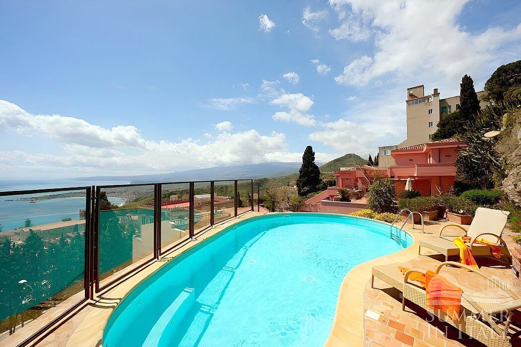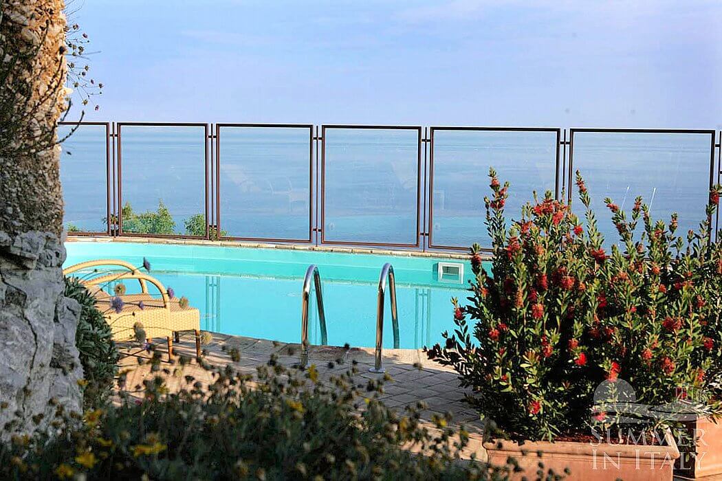 You will reach the swimming pool from the first terrace going up approximately ten stairway steps. The pool is 5 meters (16 feet) large by 8 meters (26 feet) long, 1.3 meters (4.3 feet) deep. The swimming pool has a sinuous shape. The area is equipped with sun loungers and an external shower. From the swimming pool you will enjoy a fascinating view of the Mount Etna and of the sea. The pool is open from the beginning of March until the end of November.