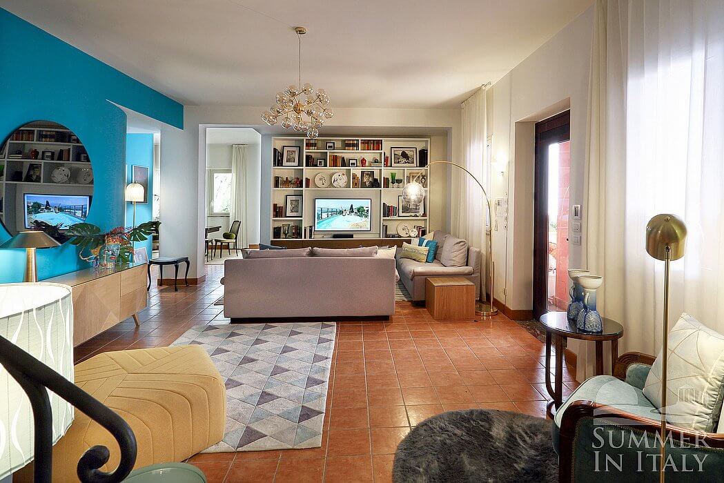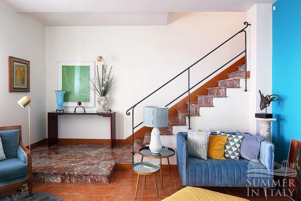 The first living room is paved with terracotta tiles. The furnishings are elegant and welcoming, and include a sofa, two armchairs and a divan bed for one guest. The dining table can accommodate four guests. In this room you will find a satellite smart TV. From the living room you will be able to enter the first terrace through three French doors. The room also has two windows. It is equipped with an air conditioning/heating unit.