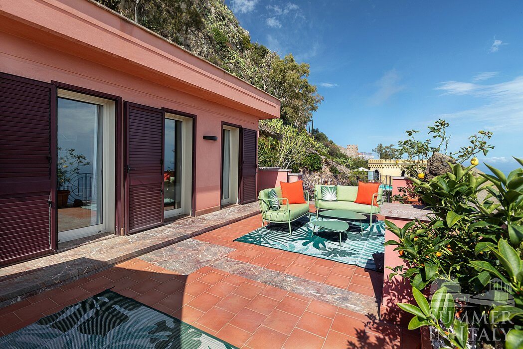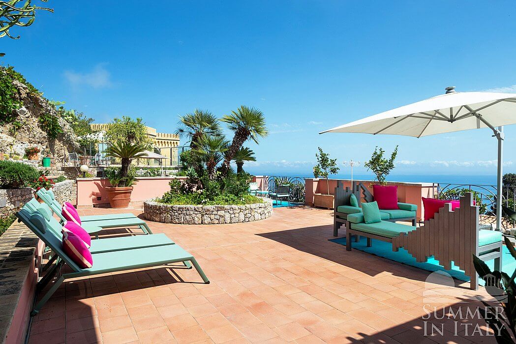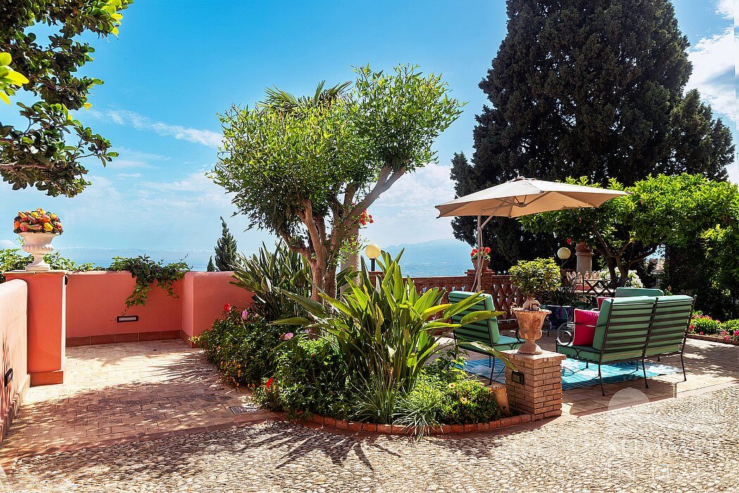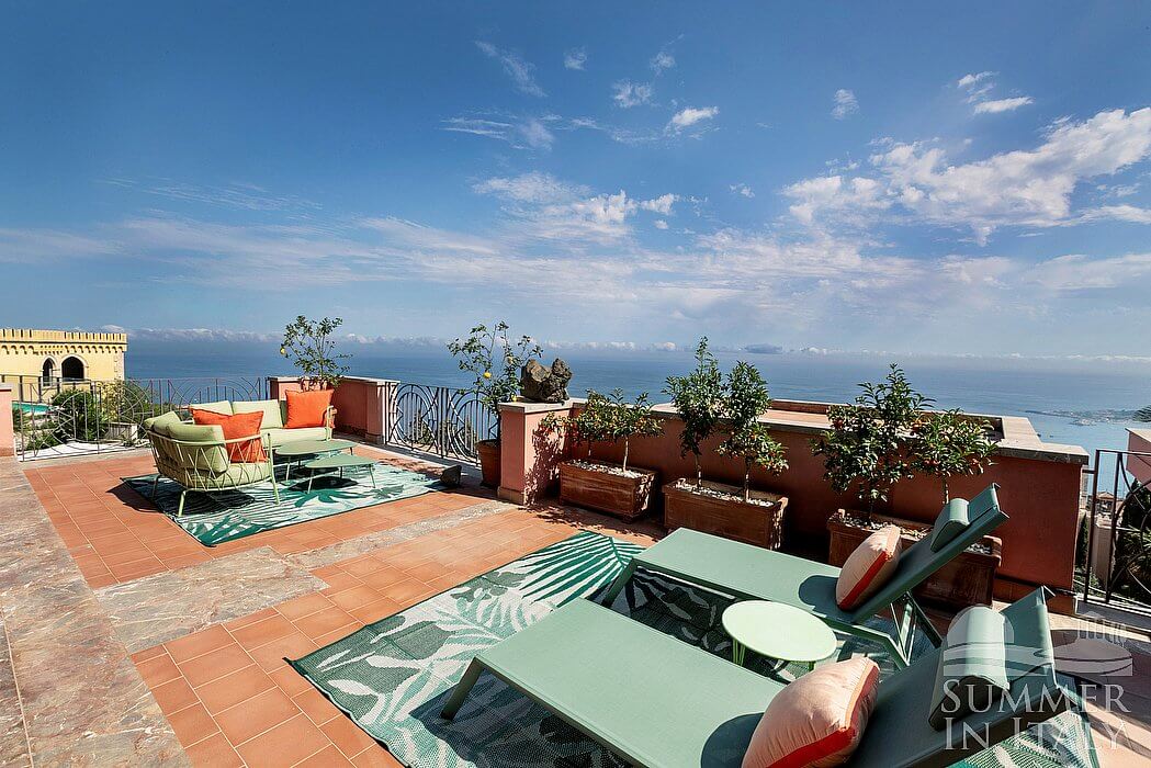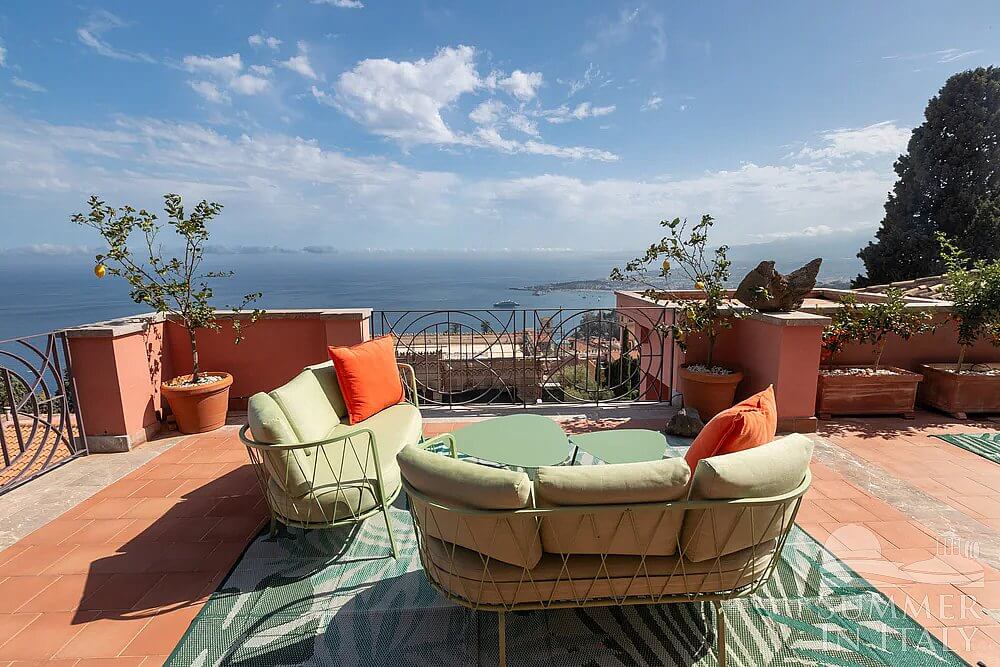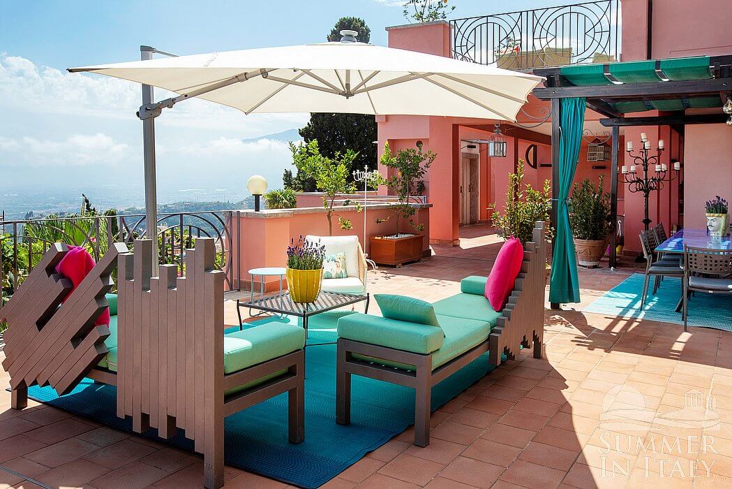 The first terrace is 130 square meters (1400 square feet) large. It is partly shaded by an elegant porch and by a pergola. It is equipped with small sofas and armchairs, as well as with tables, chairs, a sun umbrella and sun loungers. Here you will also find a portable barbecue. From the terrace you will enjoy a spectacular view of the sea and, partially, of the Mount Etna.