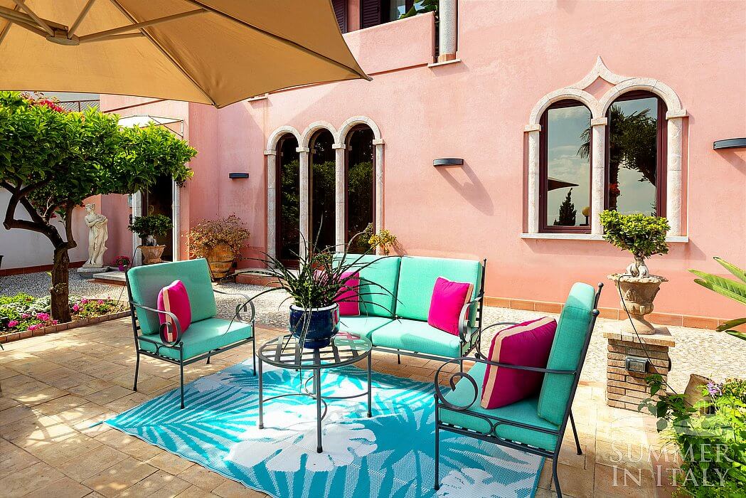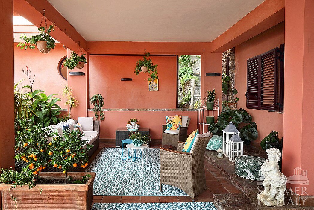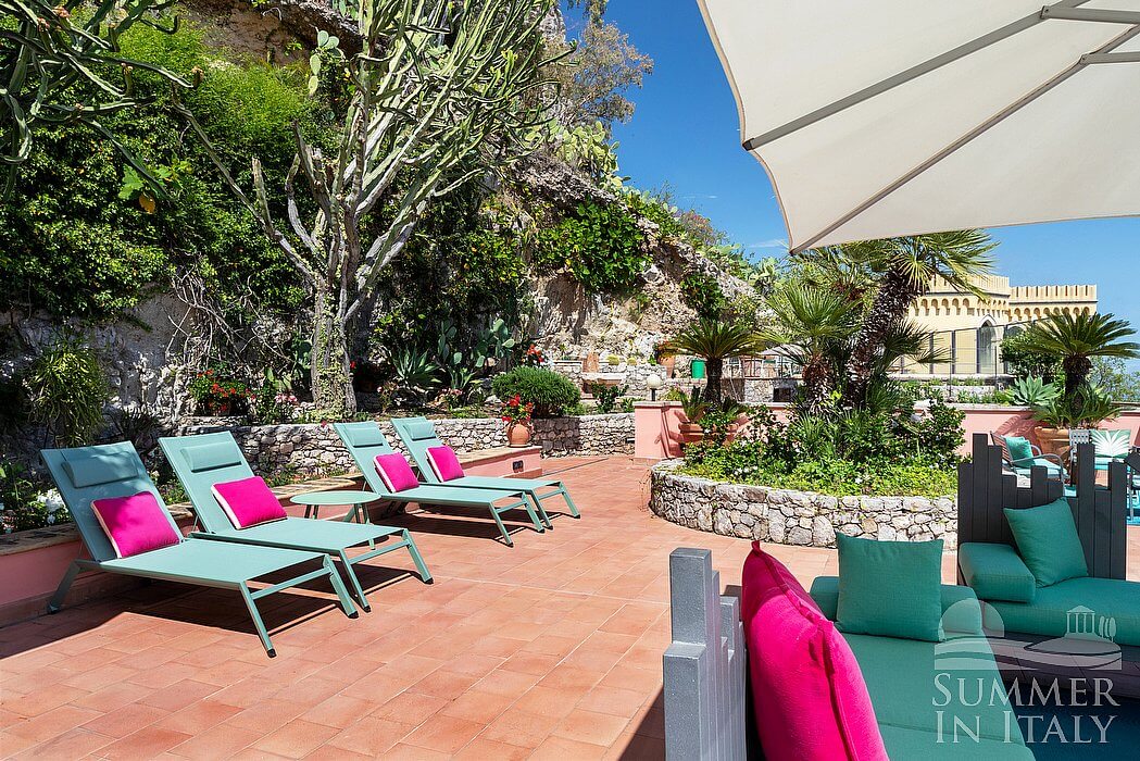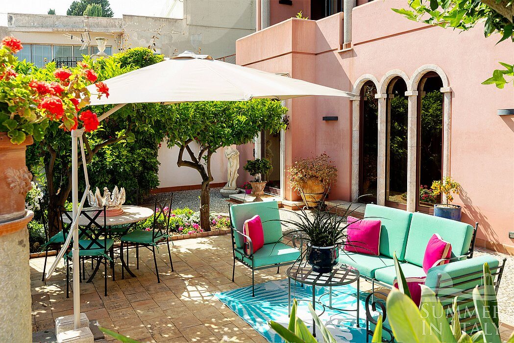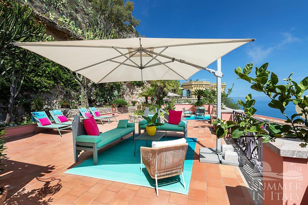 The first terrace is 130 square meters (1400 square feet) large. It is partly shaded by an elegant porch and by a pergola. It is equipped with small sofas and armchairs, as well as with tables, chairs, a sun umbrella and sun loungers. Here you will also find a portable barbecue. From the terrace you will enjoy a spectacular view of the sea and, partially, of the Mount Etna.