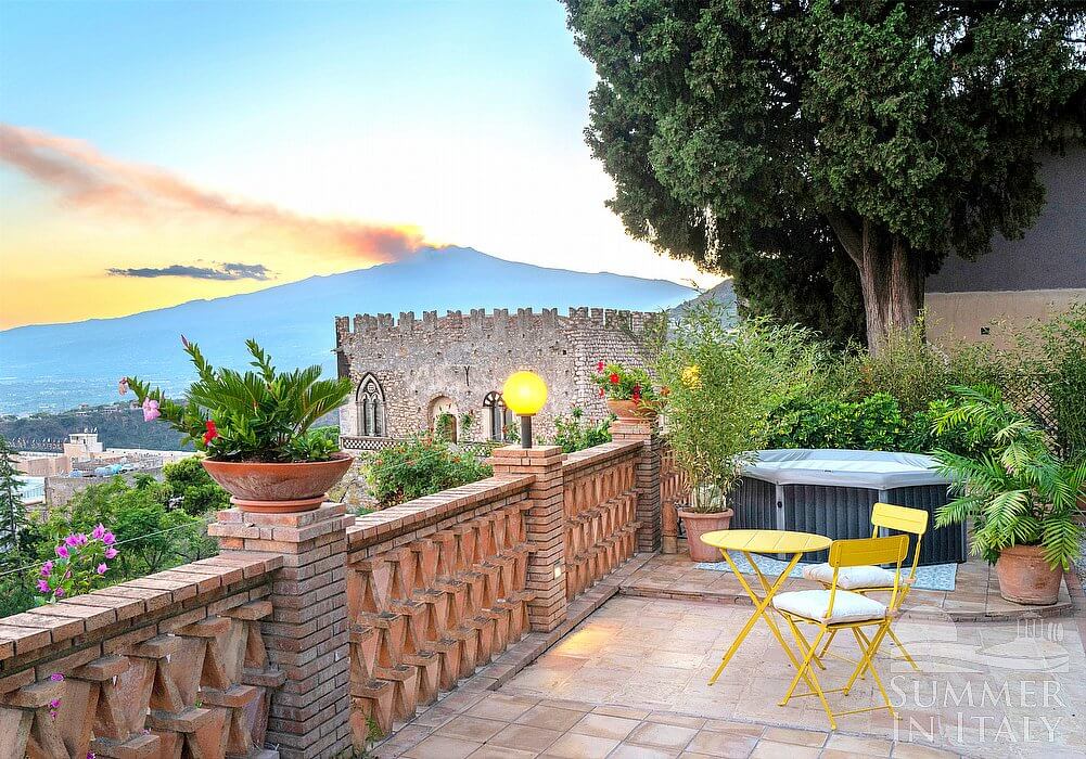 The fourth terrace is 65 square meters (700 square feet) large. It features an above-ground heated jacuzzi pool with hydromassage with six seats. You will reach it from the third terrace going down approximately 16 stairway steps. It is partly shaded by trees. It is equipped with a table and chairs. From the terrace you will enjoy a lovely view of the Mount Etna and of the sea.