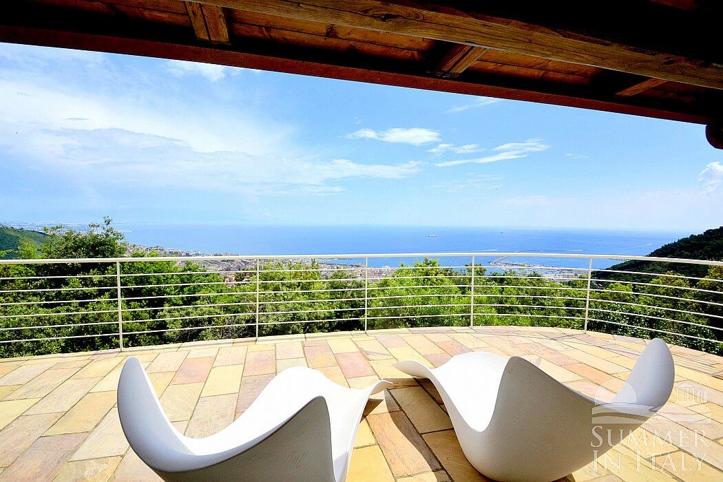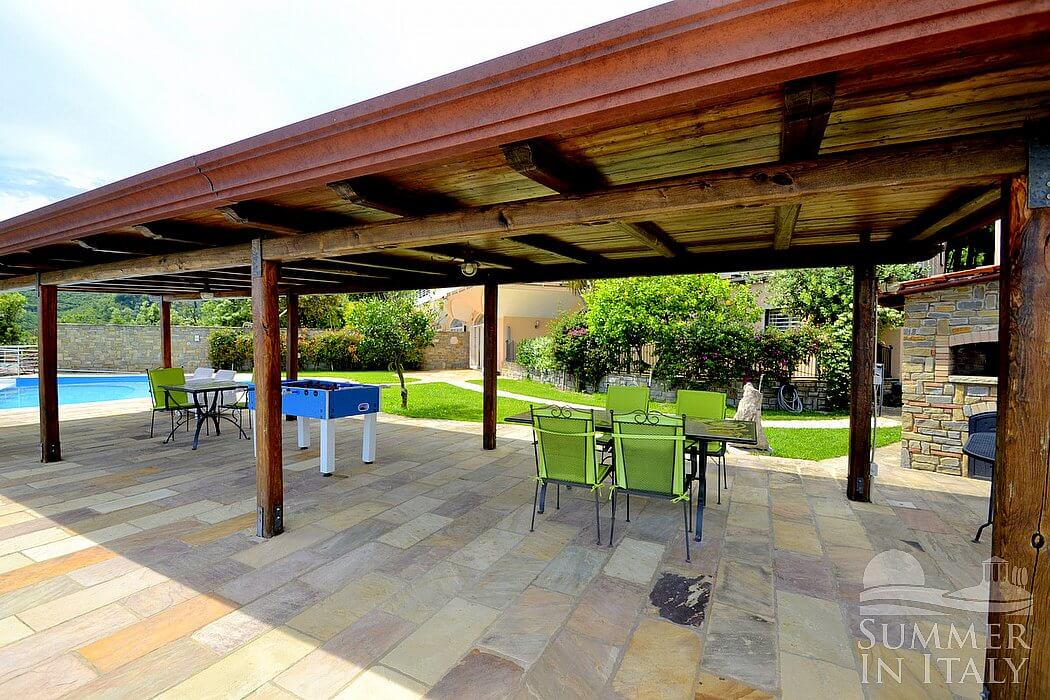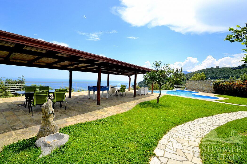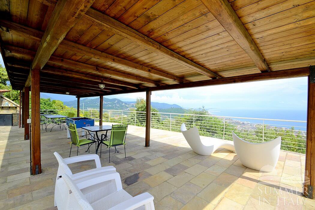 The terrace is 55 square meters (590 square feet) large. It is partly shaded by a characteristic wood roof. It is equipped with two armchairs, as well as with tables, chairs and two sun loungers. Here you will be able to have fun with a football table. Here you will also find a brickwork barbecue. From the terrace you will enjoy a bright view of the sea and of the tourist port and of the coast. You will share the terrace with the owners.