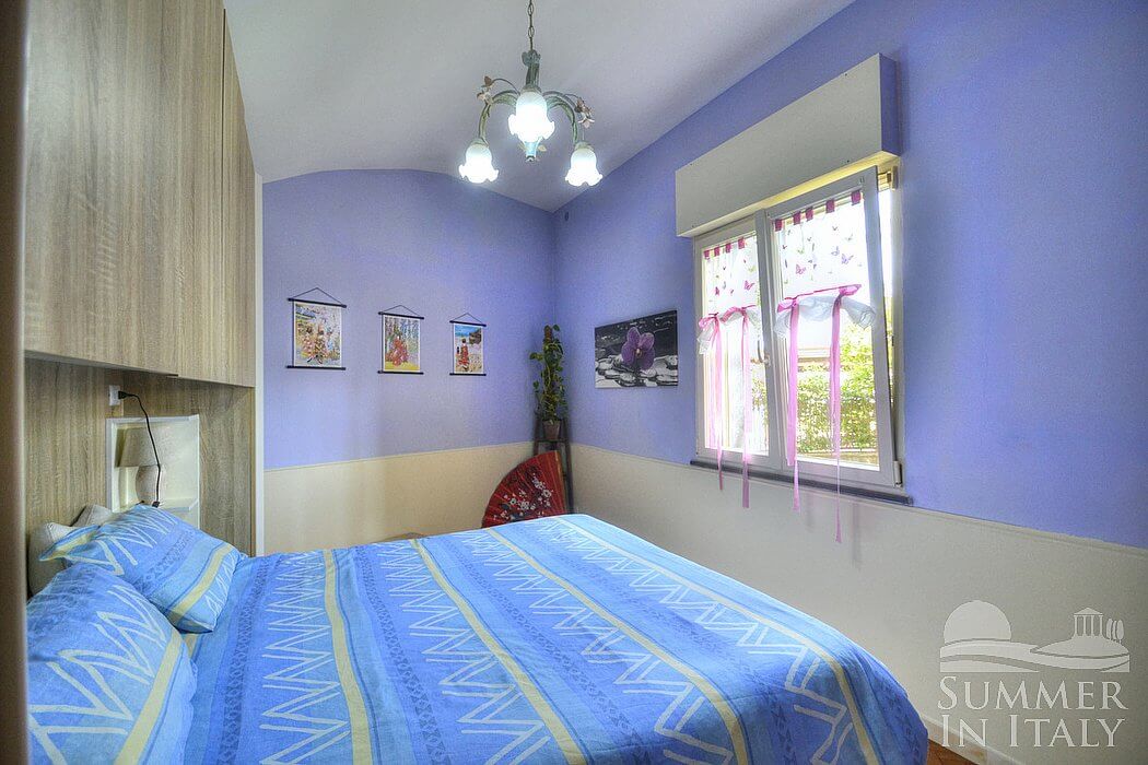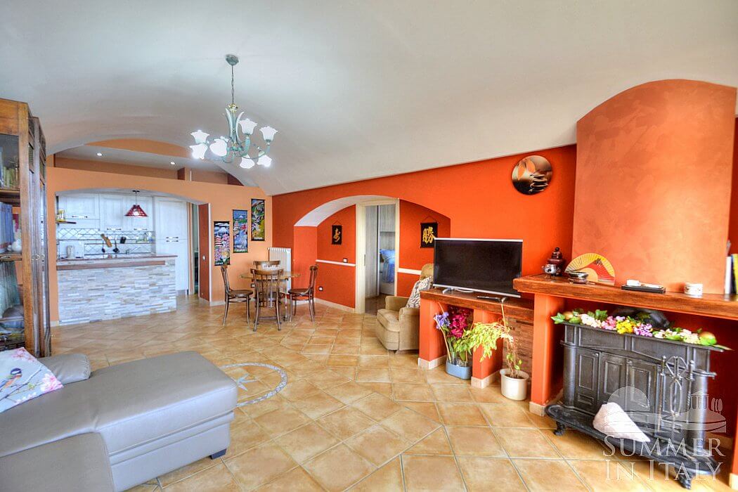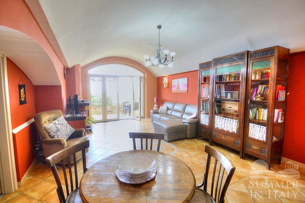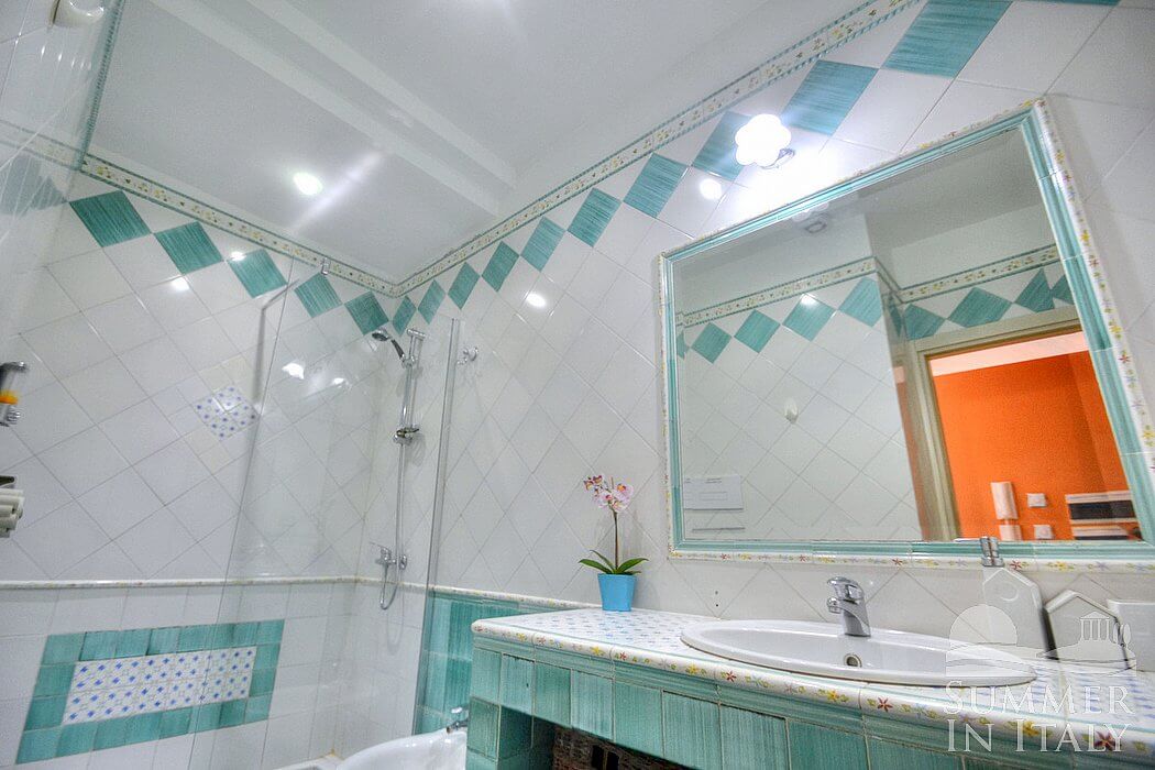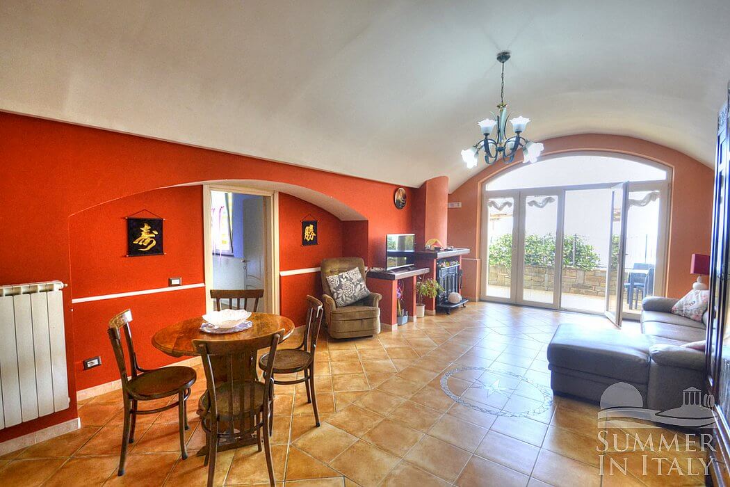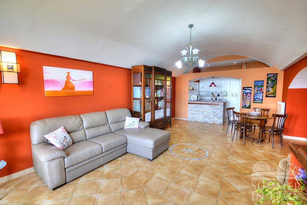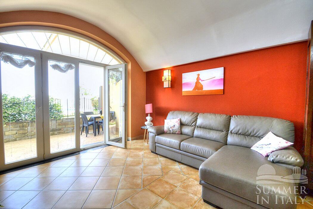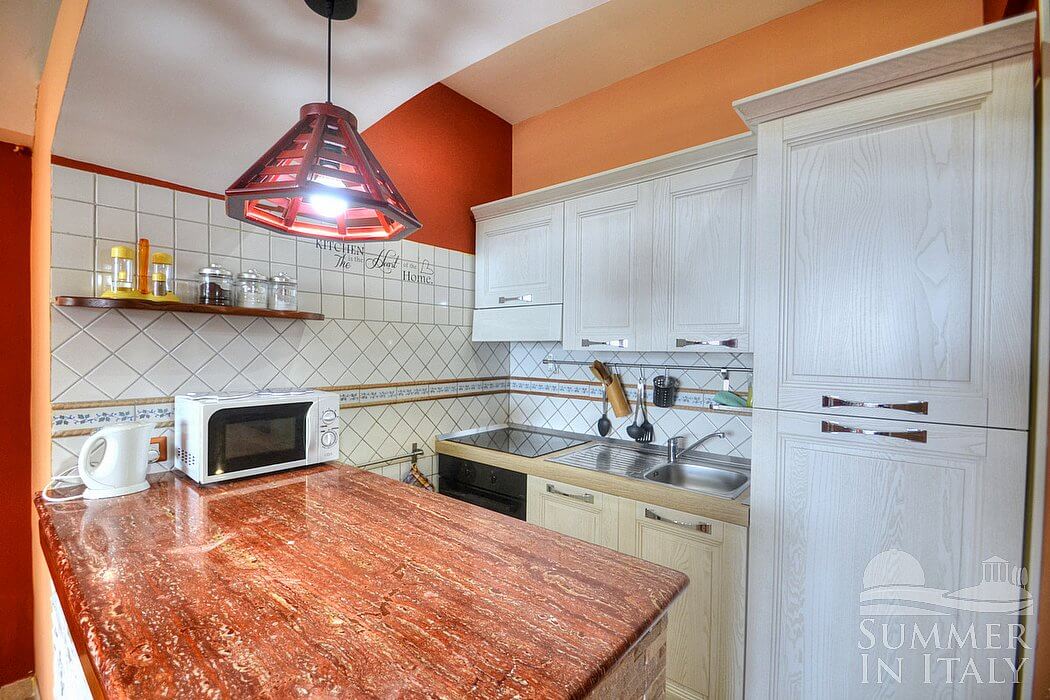 The living room is paved with terracotta tiles. The ceiling is vaulted. The furnishings are warm and welcoming. The furnishings include a L-shaped sofa and an armchair. In the living room you will also find a cooking area. The kitchenette is equipped with a four-burner induction cooker, an electric oven, a refrigerator with freezer, a microwave oven, an Italian-style coffee-maker and a kettle. There is also a washing machine, an iron and an ironing board. The dining table can accommodate four guests. In this room you will find a television (local channels). From the living room you will be able to enter the patio through a French door.