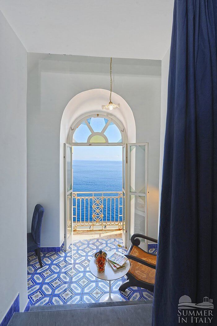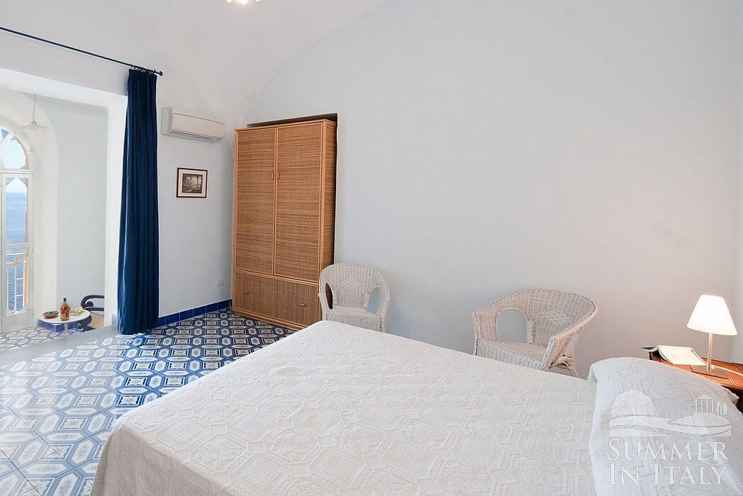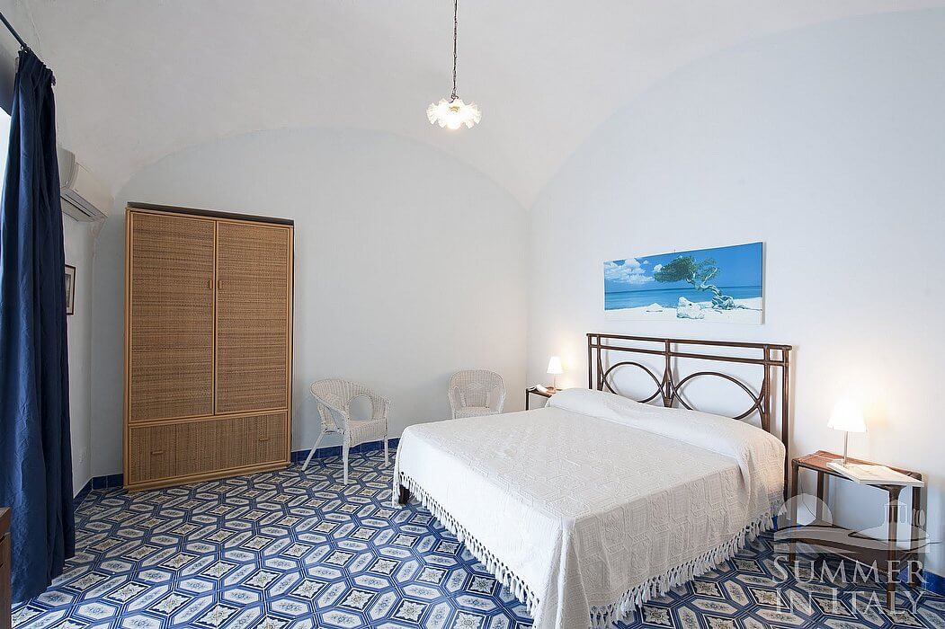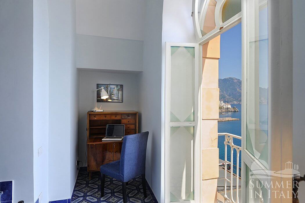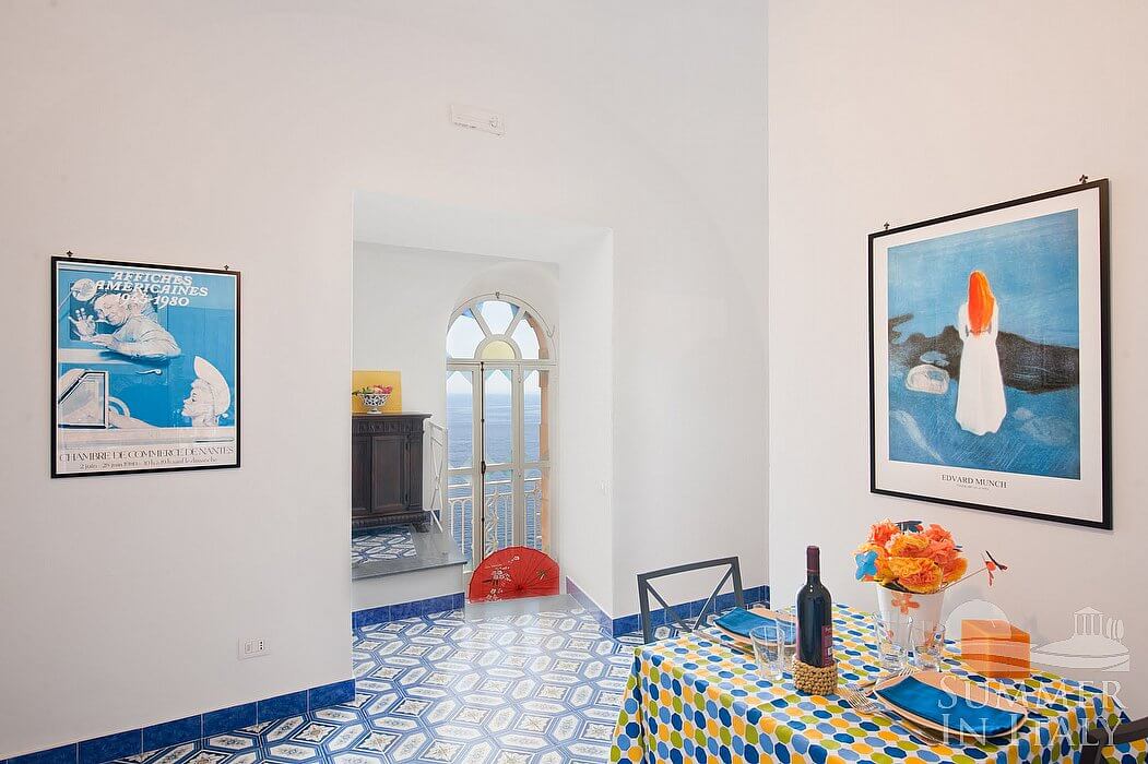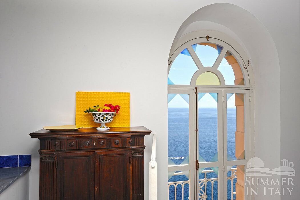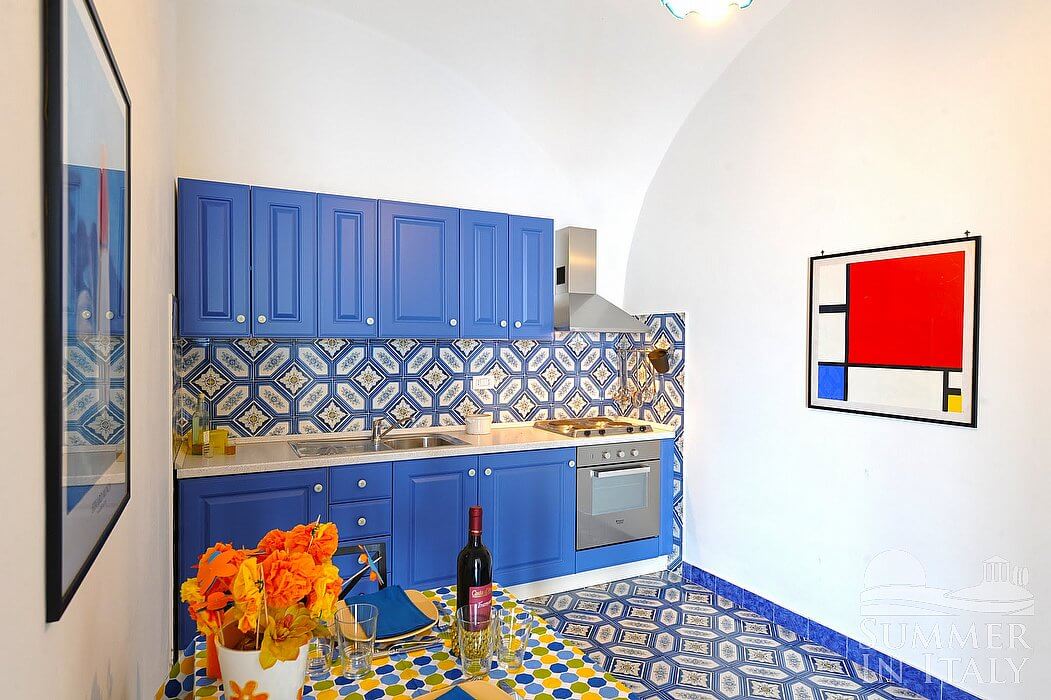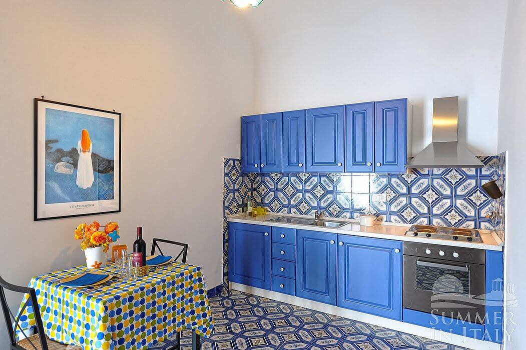 The kitchen is paved with tiles with handmade decoration, in the characteristic style of the Amalfi Coast. The ceiling is vaulted. The furnishings are classic and welcoming. It is equipped with a four-burner electric cooker, an electric oven, a small refrigerator without freezer, a dishwasher and an Italian-style coffee-maker. The dining table can accommodate two guests. The kitchen has a Juliet balcony.