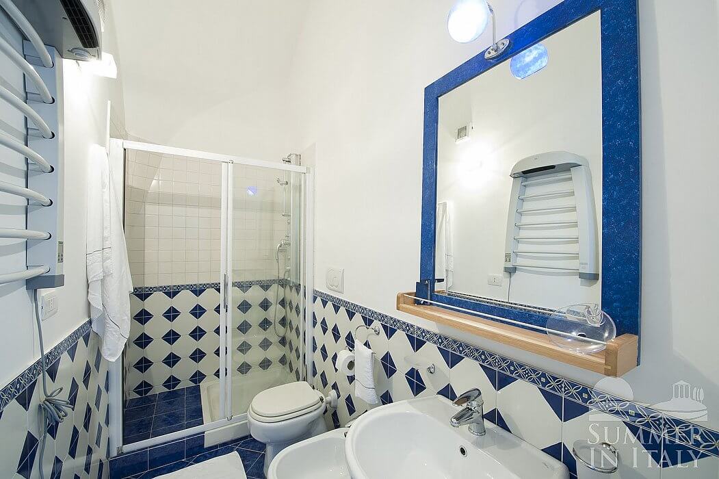 The bathroom is tiled with lucid white and blue majolica tiles and equipped with a washbasin, a toilet, a fully enclosed shower and a hairdryer. Here you will also find a washing machine (hidden in a utility room), an iron and an ironing board. You will be able to enter the bathroom from the kitchen.