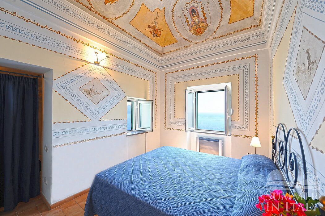 You will be able to enter the first bedroom through an access area. This room has no door, but it is closed by a curtain. The ceiling is vaulted and frescoed. The room has a matrimonial bed (160 cm/63 inches, wider than a queen-size bed). The room has two windows, and it's equipped with an air conditioning/heating unit.