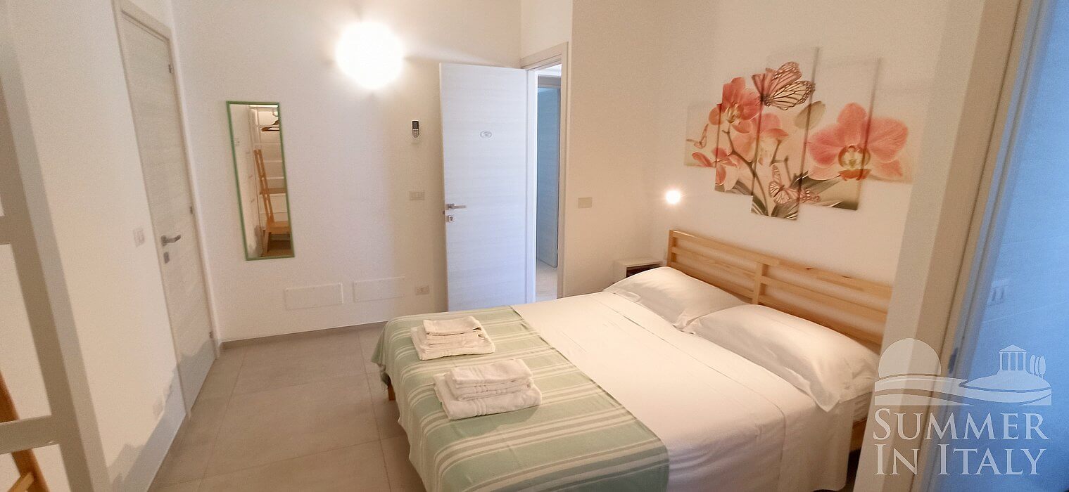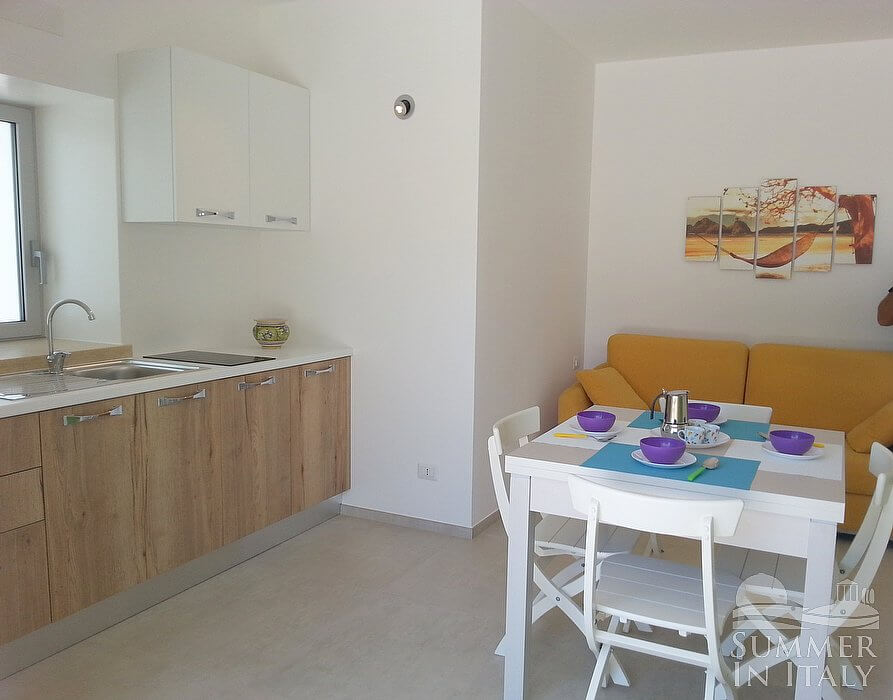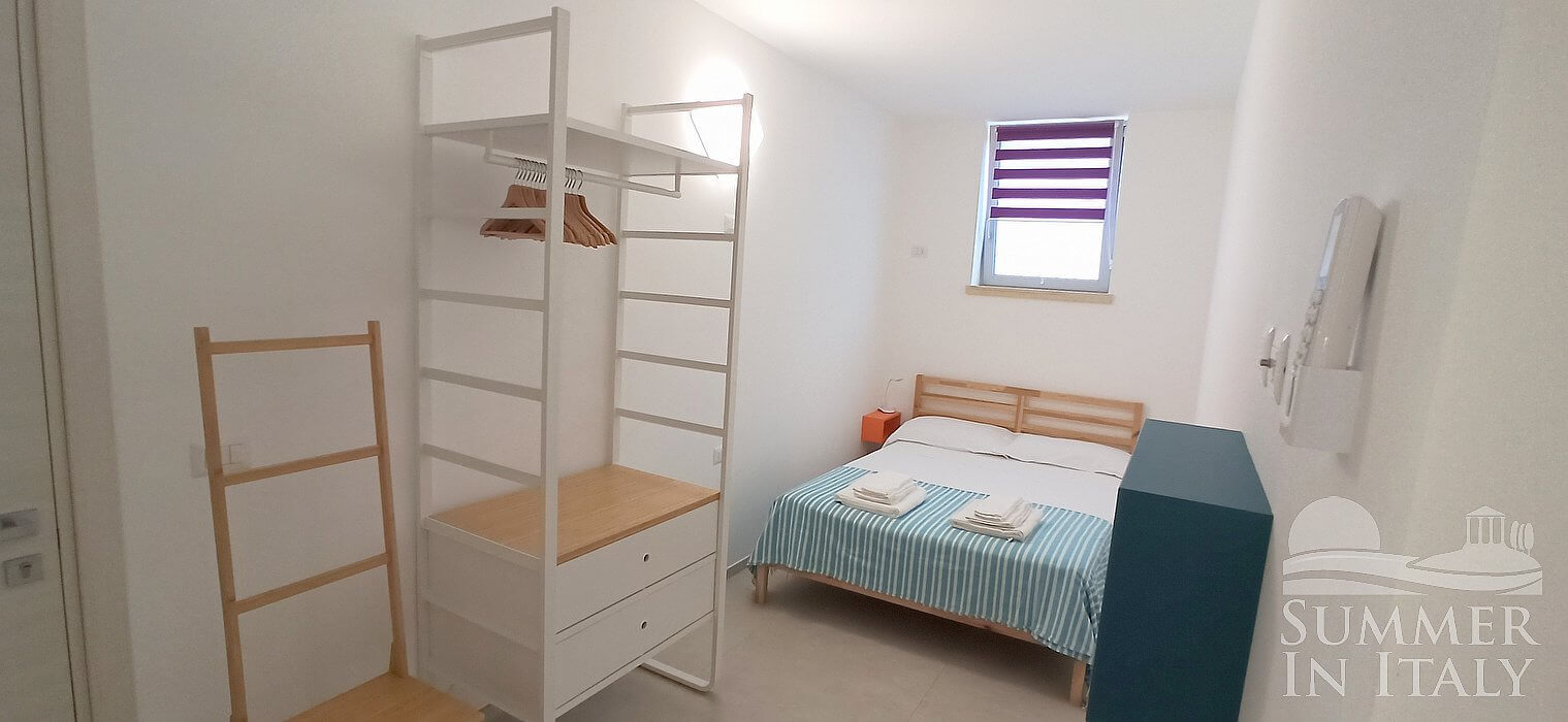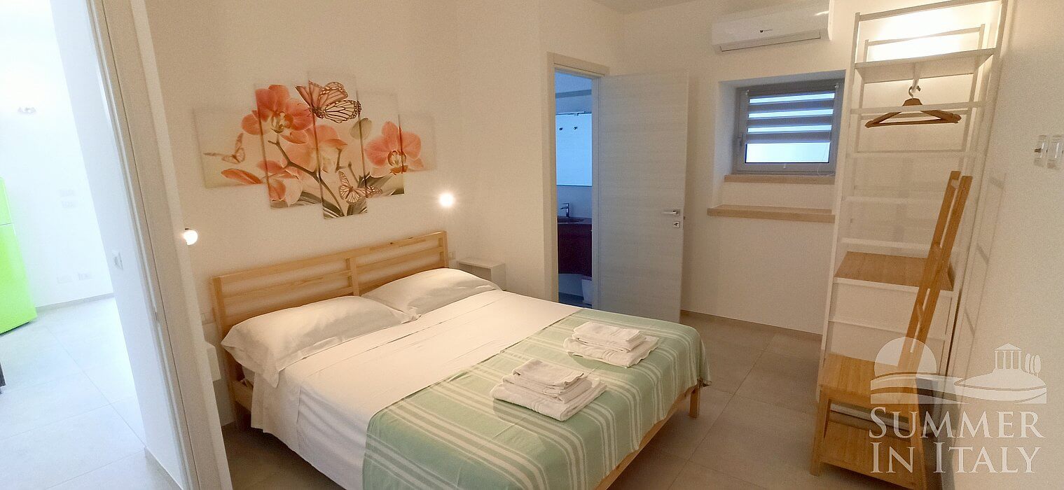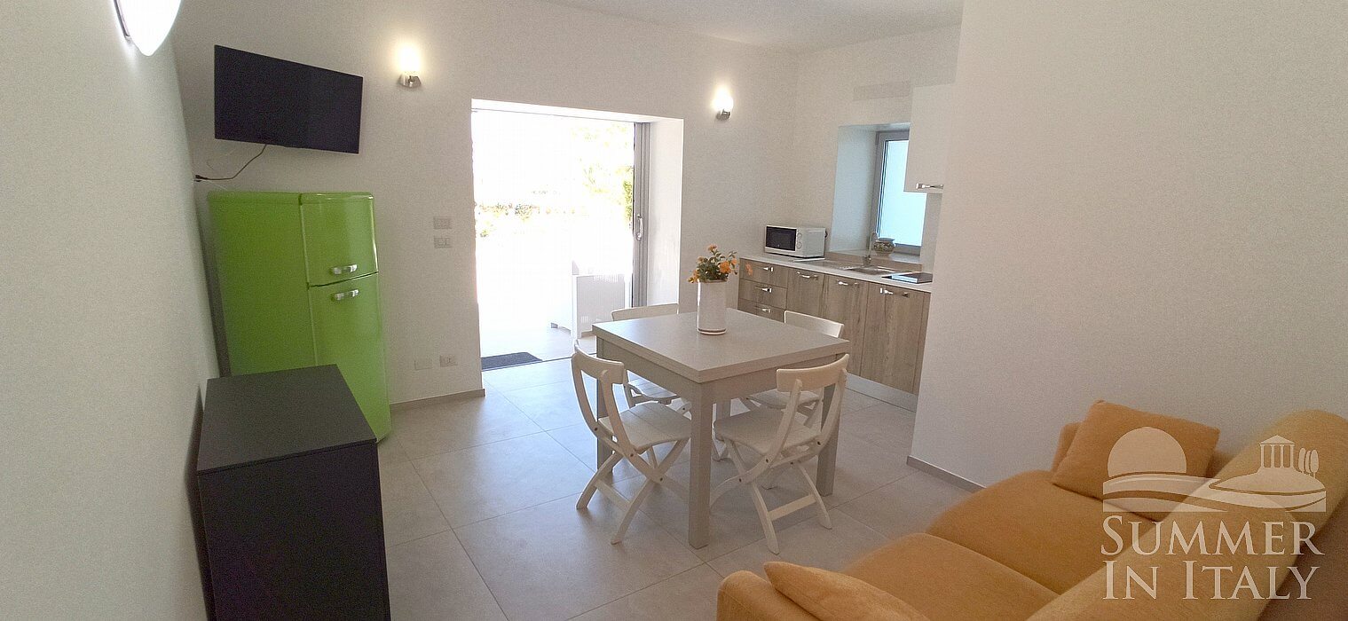 The furnishings of the living room are simple and comfortable, and include a divan bed for one guest (available upon request with an additional cost -- please contact our staff in advance). In the living room you will also find a cooking area. The kitchenette is equipped with a two-burner induction cooker, a small electric oven, a refrigerator with freezer, a dishwasher, an Italian-style coffee-maker and a kettle. The dining table can accommodate four guests. In this room you will find a satellite television (local channels). From the living room you will be able to enter the patio through a French door. The room also has a window.