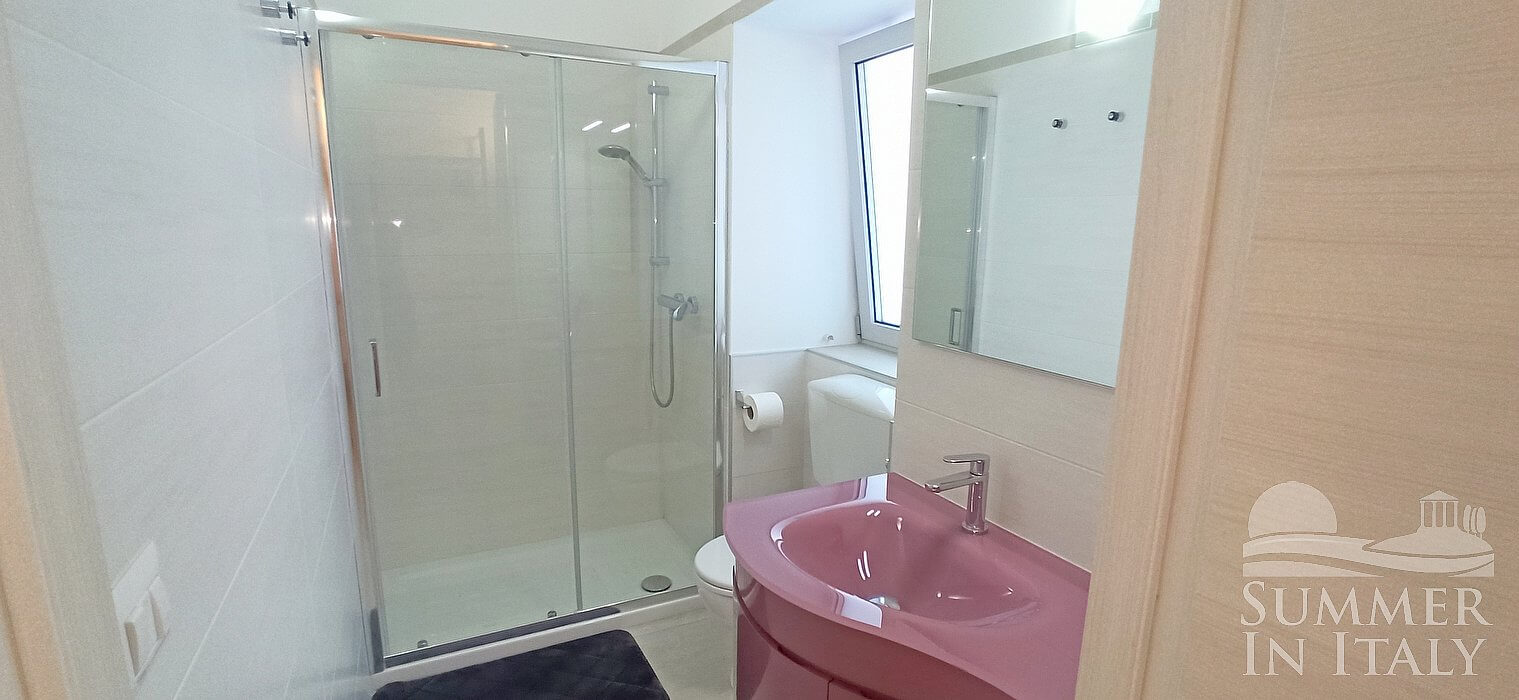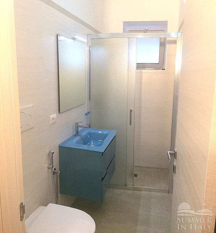 You will be able to enter the first bedroom from the living room through an access area. The bedroom has a matrimonial bed (160 cm/63 inches, wider than a queen-size bed). The room has a window, and it's equipped with an air conditioning/heating unit. This bedroom has an en-suite bathroom, equipped with a washbasin, a toilet, a fully enclosed shower and a hairdryer.