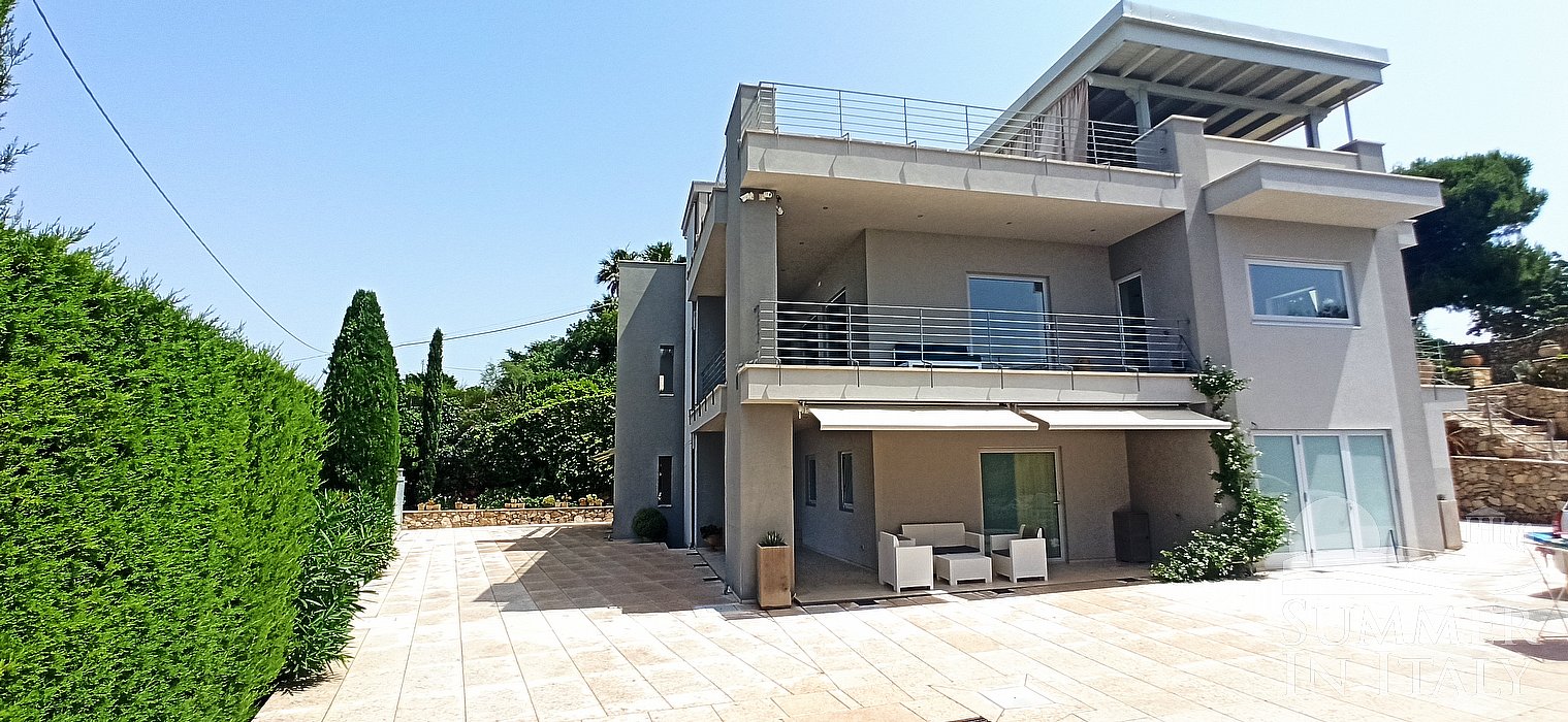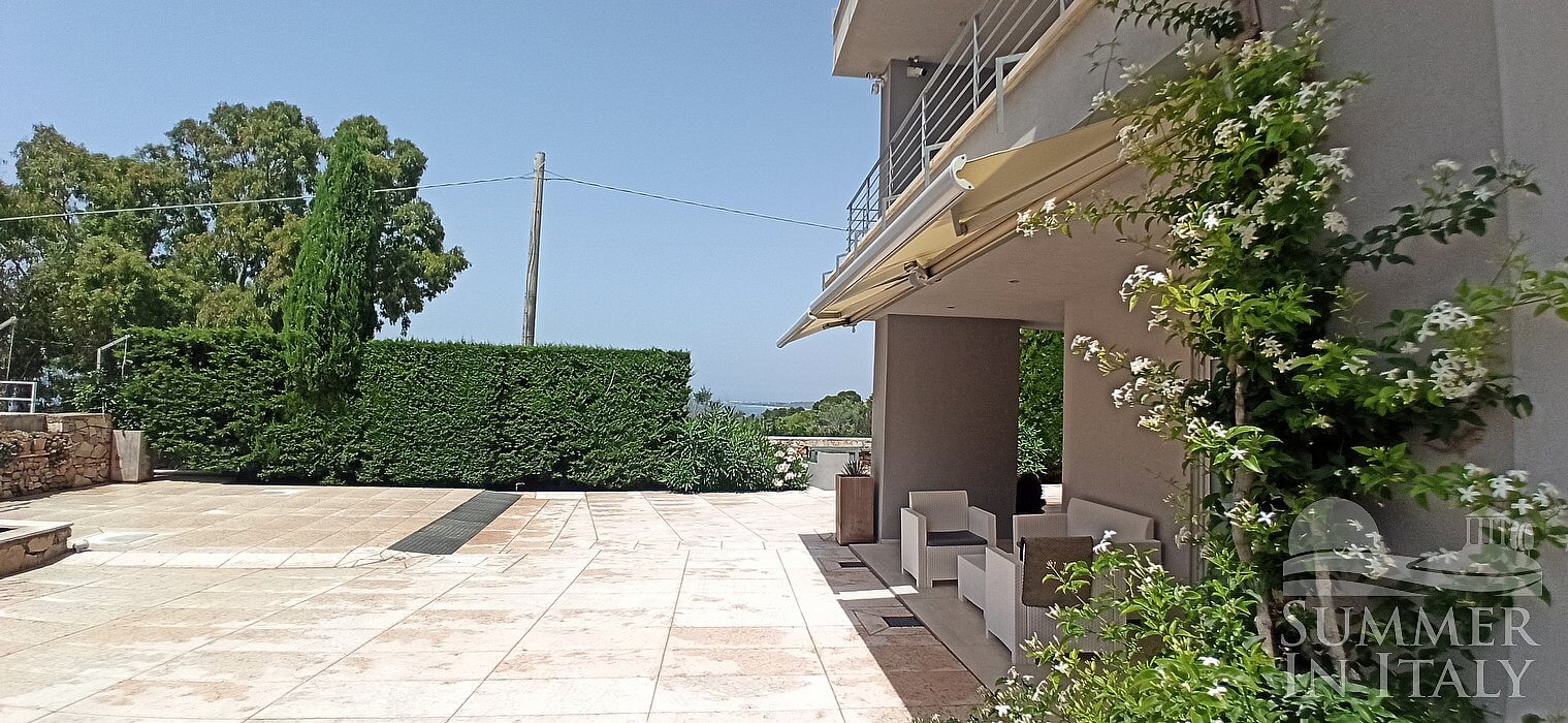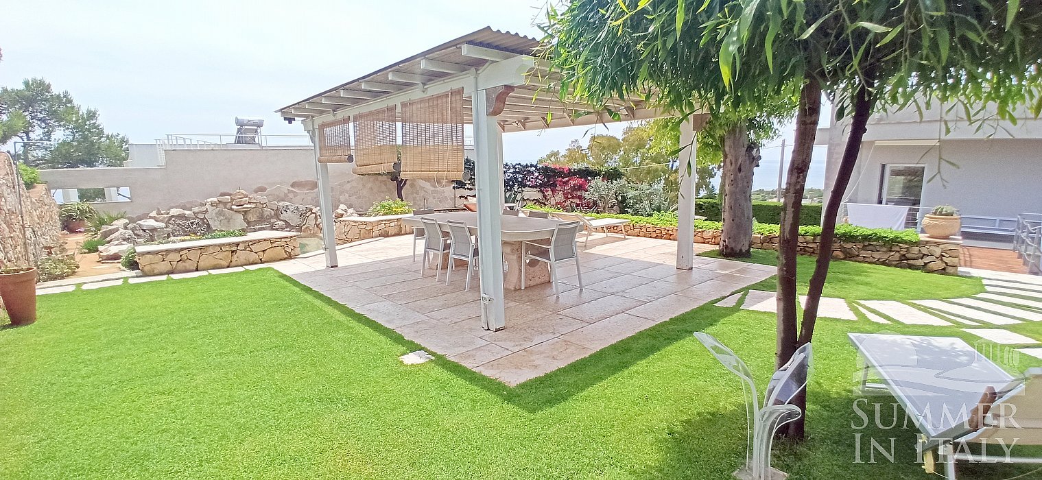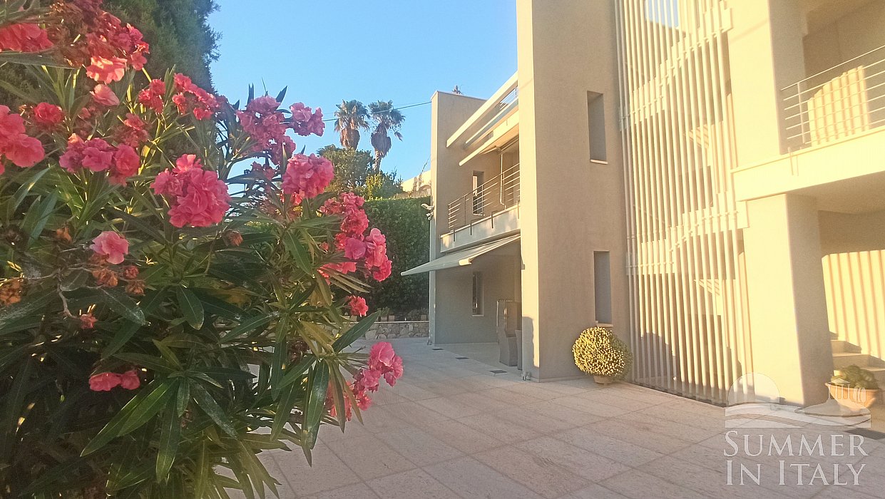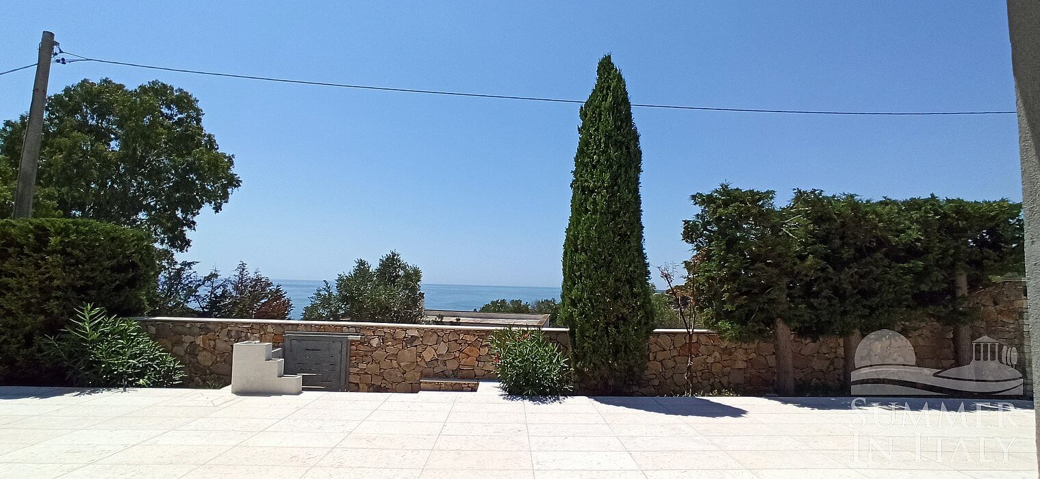 You will reach the garden from the patio going up approximately 17 stairway steps. The garden is 800 square meters (8610 square feet). It is partly shaded by tall trees and by awnings. It is equipped with a table, chairs, sun loungers and a wooden gazebo. Here you will also find a portable barbecue. From the garden you will enjoy a partial view of the sea. You will share the garden with the other guests staying at the complex.