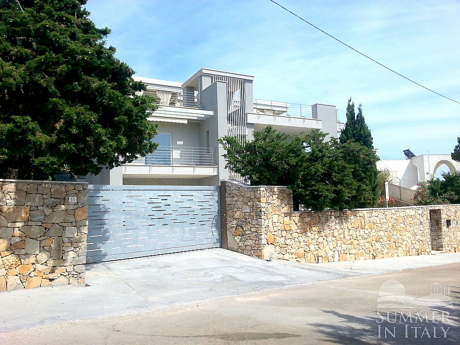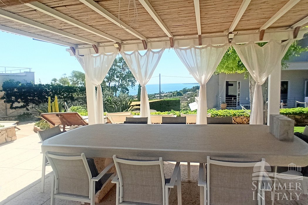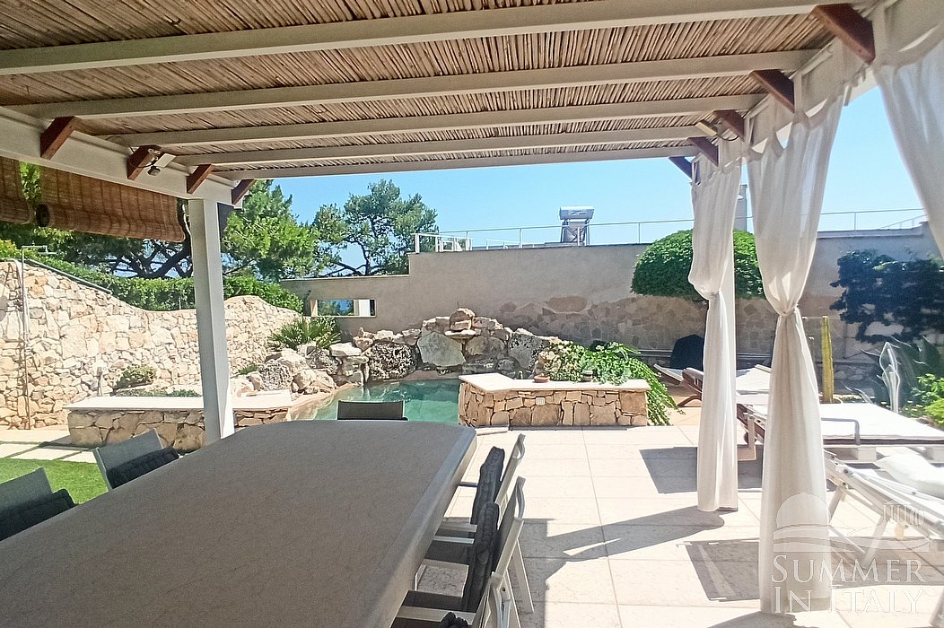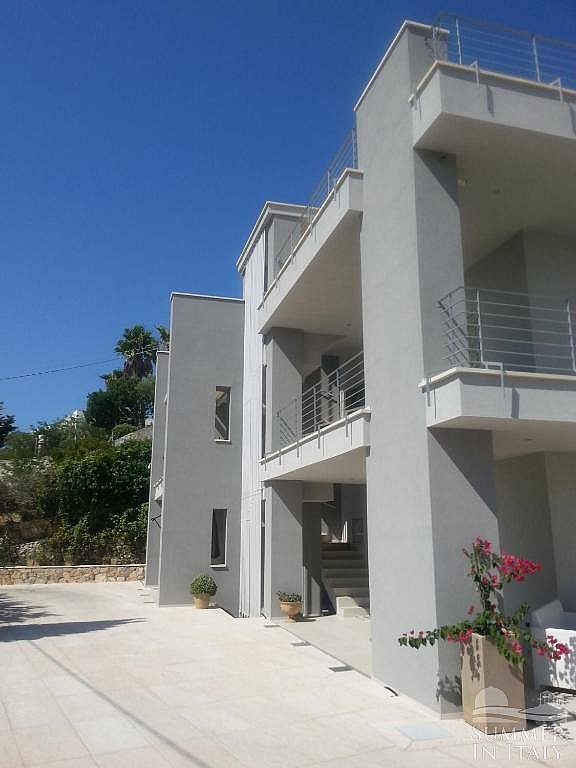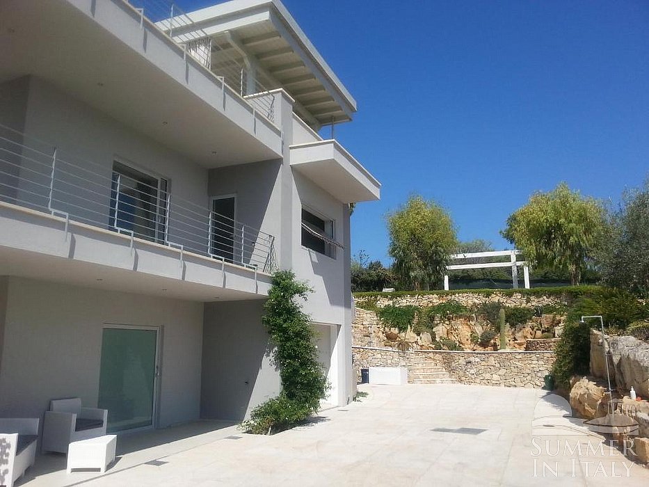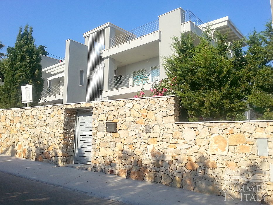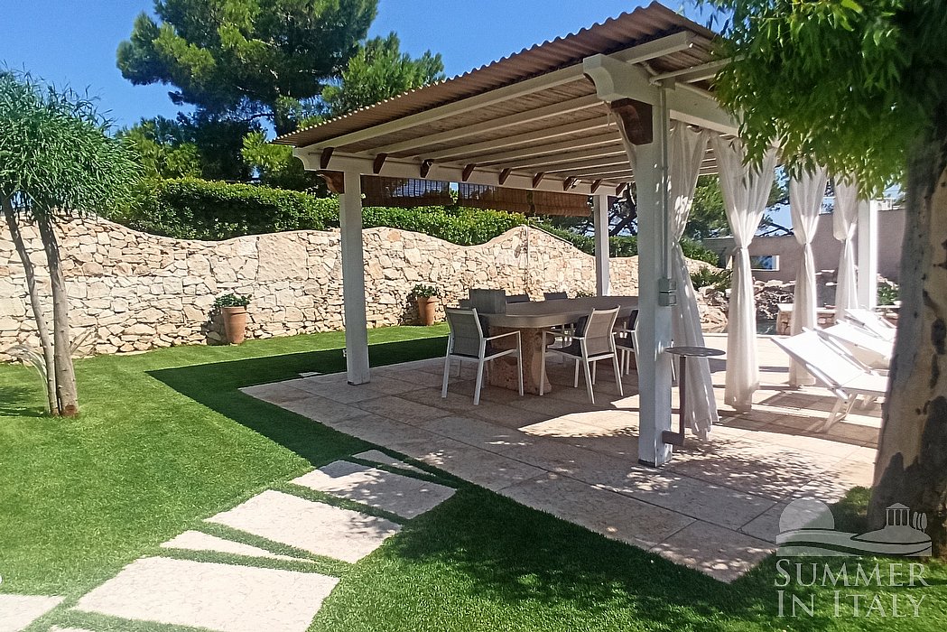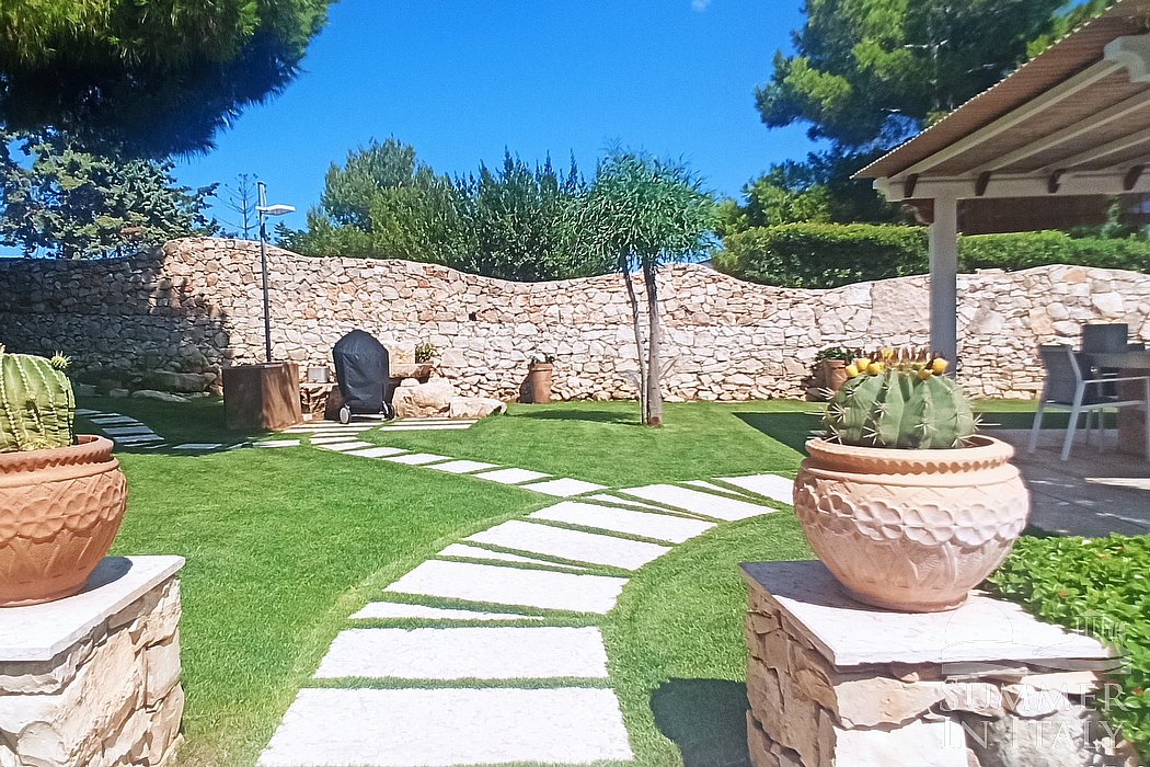 You will reach the garden from the patio going up approximately 17 stairway steps. The garden is 800 square meters (8610 square feet). It is partly shaded by tall trees and by awnings. It is equipped with a table, chairs, sun loungers and a wooden gazebo. Here you will also find a portable barbecue. From the garden you will enjoy a partial view of the sea. You will share the garden with the other guests staying at the complex.