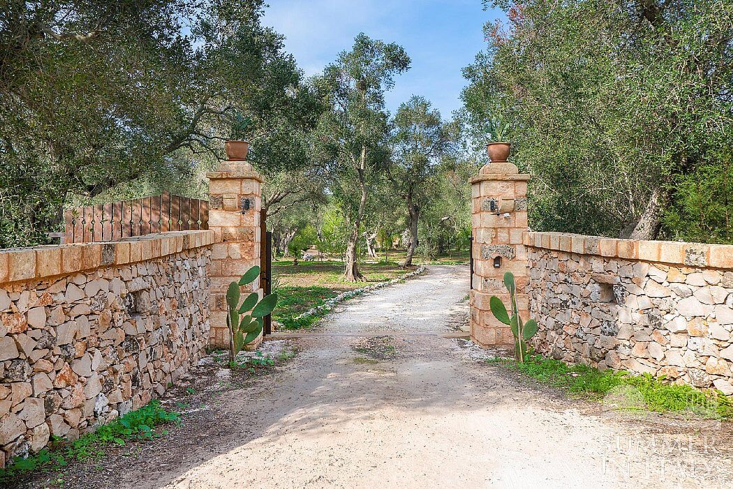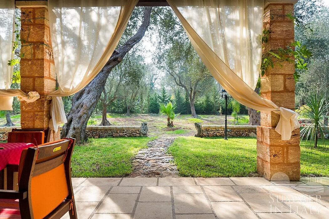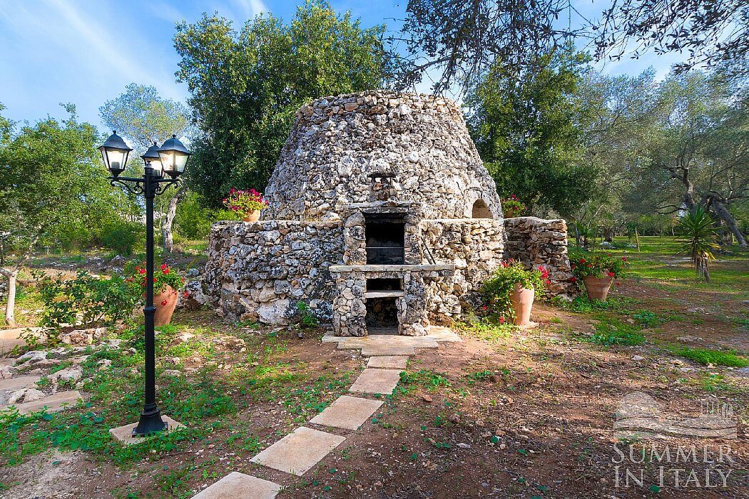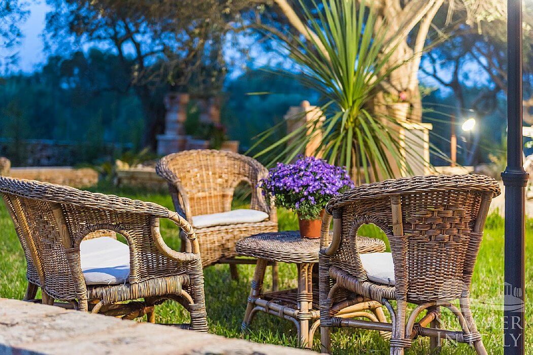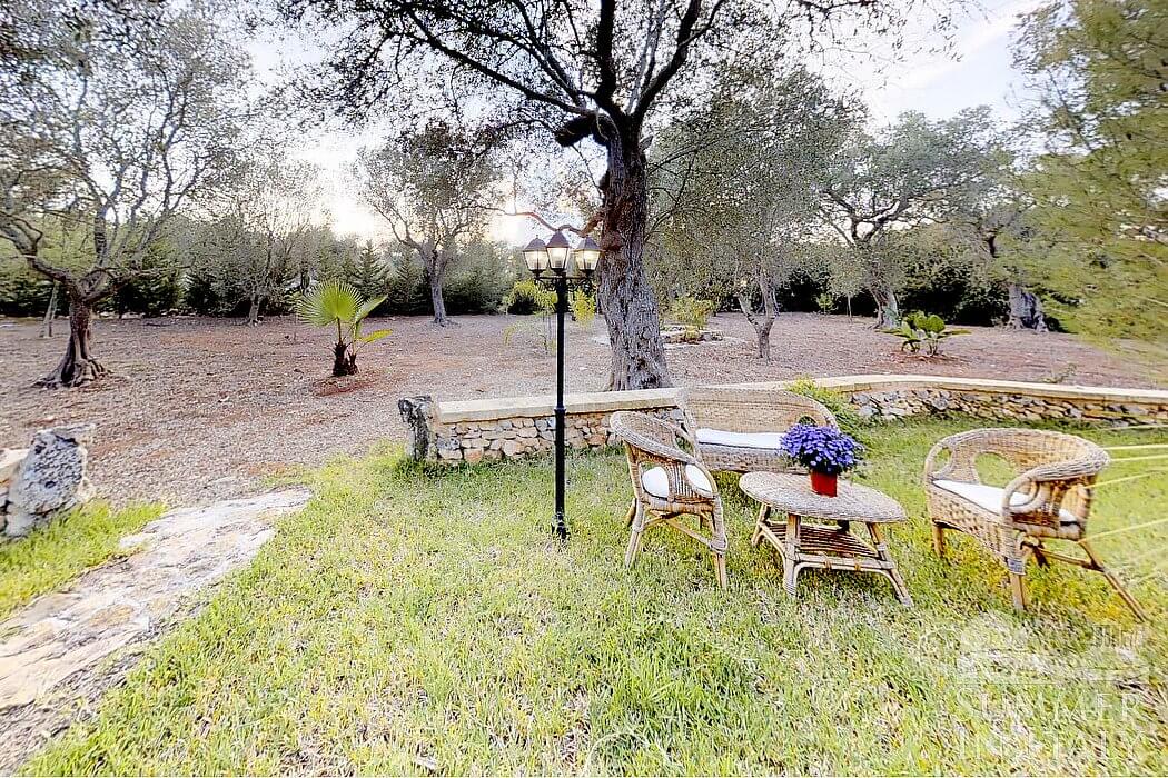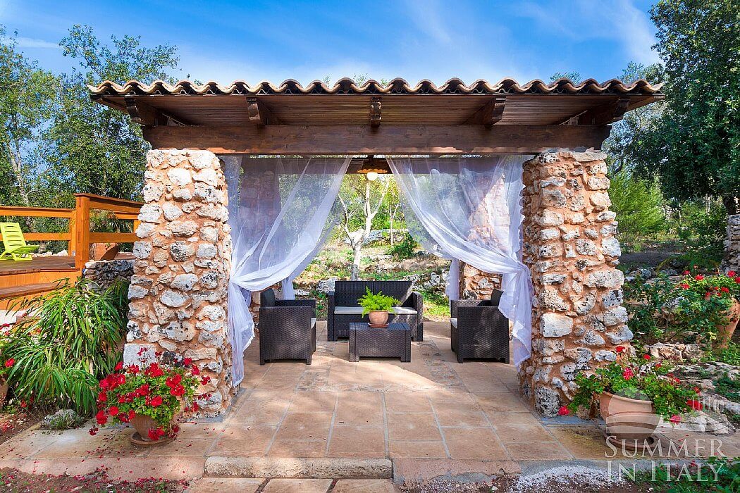 The garden is 10000 square meters (108000 square feet) large. It is partly shaded by characteristic olive trees. The garden is equipped with a small sofa and two armchairs, as well as with a table, chairs, a gazebo and an external shower. Here you will also find a brickwork barbecue. From the garden you will enjoy a characteristic view of the greenery.