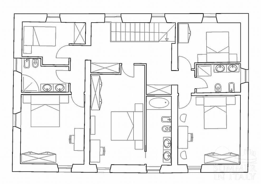 Villa Evarne is an elegant and welcoming two-story villa surrounded by the greenery. It sleeps ten people. From Villa Evarne you will enjoy a broad view of the greenery and of the surrounding countryside. Villa Evarne is 200 square meters (2150 square feet). It features a private swimming pool, a private garden, air conditioning (please read description below to check in which rooms the units are installed), winter heating and WI-FI Internet access.