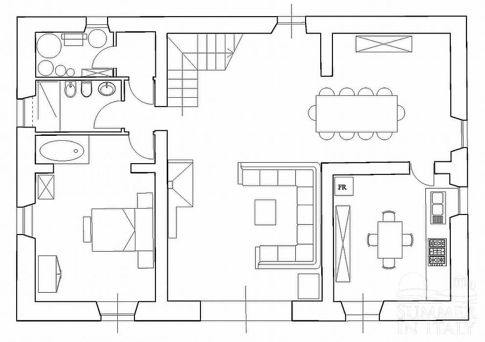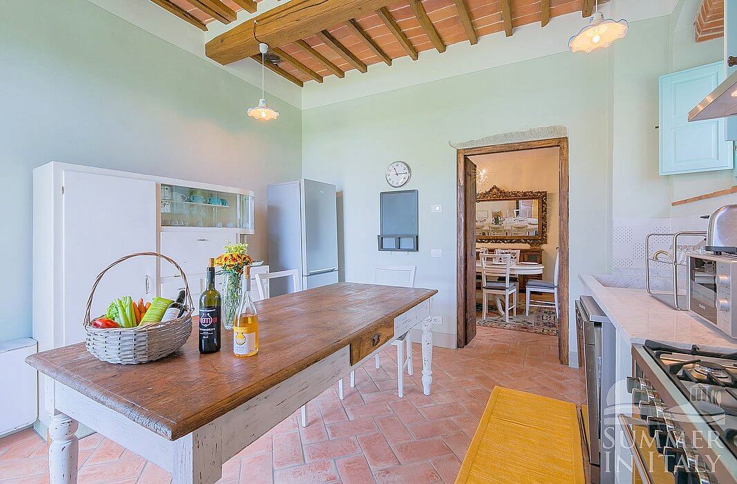 You will be able to enter the kitchen from the living room. It is very well equipped, with a five-burner gas cooker, an electric oven, a refrigerator with freezer, a dishwasher, an Italian-style coffee-maker, an American-style coffee-maker (bring your filters!) and a kettle. The dining table can accommodate six guests. From the kitchen a French door will take you to the garden. The room also has a window.