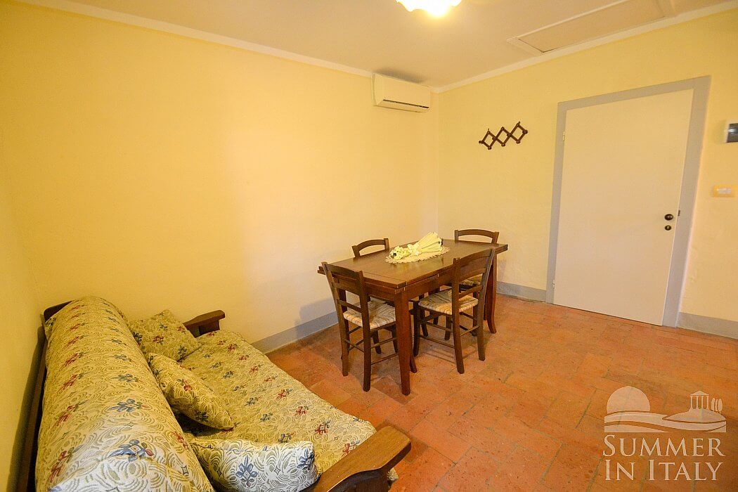 You will be able to enter the second living room from the corridor. The furnishings include a divan that unfolds into a double bed. In the living room you will also find a cooking area. The kitchenette is equipped with a four-burner gas cooker, an electric oven, a refrigerator with freezer, a microwave oven, an Italian-style coffee-maker and other small appliances. The dining table can accommodate six guests. In this room you will find a flat-screen satellite television (local channels). The room is equipped with an air conditioning/heating unit.