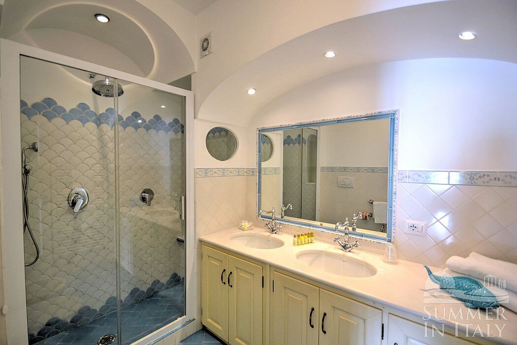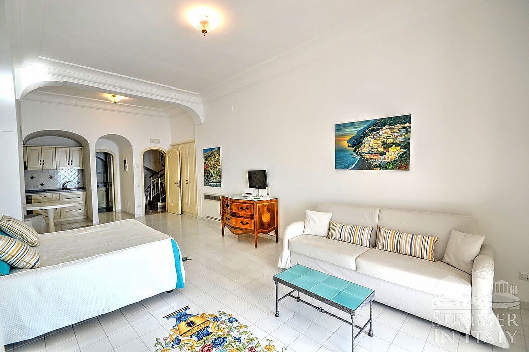 The living room is paved with handmade tiles, in the characteristic style of the Amalfi Coast. The furnishings are elegant and bright. Here you will find a matrimonial bed (160 cm/62 inches, wider than a queen-size bed), that can be split into twins if requested (please contact our staff in advance to make arrangements). The furnishings include a sofa and an armchair. In the living room you will also find a cooking area. The kitchenette is equipped with a four-burner electric cooker, an electric oven, a small refrigerator with freezer, an Italian-style coffee-maker, an American-style coffee-maker (bring your filters!) and a kettle. The dining table can accommodate two guests. In this room you will find a flat-screen television (local channels). From the living room you will be able to enter the terrace with a view of the sea and of Positano through a French door. The room is equipped with an air conditioning/heating unit.