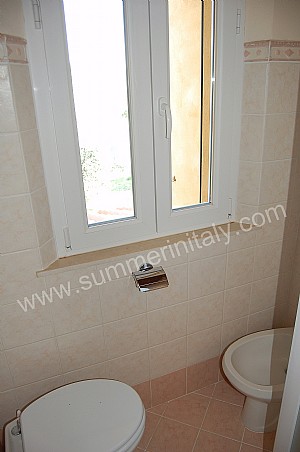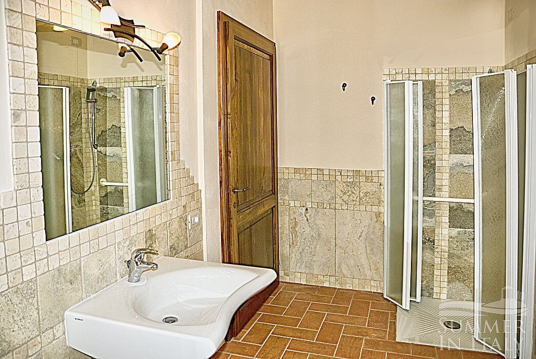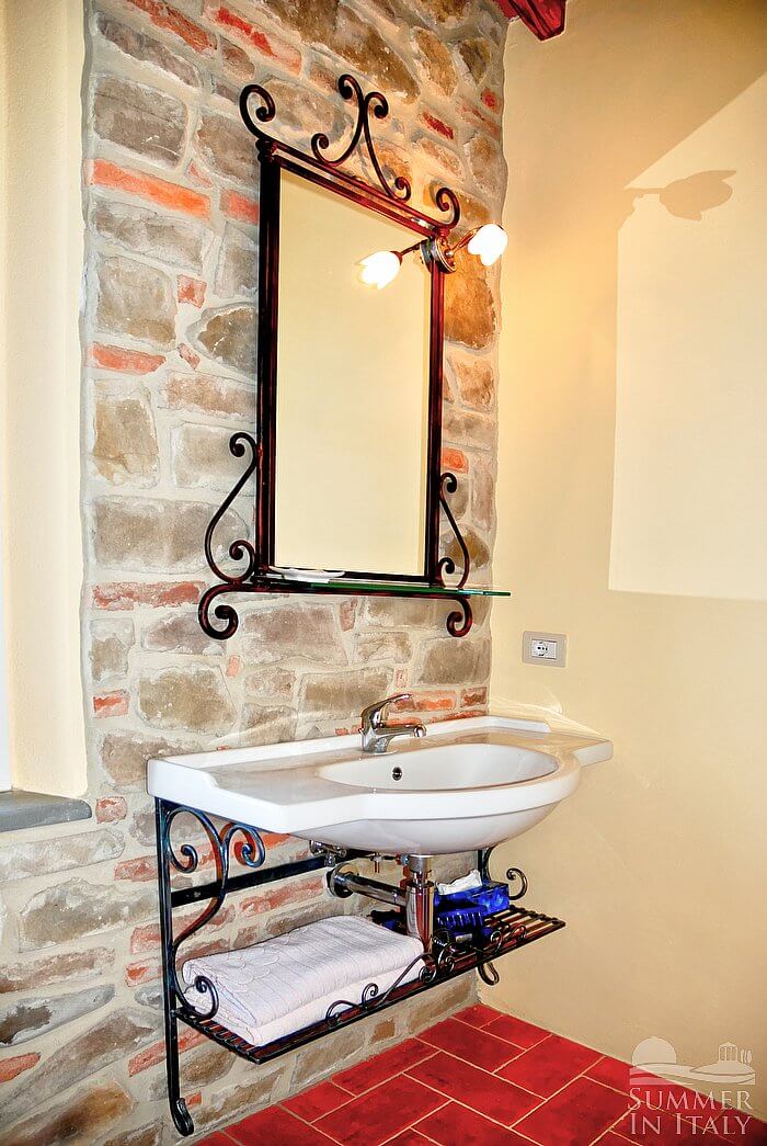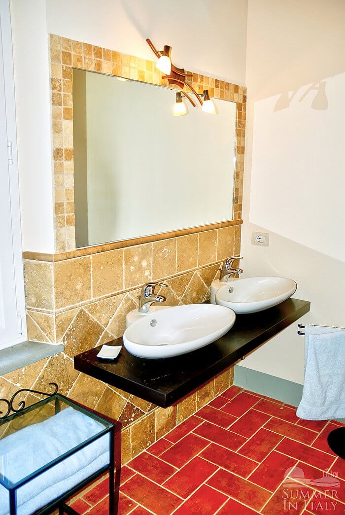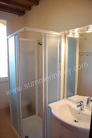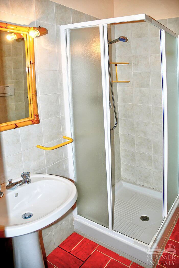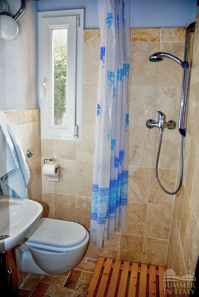 You will be able to enter the fifth bedroom from the corridor. The ceiling is sloped and has characteristic exposed wood beams and terracotta tiles. It has two twin beds (80 cm/32 inches), that can be pushed together into a matrimonial bed if requested (please contact our staff in advance to make arrangements). The room has a window. The bedroom is equipped with an air conditioning/heating unit. This bedroom has an en-suite bathroom, equipped with a washbasin, a toilet and a shower.