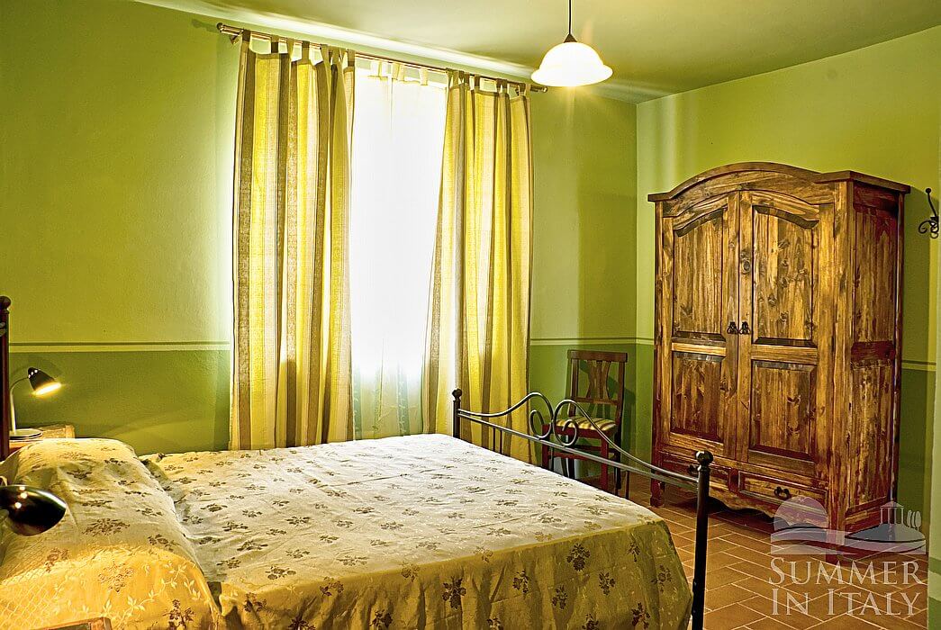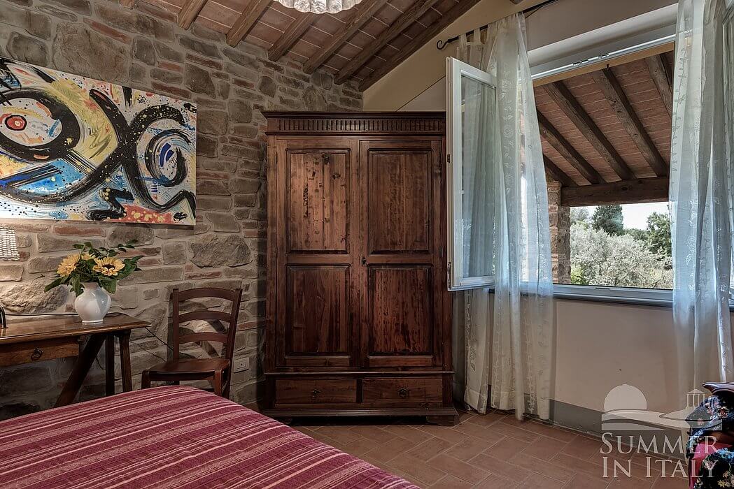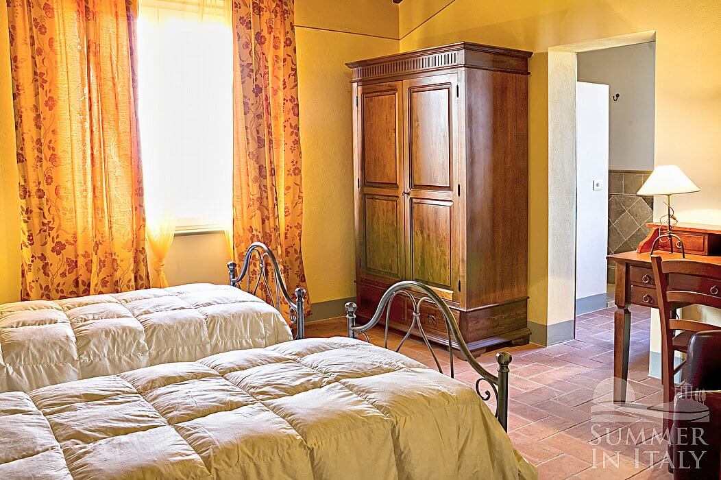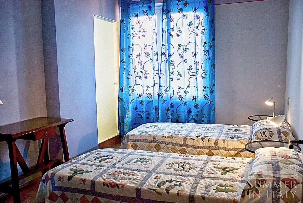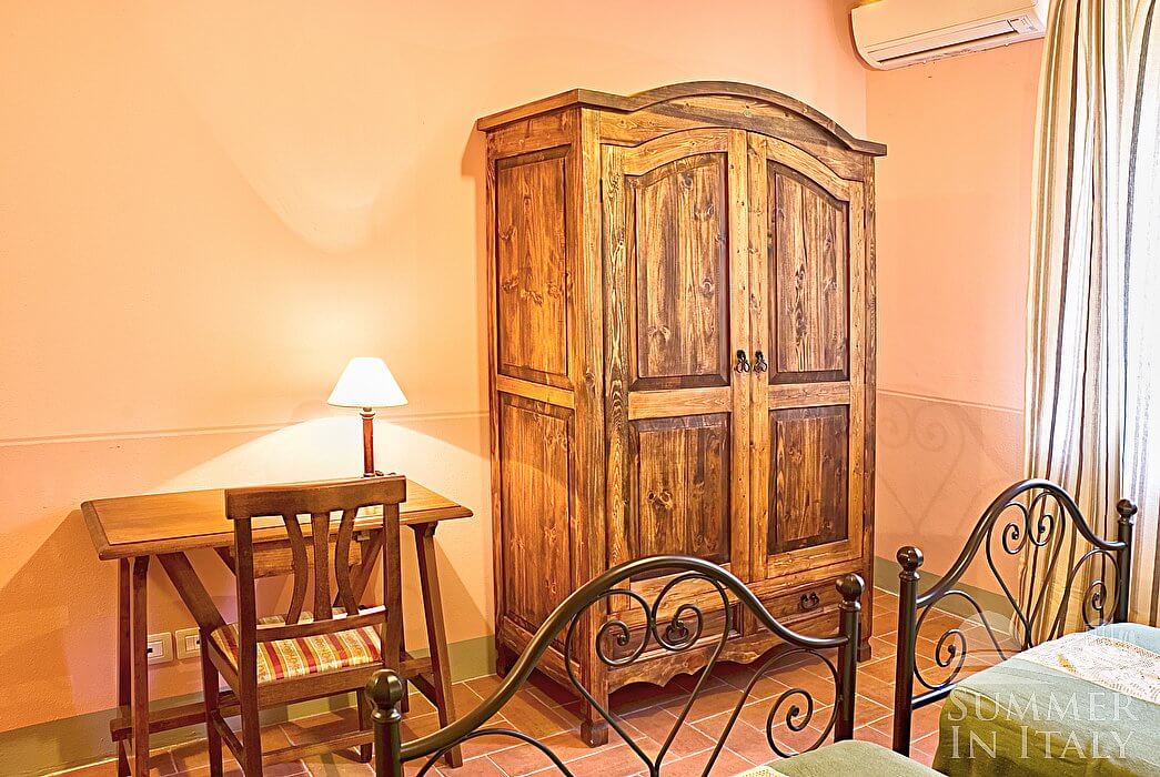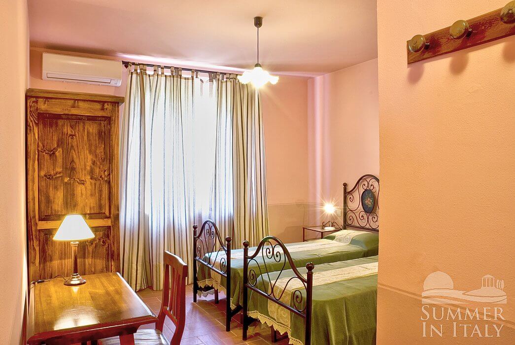 You will be able to enter the sixth bedroom from the corridor. The ceiling is sloped and has characteristic exposed wood beams and terracotta tiles. The room has a matrimonial bed (160 cm/63 inches, wider than a queen-size bed), that can be split into twins if requested (please contact our staff in advance to make arrangements). An additional twin bed (80 cm/32 inches) is available (if requested in advance) to make it a triple room (without exceeding the maximum occupancy of three guests). The room has a window. The bedroom is equipped with an air conditioning/heating unit.