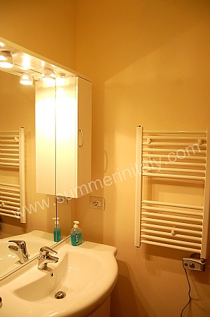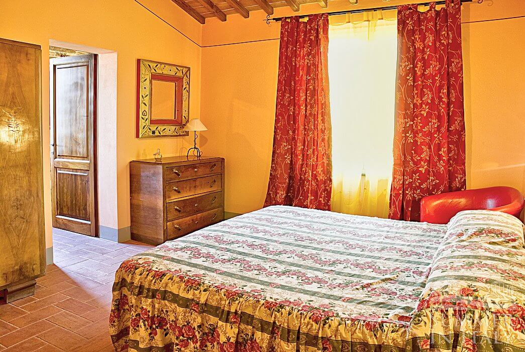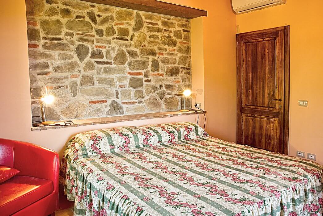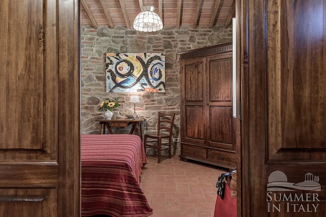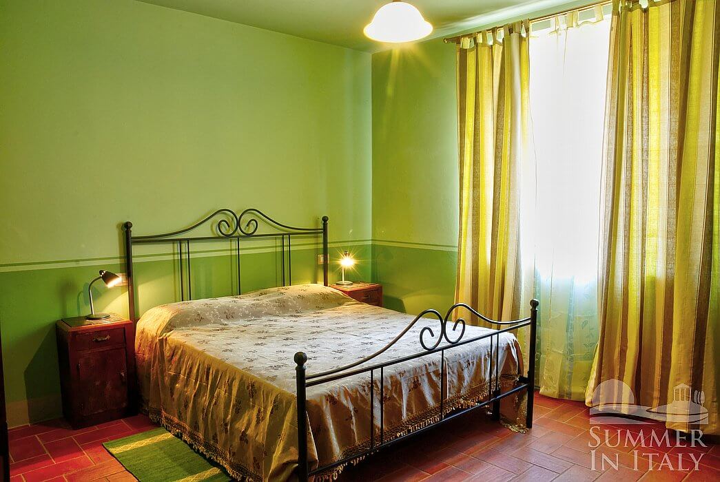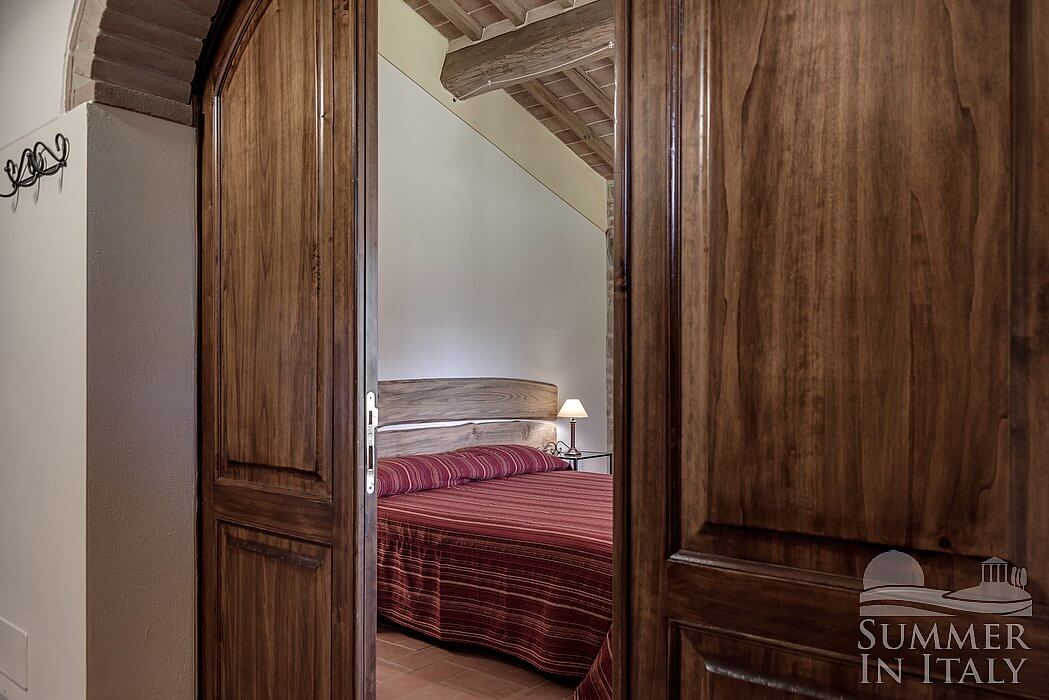 You will be able to enter the sixth bedroom from the corridor. The ceiling is sloped and has characteristic exposed wood beams and terracotta tiles. The room has a matrimonial bed (160 cm/63 inches, wider than a queen-size bed), that can be split into twins if requested (please contact our staff in advance to make arrangements). An additional twin bed (80 cm/32 inches) is available (if requested in advance) to make it a triple room (without exceeding the maximum occupancy of three guests). The room has a window. The bedroom is equipped with an air conditioning/heating unit.