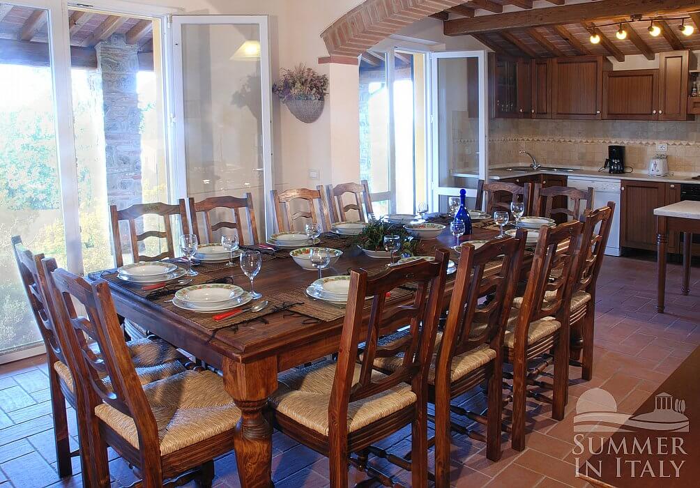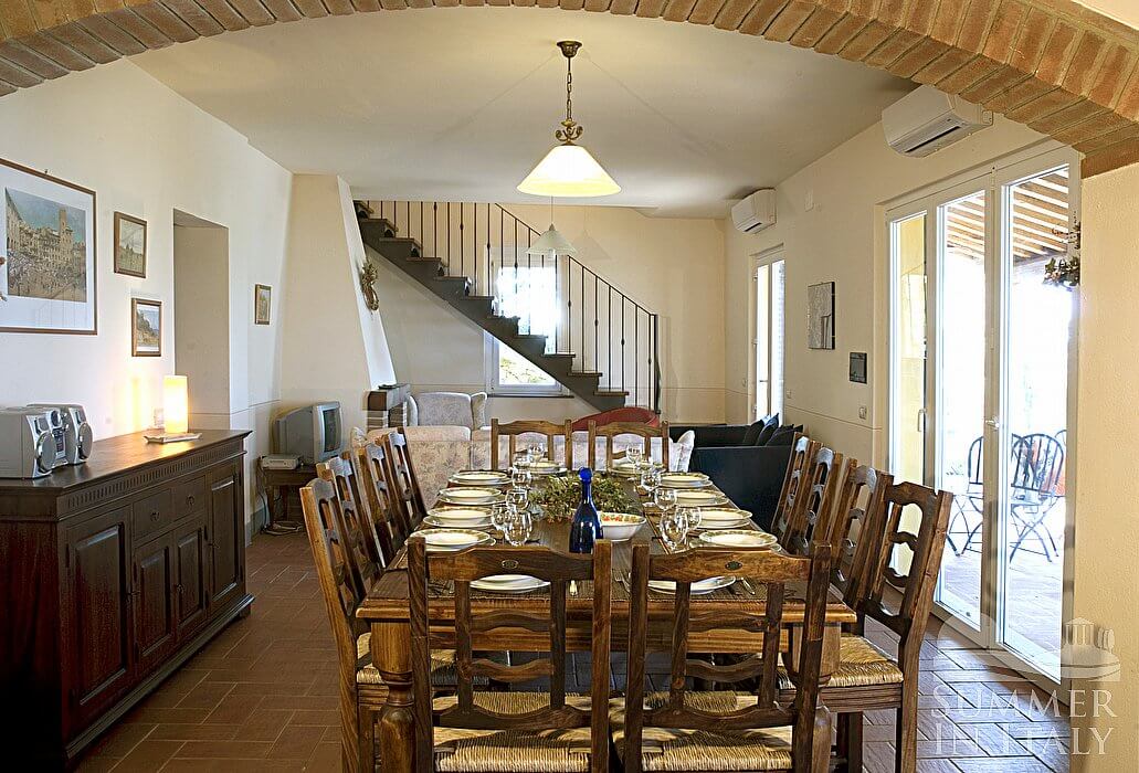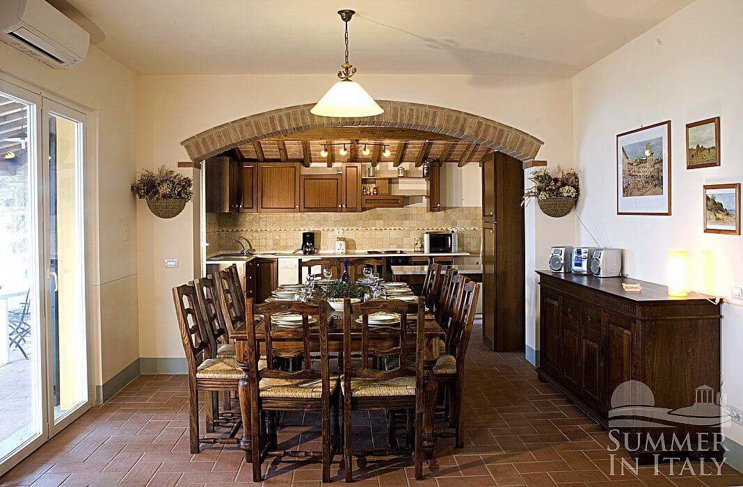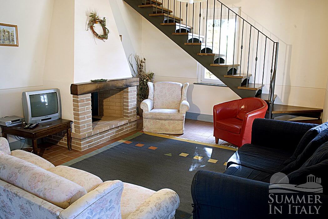 The living room is paved with Tuscan terracotta tiles. The furnishings are warm and welcoming. The furnishings include two sofas and two armchairs. There is a big fireplace made of bricks. In the living room you will also find a cooking area. The kitchenette is equipped with a four-burner gas cooker, an electric oven, a refrigerator with freezer, a dishwasher, a microwave oven, an Italian-style coffee-maker and an American-style coffee-maker (bring your filters!). The dining table can accommodate 12 guests. In this room you will find a television (local channels). From the living room you will be able to enter the patio and the garden through three French doors. The room has a window with a view of the greenery. It is equipped with an air conditioning/heating unit.