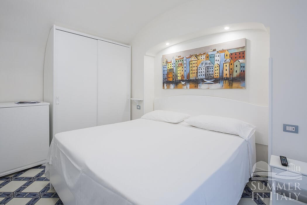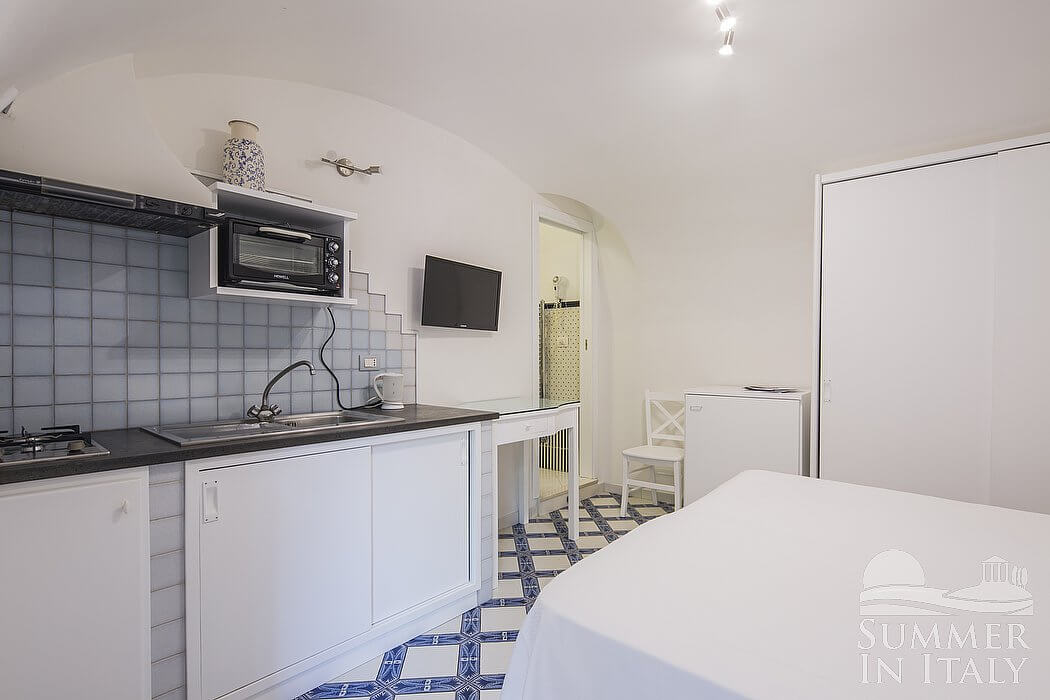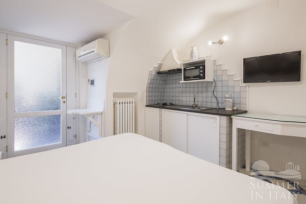 The kitchen is paved with tiles with inlaid designs. The ceiling is vaulted. The furnishings are simple and comfortable. It is equipped with a two-burner gas cooker, a small electric oven, a small refrigerator without freezer, an Italian-style coffee-maker and a kettle. The dining table is a small wall mounted table, and can accommodate one guest. Here you will also find a matrimonial bed (160 cm/63 inches, wider than a queen-size bed) and a satellite television (local channels). From the kitchen a French door will take you to the patio. The kitchen is equipped with an air conditioning/heating unit.
