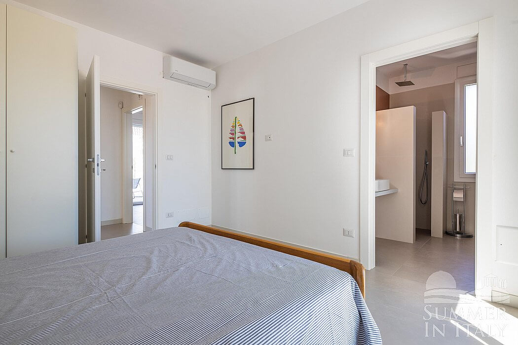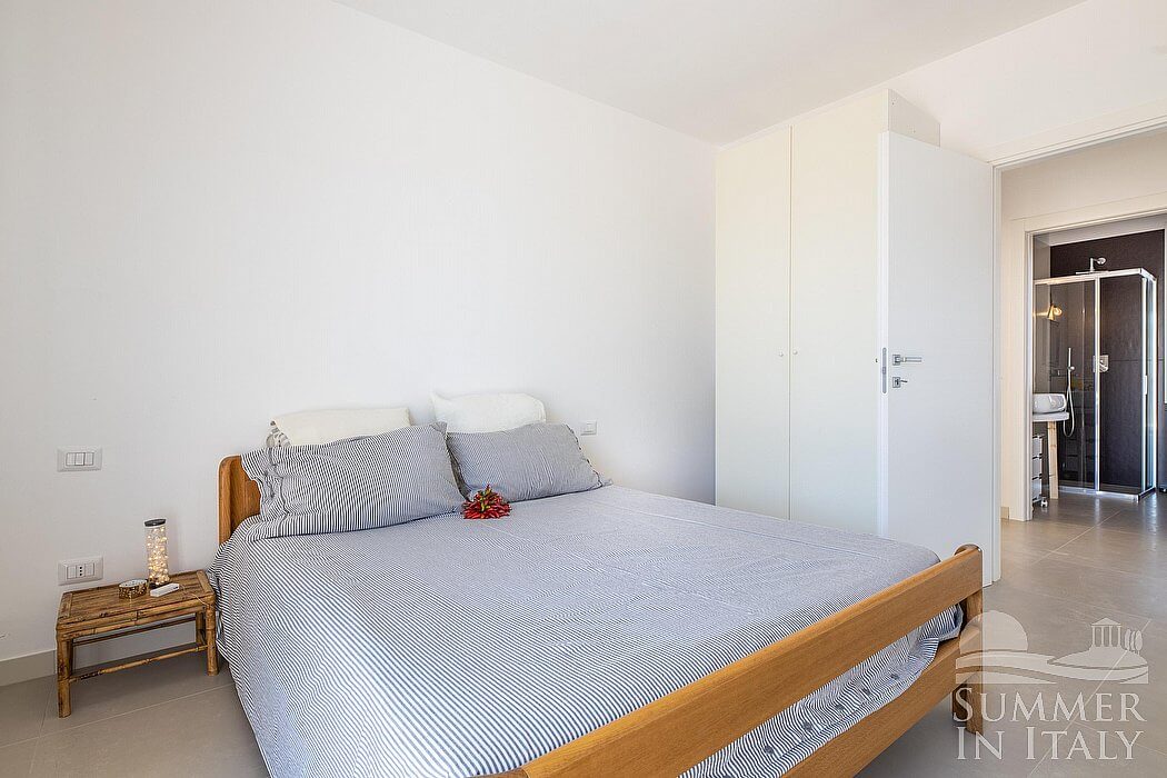 The furnishings of the living room are bright and agreeable, and include a divan bed for one guest (available upon request with an additional cost -- please contact our staff in advance). In the living room you will also find a cooking area. The kitchenette is equipped with a four-burner induction cooker, a small electric oven, a refrigerator with freezer, a dishwasher, a microwave oven and an Italian-style coffee-maker. The dining table can accommodate eight guests. In this room you will find a television (local channels). From the living room you will be able to enter the patio and the swimming pool through three French doors. The room also has a small window. It is equipped with an air conditioning/heating unit.