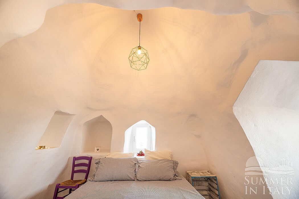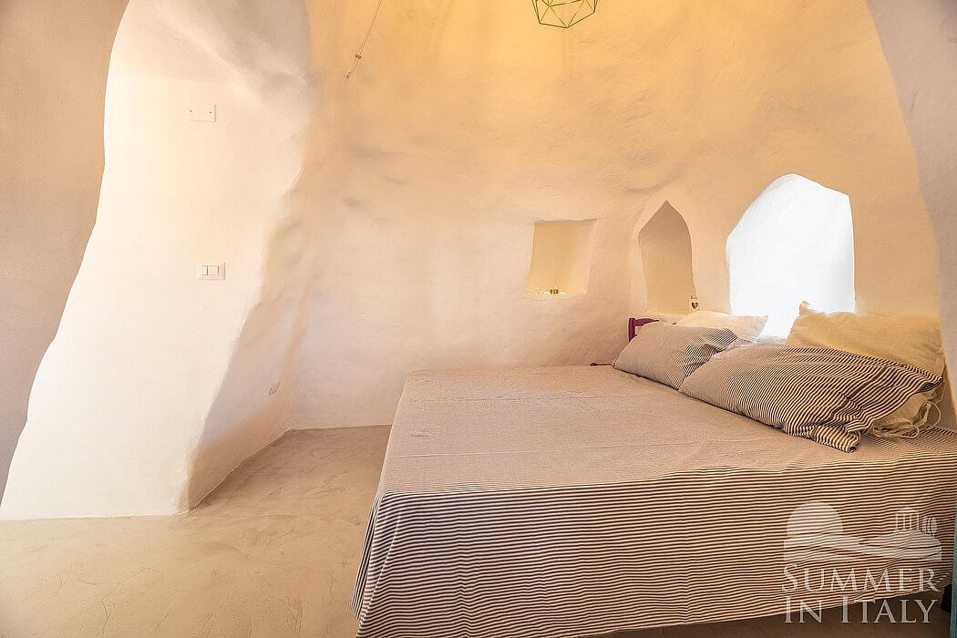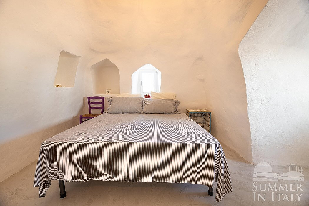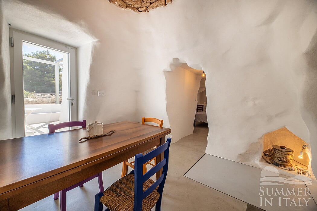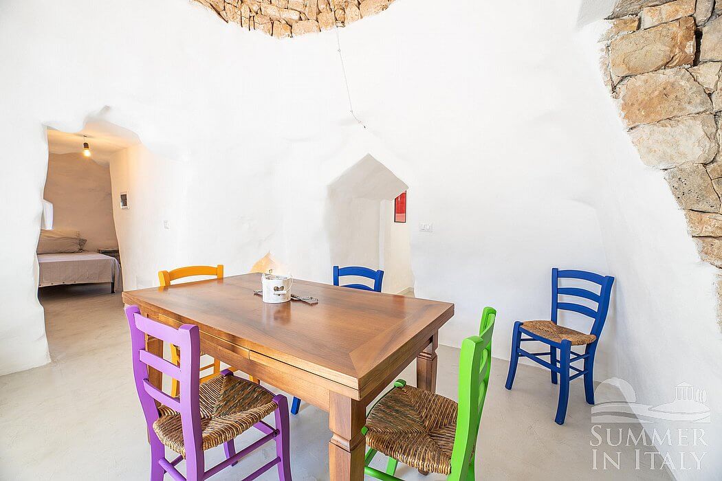 You will be able to enter the dining room from the corridor or from another independent entrance. The ceiling is made of stone and vaulted. The furnishings are rural and characteristic of the house of Apulia. The dining table can accommodate four guests. From the dining room you will be able to enter the second patio through a French door. The room has no windows.