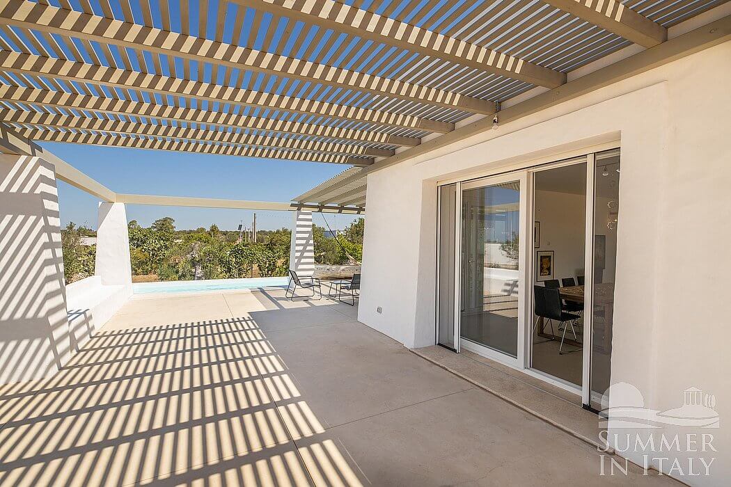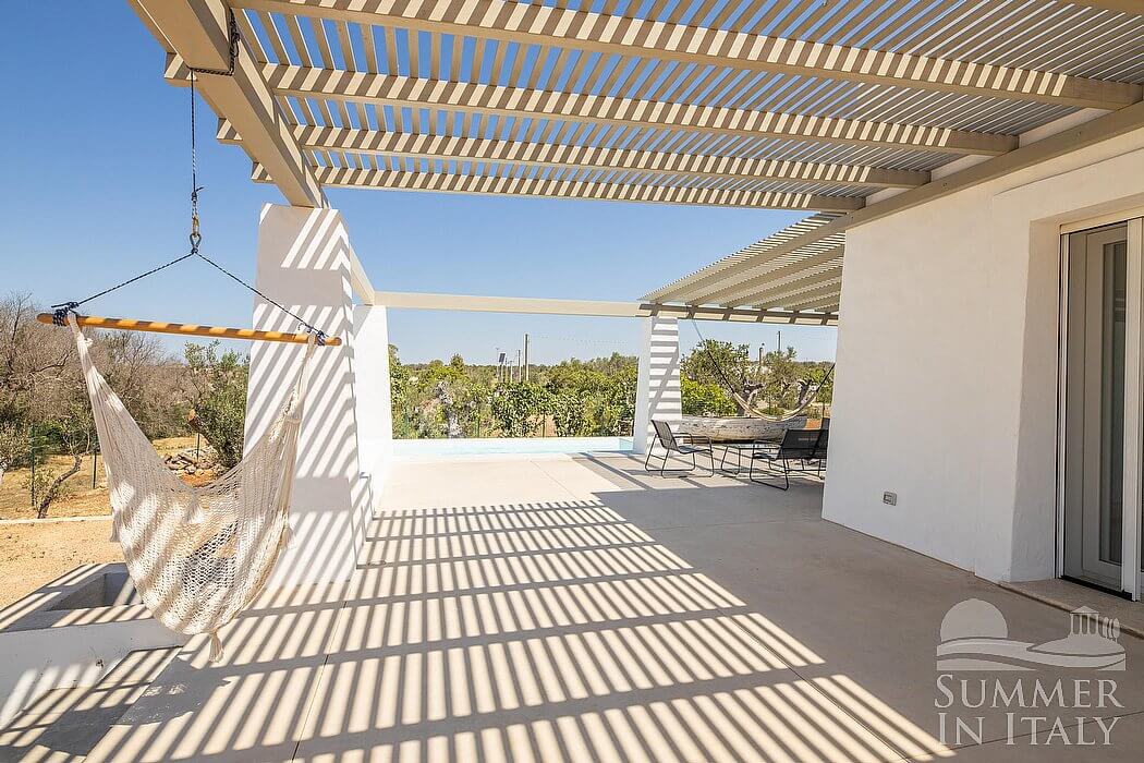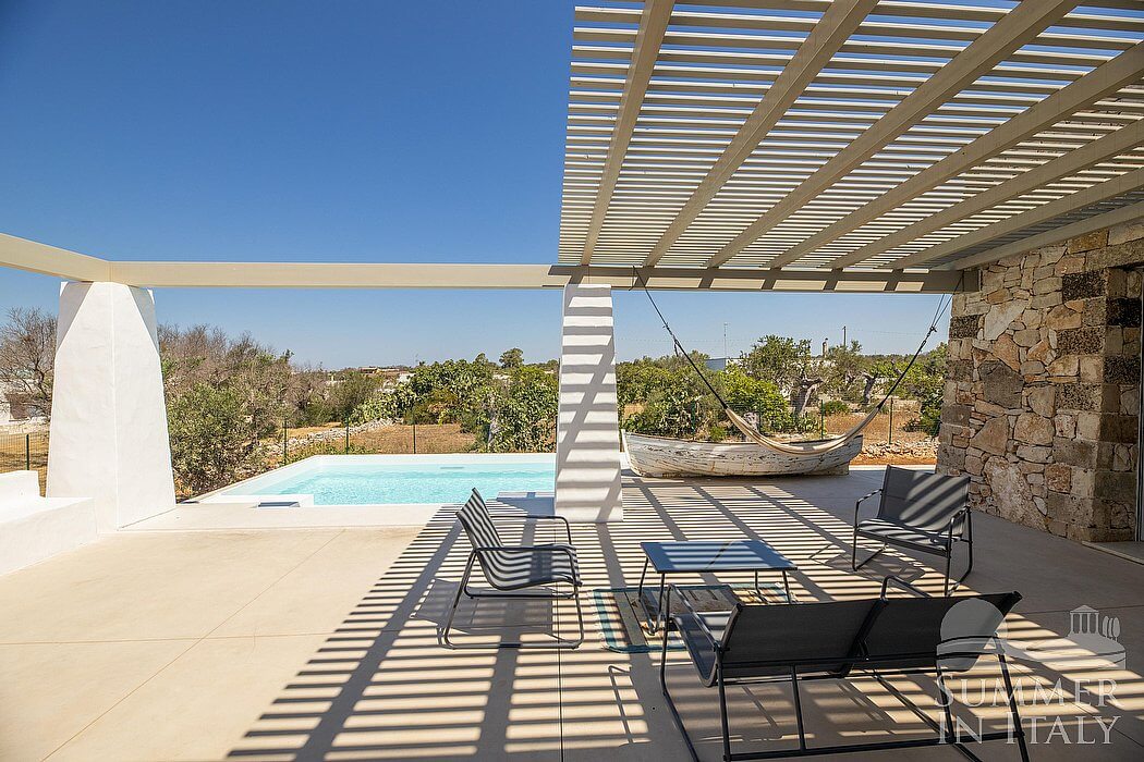 The first patio is 40 square meters (430 square feet) large. It is partly shaded by elegant wood roofs. It is equipped with a small sofa and with chairs, hammocks and an external shower. Here you will also find a brickwork barbecue. From the patio you will enjoy a lovely view of the greenery and of the swimming pool.