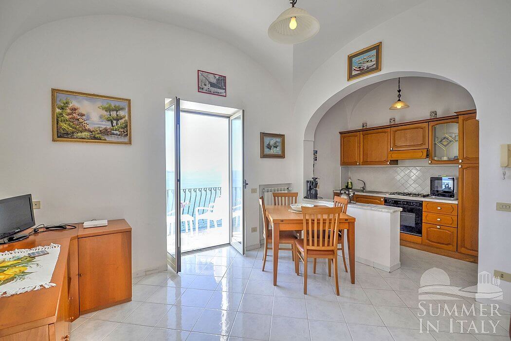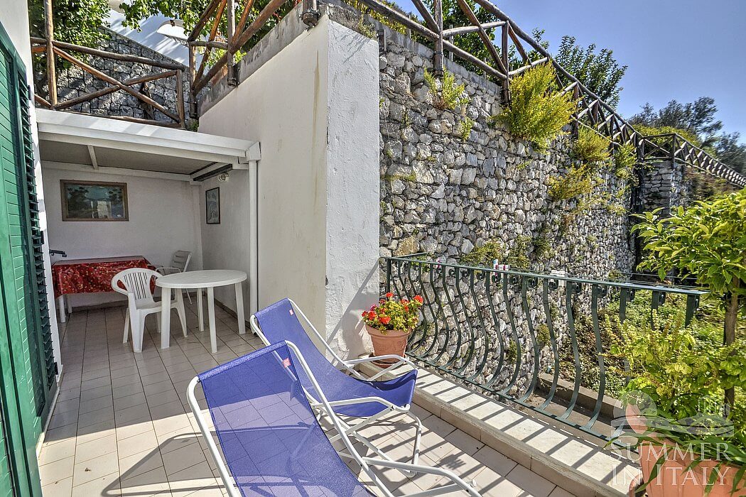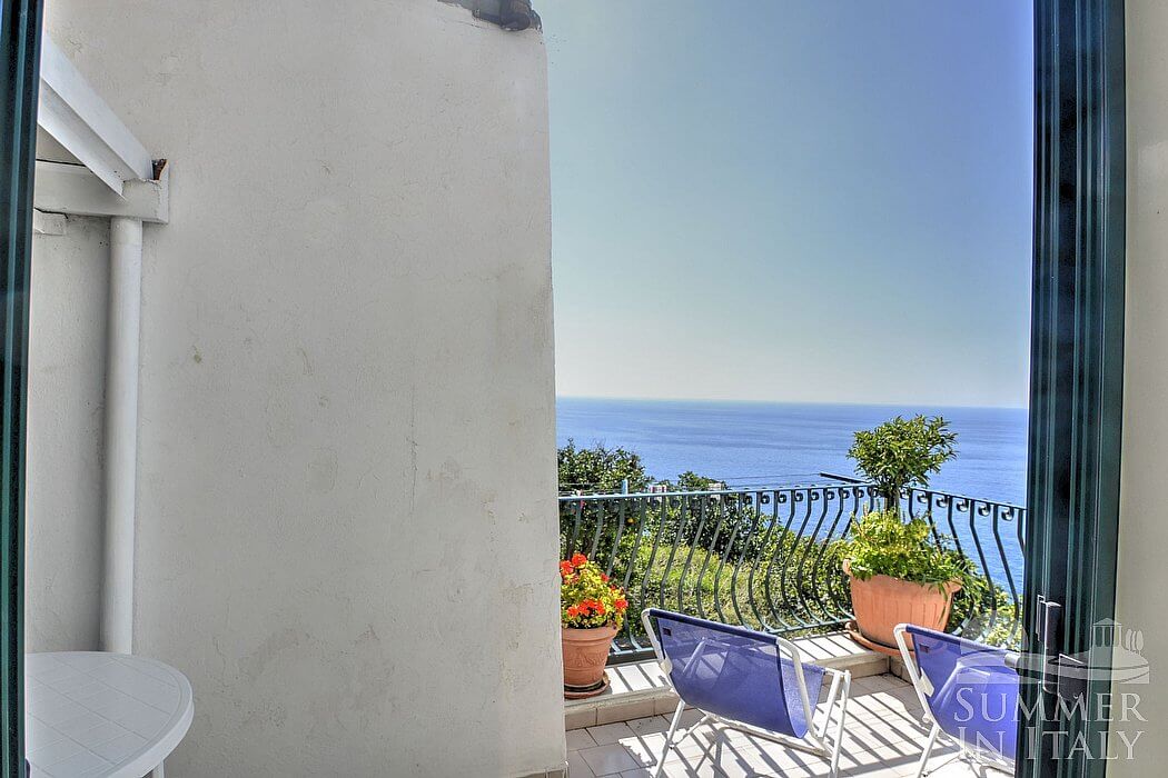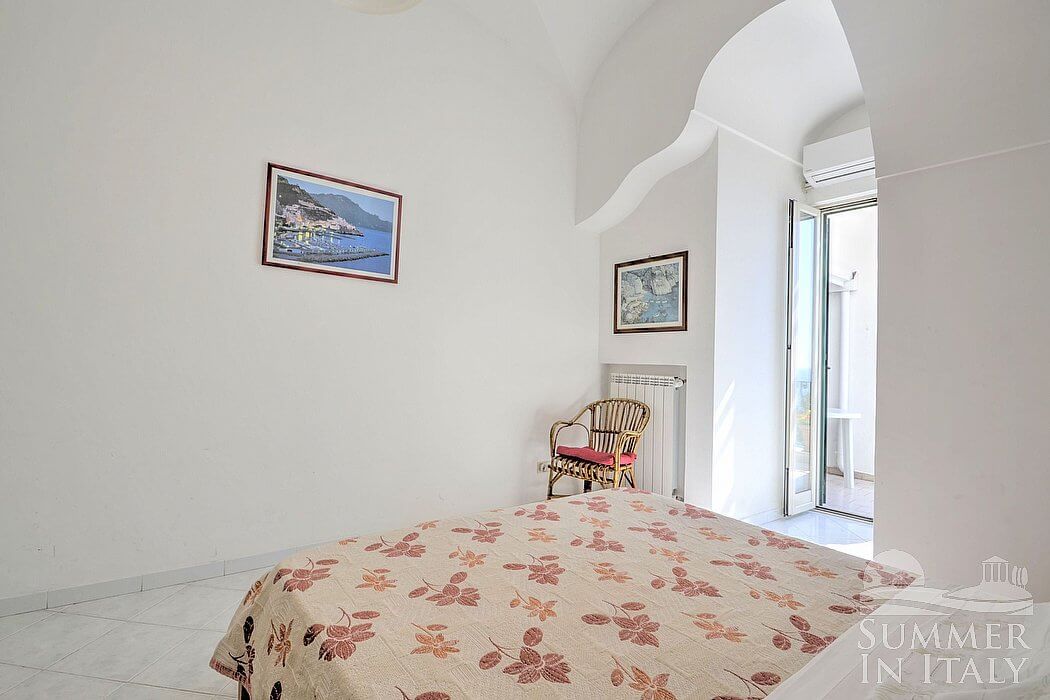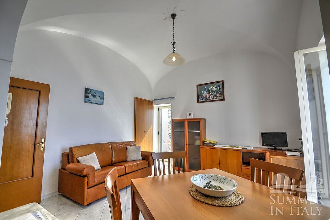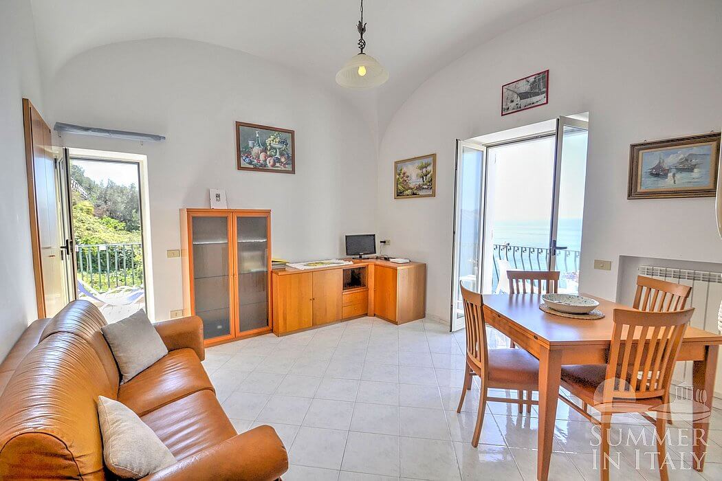 The ceiling of the living room is high and vaulted. The furnishings are cozy and comfortable. The furnishings include a divan that unfolds into a double bed. In the living room you will also find a cooking area. The kitchenette is equipped with a four-burner gas cooker, an electric oven, a refrigerator with freezer, an Italian-style coffee-maker, an American-style coffee-maker (bring your filters!) and a kettle. The dining table can accommodate four guests. In this room you will find a flat-screen television (local channels). From the living room you will be able to enter a balcony with a view of the sea and of the coast of Amalfi through a double-glazed French door.