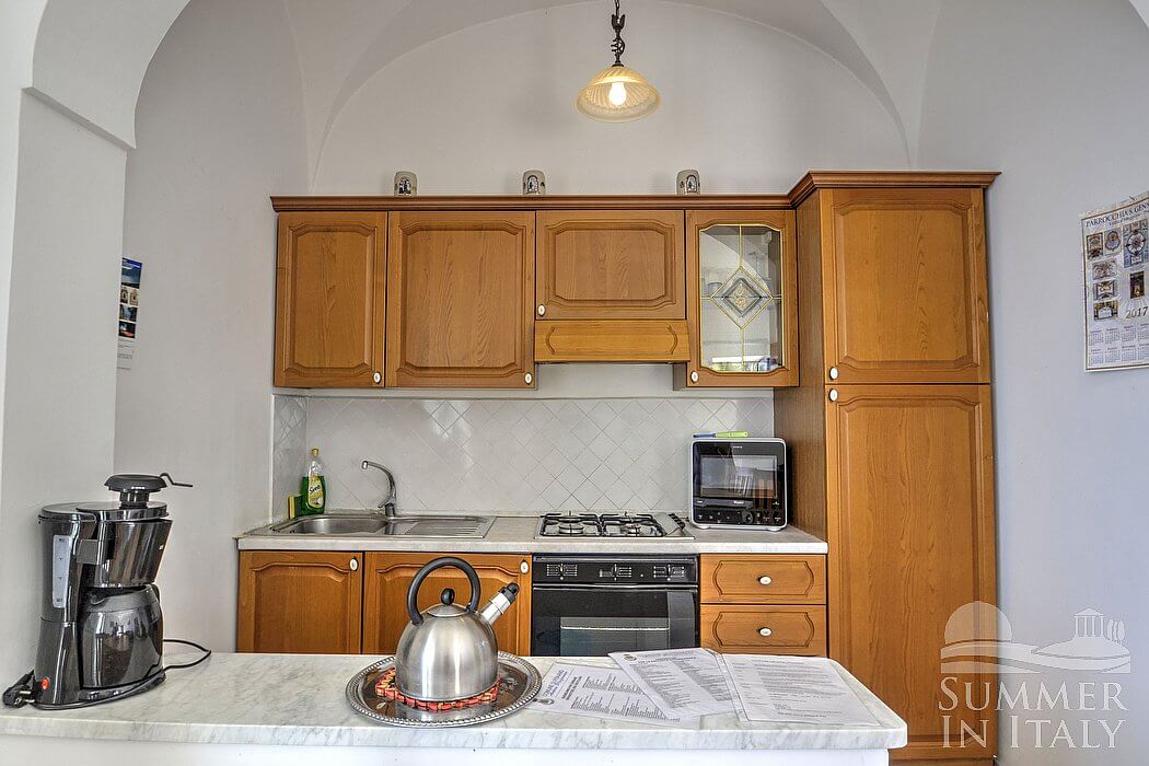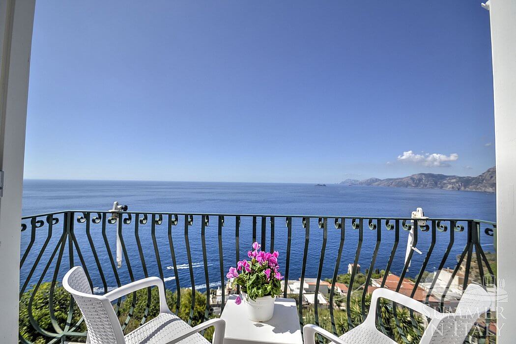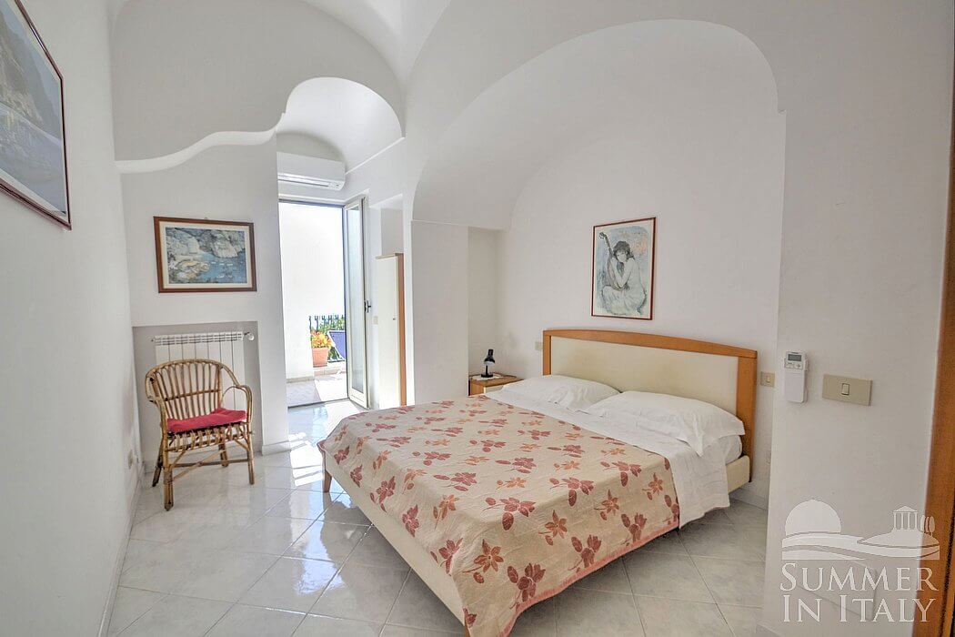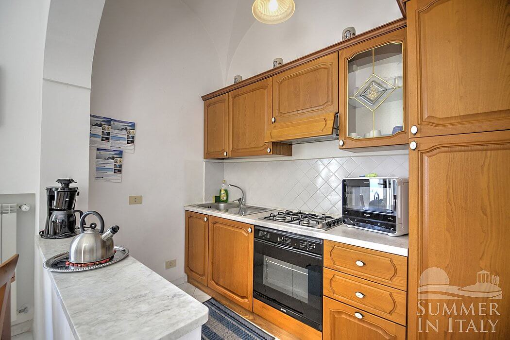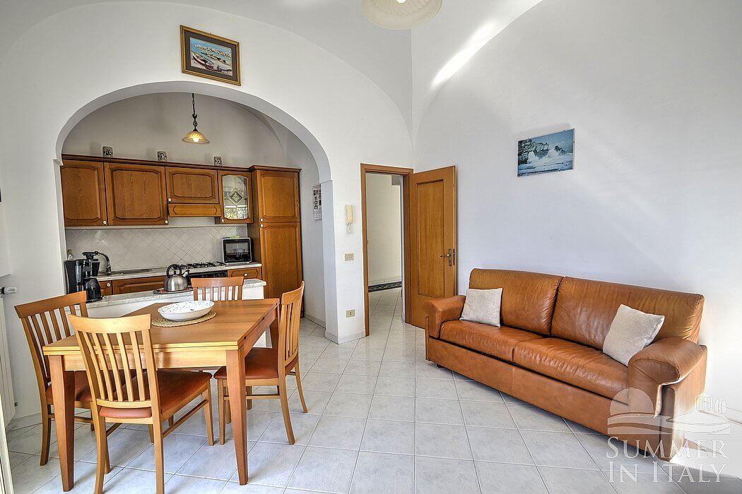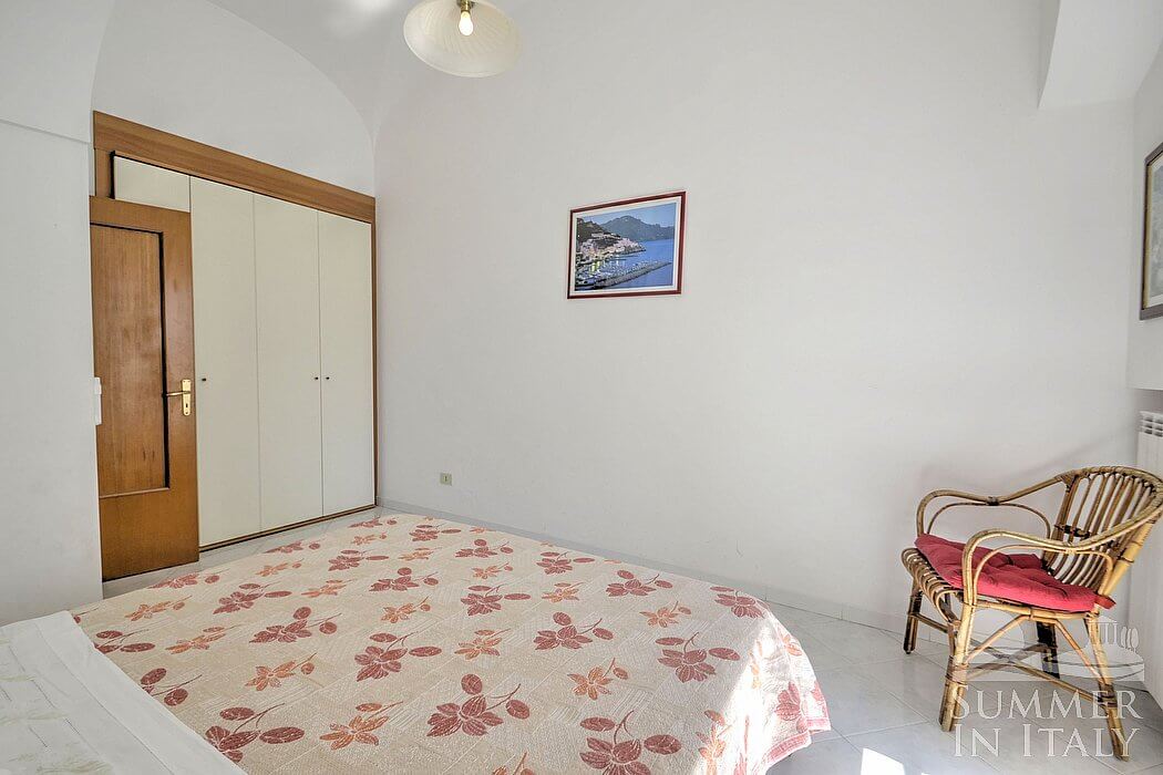 The ceiling of the living room is high and vaulted. The furnishings are cozy and comfortable. The furnishings include a divan that unfolds into a double bed. In the living room you will also find a cooking area. The kitchenette is equipped with a four-burner gas cooker, an electric oven, a refrigerator with freezer, an Italian-style coffee-maker, an American-style coffee-maker (bring your filters!) and a kettle. The dining table can accommodate four guests. In this room you will find a flat-screen television (local channels). From the living room you will be able to enter a balcony with a view of the sea and of the coast of Amalfi through a double-glazed French door.
