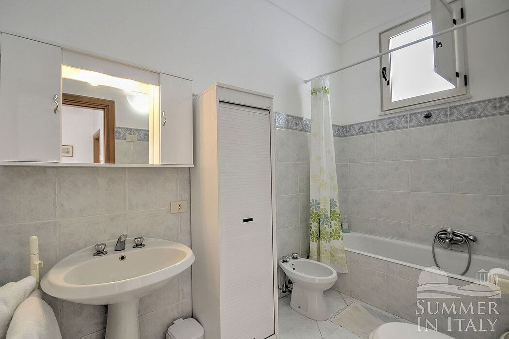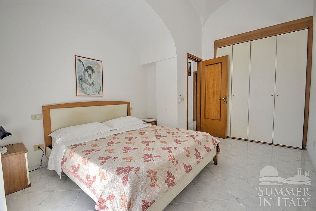 You will be able to enter the bedroom from the corridor. The bedroom has a matrimonial bed (160 cm/62 inches, wider than a queen-size bed). From the bedroom you will be able to enter the terrace with a view of the sea and of the coastline through a French door. The bedroom is equipped with an air conditioning/heating unit.