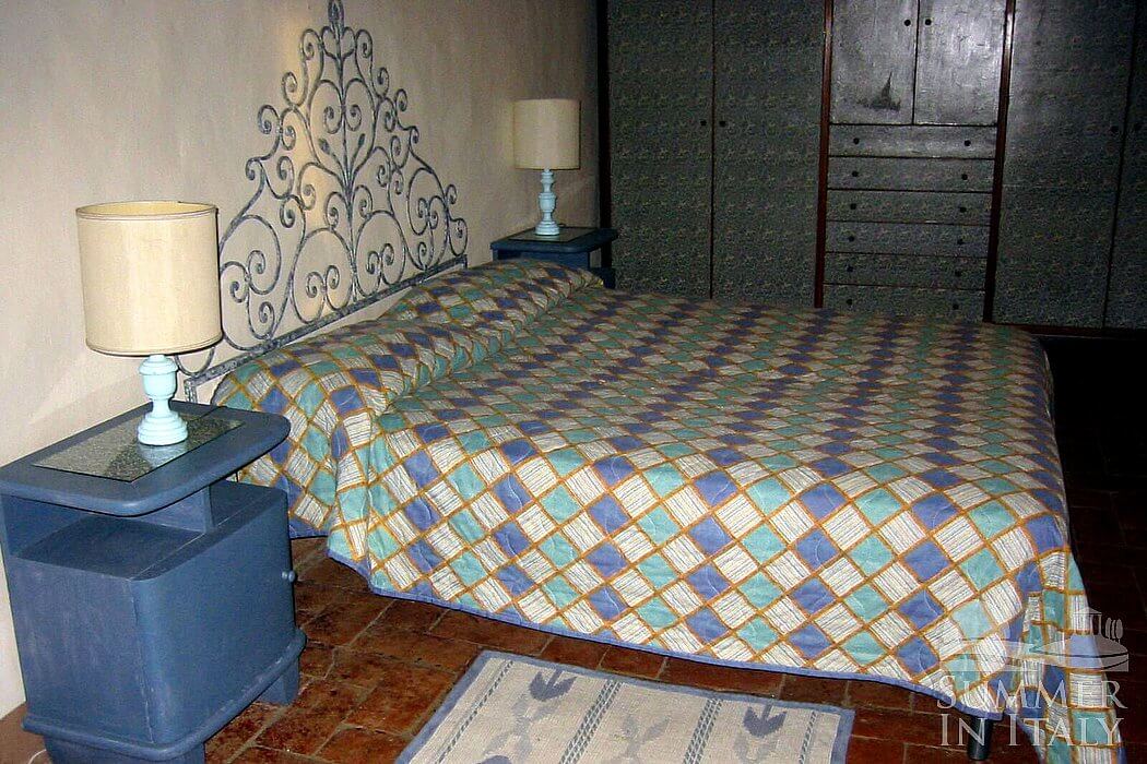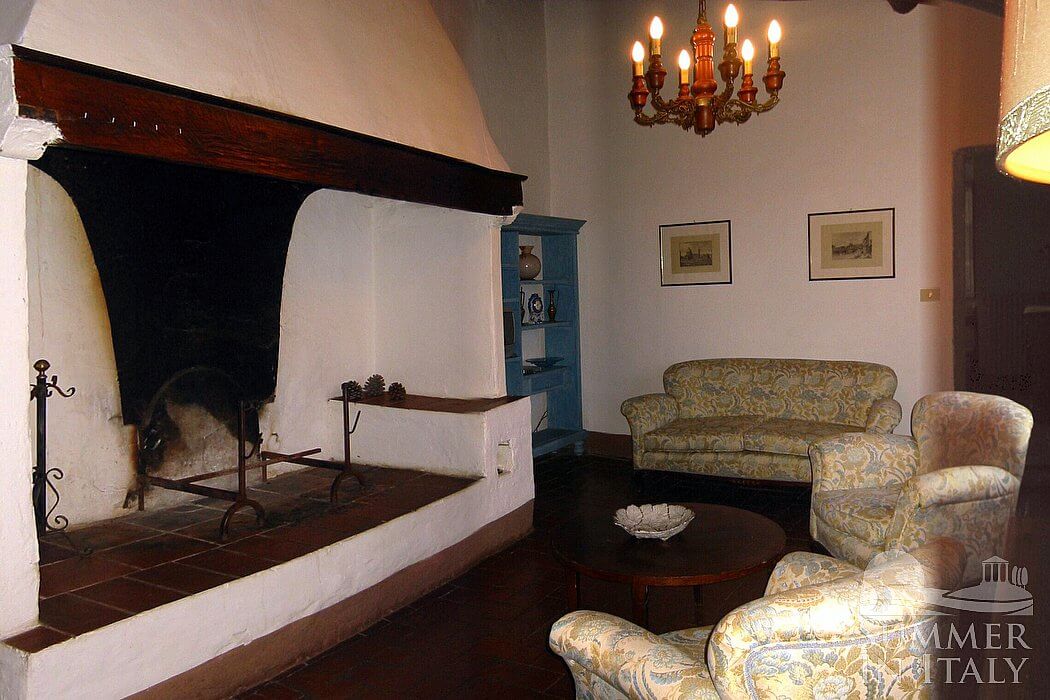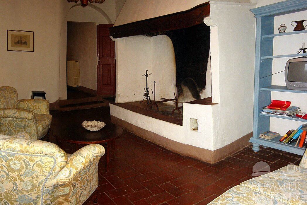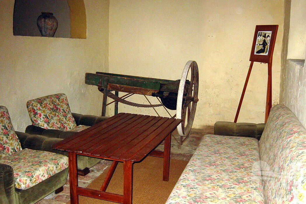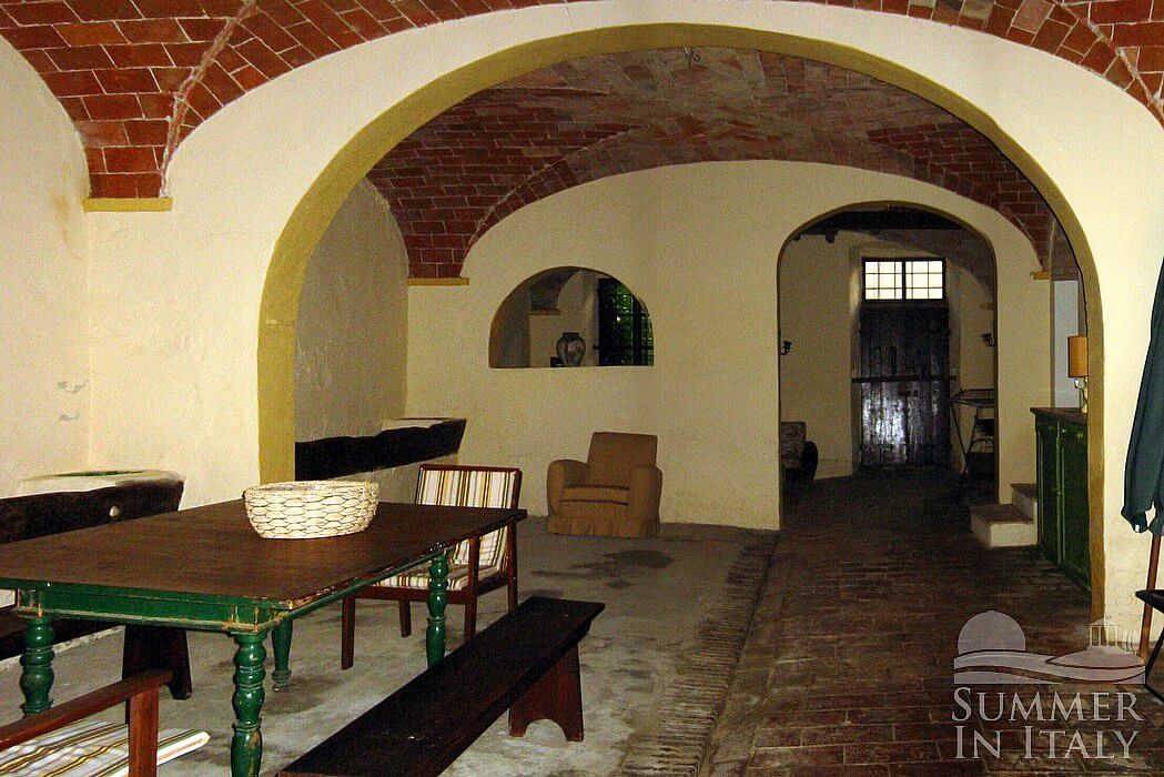 On the ground floor of the villa there are the wine cellars, where the owners of the house still keep the wine in wooden barrels and the olive oil in old terracotta jars. A large room on the ground floor, which features brick vaults and is divided by arches, once being used as a place to fix agricultural tools, has been turned into a pleasant covered living area to the guests of the villa. The room is decorated with age-old rural tools and furnished with a couch, armchairs, a table with chairs, and a barbecue. This room leads to the garden and the swimming-pool. The residential area of the villa is on the first floor. All the rooms are spacious and furnished with family antique furniture.
