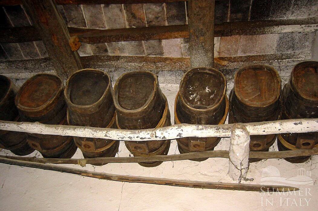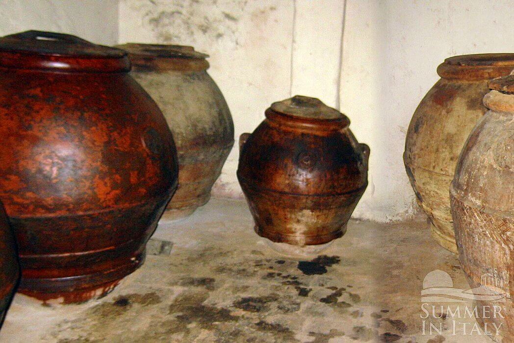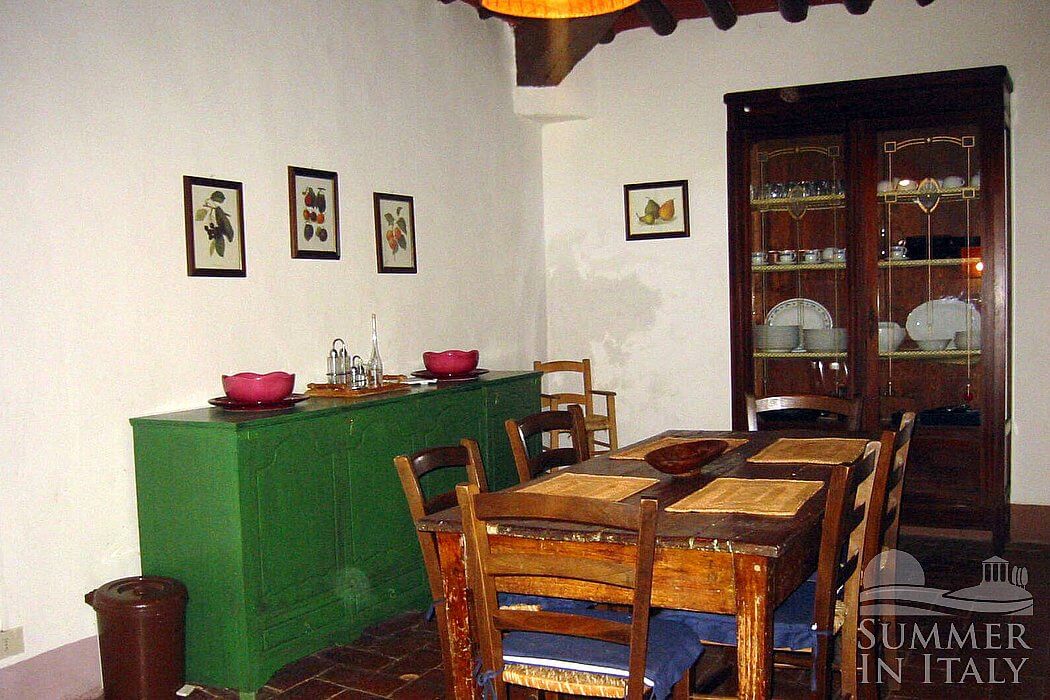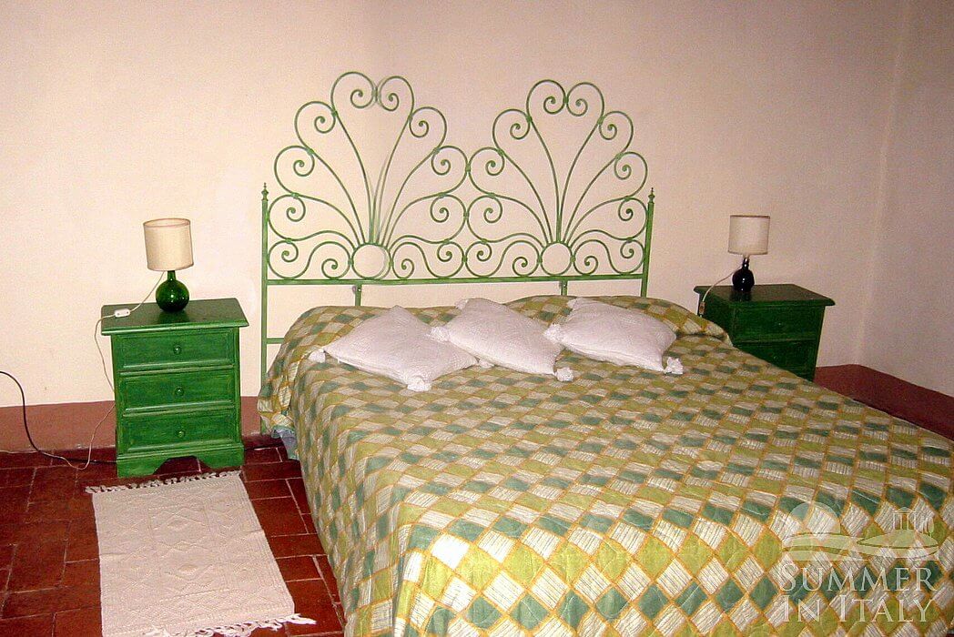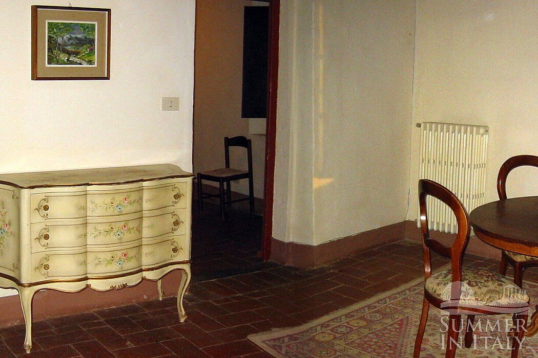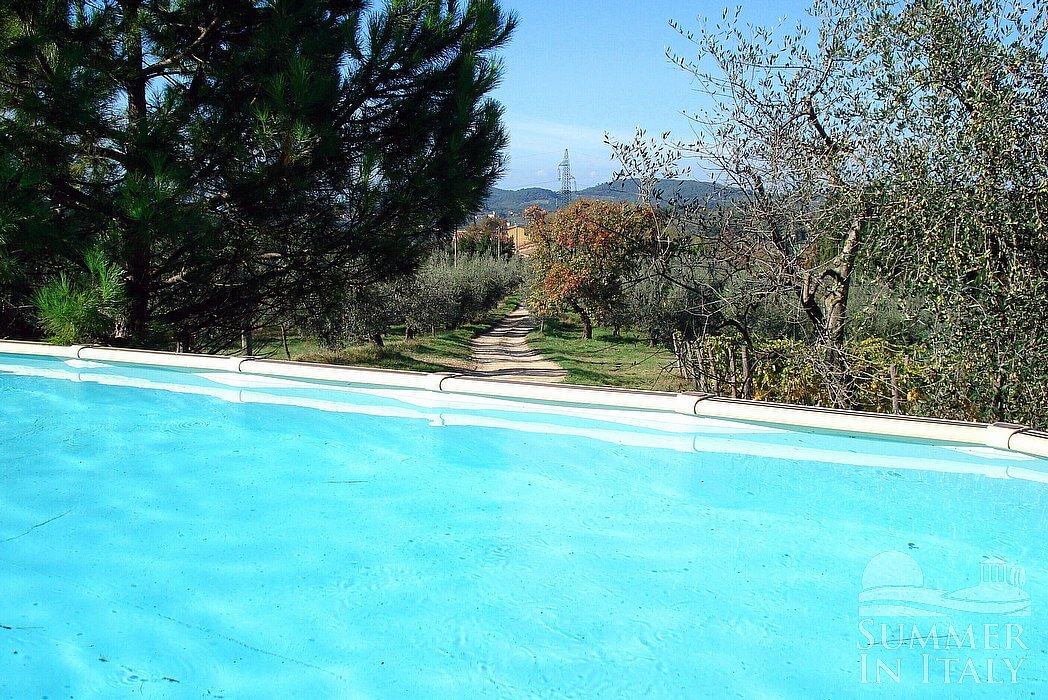 On the ground floor of the villa there are the wine cellars, where the owners of the house still keep the wine in wooden barrels and the olive oil in old terracotta jars. A large room on the ground floor, which features brick vaults and is divided by arches, once being used as a place to fix agricultural tools, has been turned into a pleasant covered living area to the guests of the villa. The room is decorated with age-old rural tools and furnished with a couch, armchairs, a table with chairs, and a barbecue. This room leads to the garden and the swimming-pool. The residential area of the villa is on the first floor. All the rooms are spacious and furnished with family antique furniture.