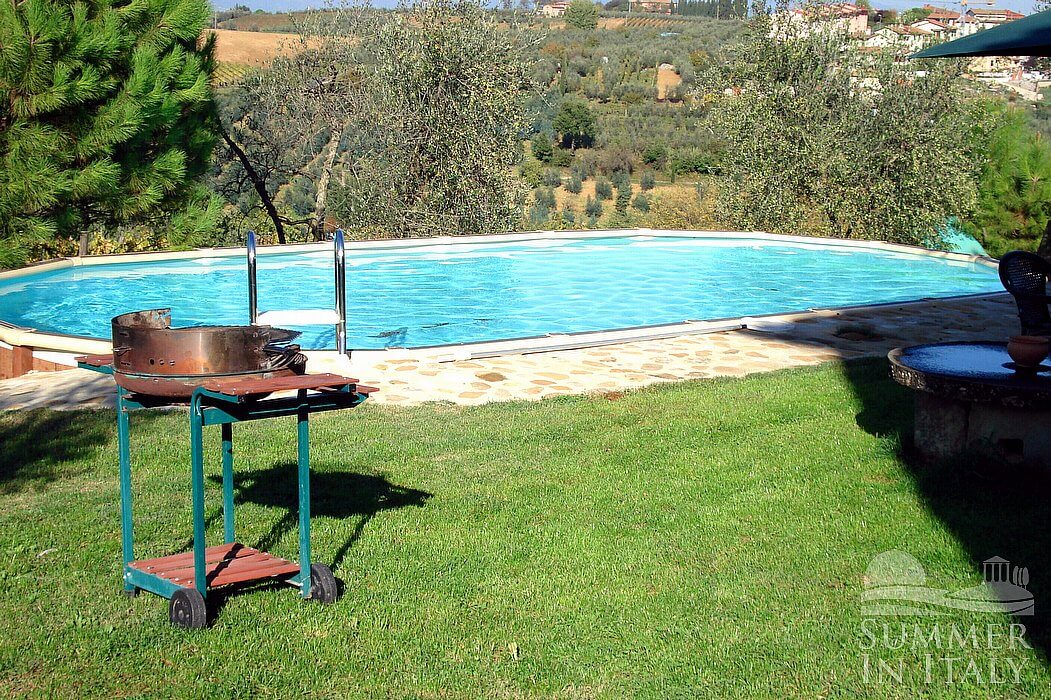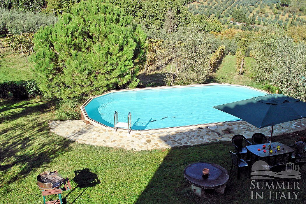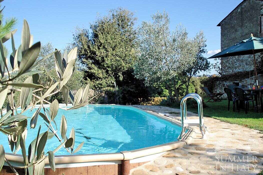 The above-ground swimming pool is 5 meters (16 feet) large by 9 meters (30 feet) long, 1.35 meters (4.4 feet) deep. The area is equipped with a table, chairs, sun umbrellas, deck chairs and sun loungers. From the swimming pool you will enjoy a pleasant view of the Chianti hills and of the surrounding countryside. The pool is open from the beginning of May until mid-October.