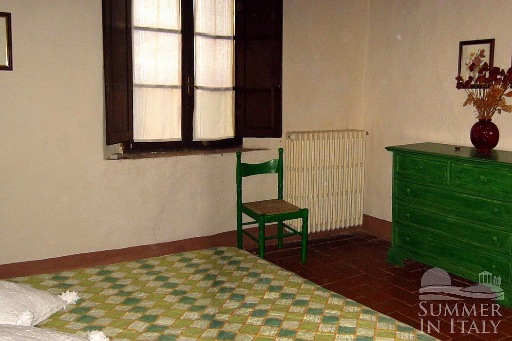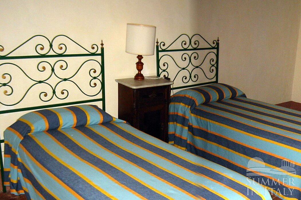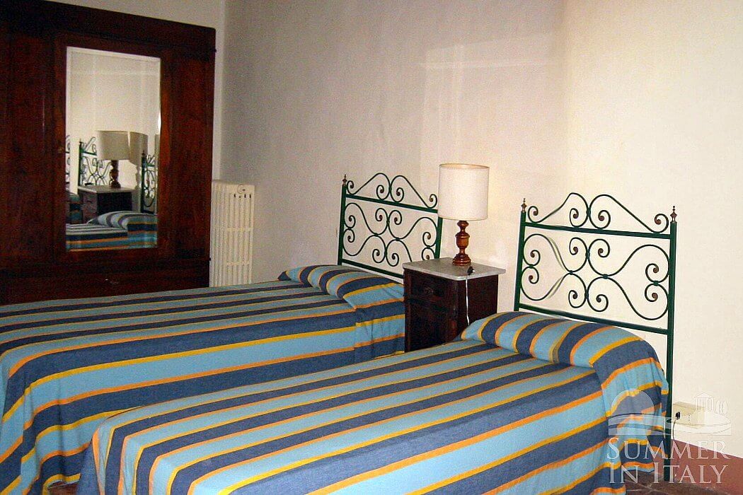 The first bedroom has a matrimonial bed (160 cm/63 inches, wider than a queen-size bed). An additional twin bed (80 cm/32 inches) is available (if requested in advance) to make it a triple room (without exceeding the maximum occupancy of eight guests). The room has a window with a view of the countryside.
