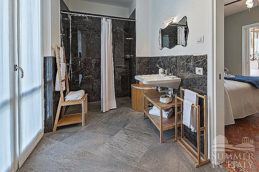 You will be able to enter the sixth bedroom from the living room through an access area. The bedroom has a matrimonial bed (160 cm/63 inches, wider than a queen-size bed), that can be split into twins if requested (please contact our staff in advance to make arrangements). The furnishings include a desk. From the bedroom you will be able to enter a terrace, which is equipped with table and chairs, with a view of the garden through a French door. The bedroom is equipped with an air conditioning unit. This bedroom has an en-suite bathroom, equipped with a washbasin, a toilet, a fully enclosed shower and a hairdryer.